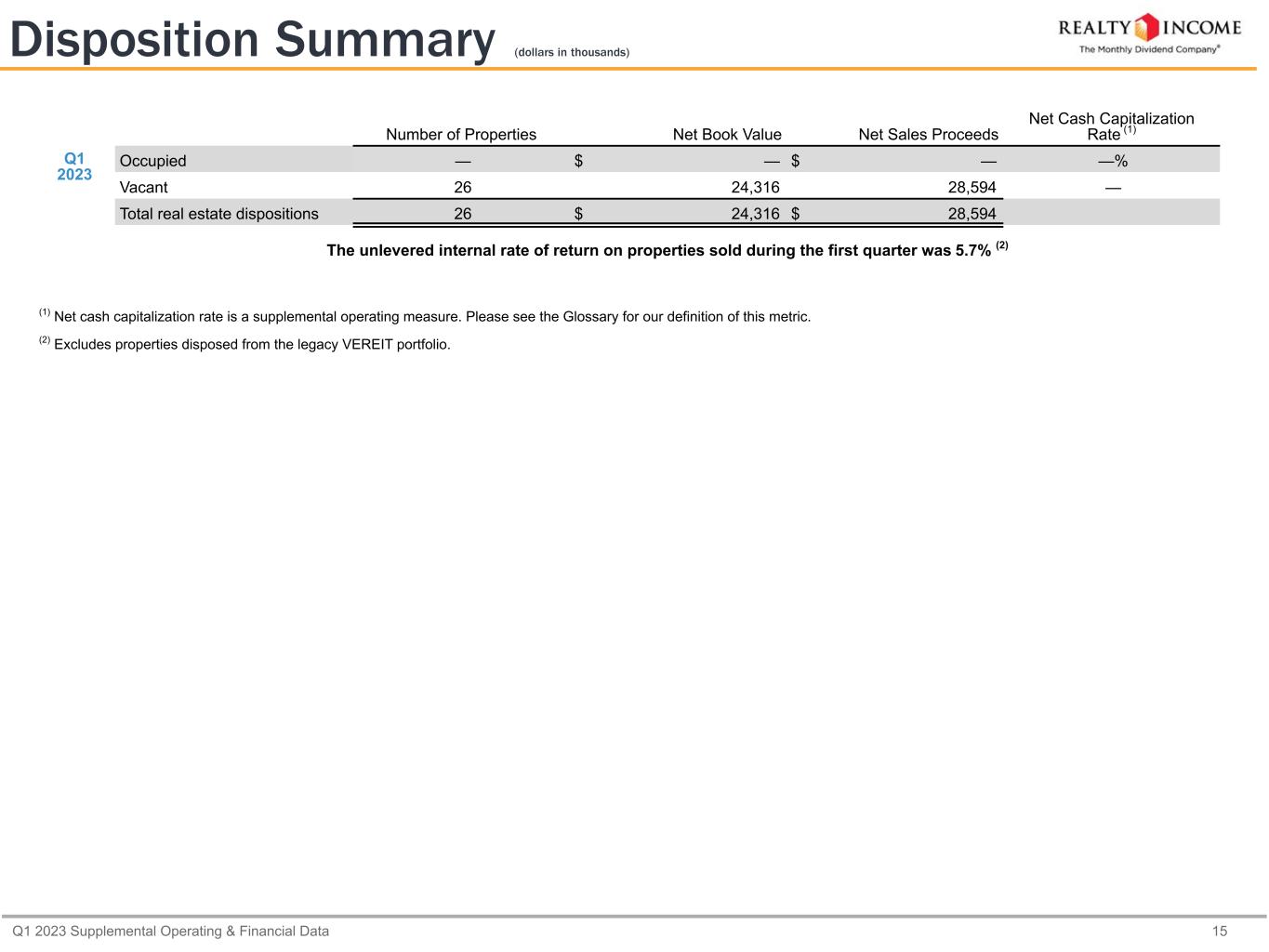 Q1 2023 Supplemental Operating & Financial Data 15 Disposition Summary (dollars in thousands) Number of Properties Net Book Value Net Sales Proceeds Net Cash Capitalization Rate (1) Q1 2023 Occupied — $ — $ — —% Vacant 26 24,316 28,594 — Total real estate dispositions 26 $ 24,316 $ 28,594 The unlevered internal rate of return on properties sold during the first quarter was 5.7% (2) (1) Net cash capitalization rate is a supplemental operating measure. Please see the Glossary for our definition of this metric. (2) Excludes properties disposed from the legacy VEREIT portfolio.
