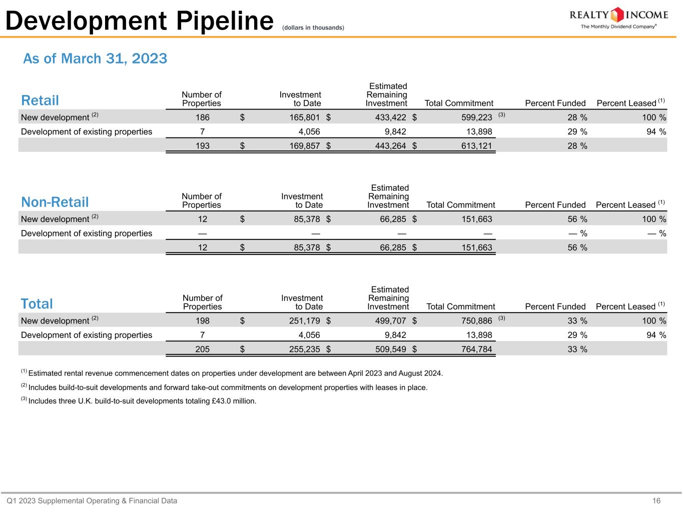 Q1 2023 Supplemental Operating & Financial Data 16 Development Pipeline (dollars in thousands) Retail Number of Properties Investment to Date Estimated Remaining Investment Total Commitment Percent Funded Percent Leased (1) New development (2) 186 $ 165,801 $ 433,422 $ 599,223 (3) 28 % 100 % Development of existing properties 7 4,056 9,842 13,898 29 % 94 % 193 $ 169,857 $ 443,264 $ 613,121 28 % Non-Retail Number of Properties Investment to Date Estimated Remaining Investment Total Commitment Percent Funded Percent Leased (1) New development (2) 12 $ 85,378 $ 66,285 $ 151,663 56 % 100 % Development of existing properties — — — — — % — % 12 $ 85,378 $ 66,285 $ 151,663 56 % Total Number of Properties Investment to Date Estimated Remaining Investment Total Commitment Percent Funded Percent Leased (1) New development (2) 198 $ 251,179 $ 499,707 $ 750,886 (3) 33 % 100 % Development of existing properties 7 4,056 9,842 13,898 29 % 94 % 205 $ 255,235 $ 509,549 $ 764,784 33 % (1) Estimated rental revenue commencement dates on properties under development are between April 2023 and August 2024. (2) Includes build-to-suit developments and forward take-out commitments on development properties with leases in place. (3) Includes three U.K. build-to-suit developments totaling £43.0 million. As of March 31, 2023