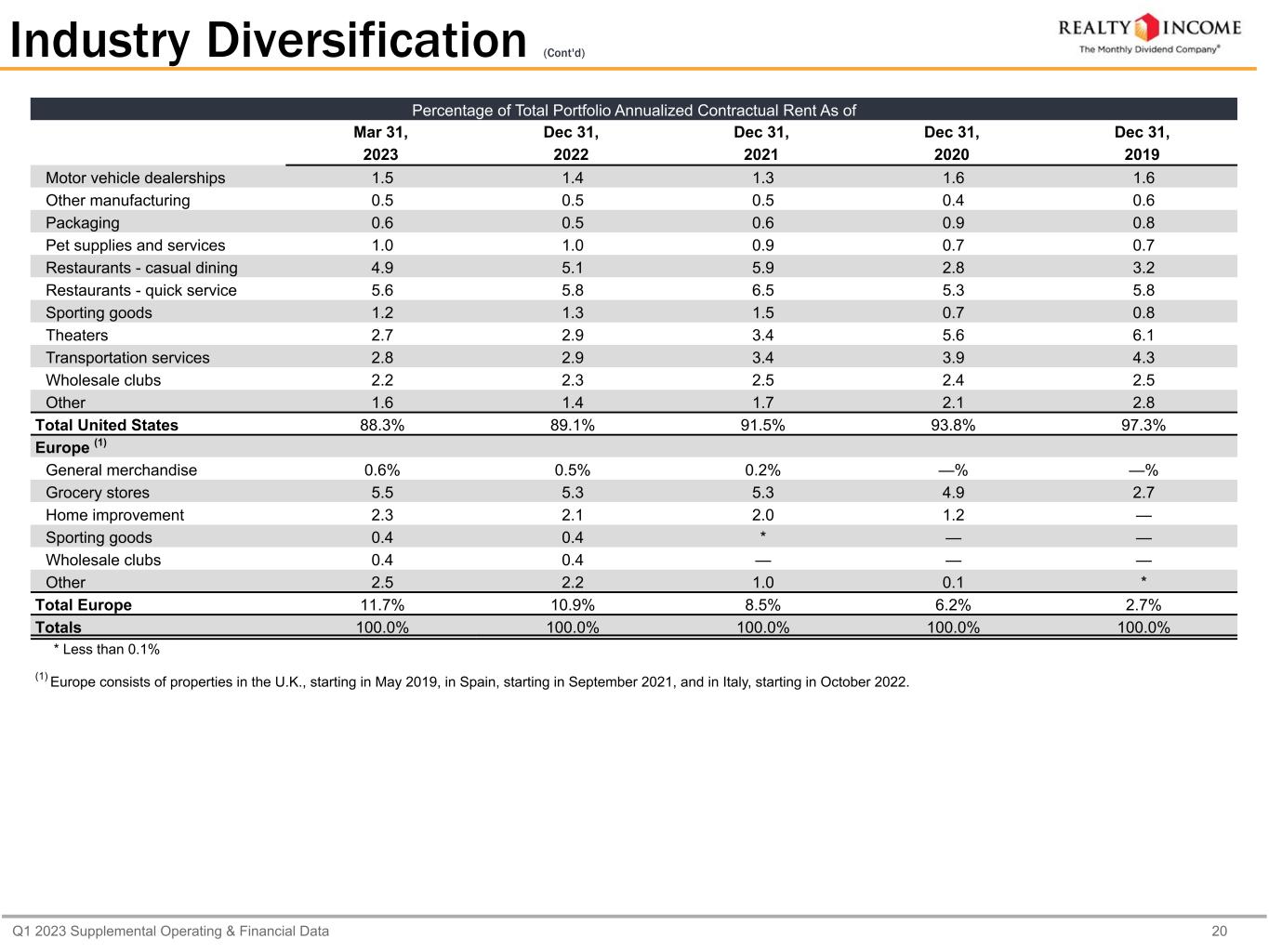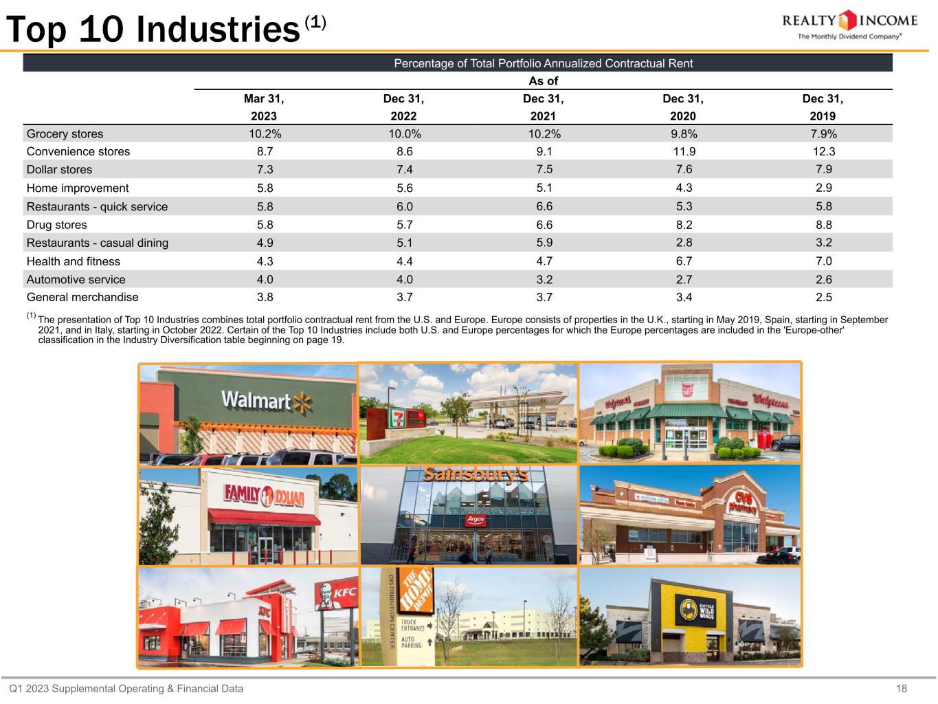 Q1 2023 Supplemental Operating & Financial Data 18 (1)Top 10 Industries Percentage of Total Portfolio Annualized Contractual Rent As of Mar 31, Dec 31, Dec 31, Dec 31, Dec 31, 2023 2022 2021 2020 2019 Grocery stores 10.2% 10.0% 10.2% 9.8% 7.9% Convenience stores 8.7 8.6 9.1 11.9 12.3 Dollar stores 7.3 7.4 7.5 7.6 7.9 Home improvement 5.8 5.6 5.1 4.3 2.9 Restaurants - quick service 5.8 6.0 6.6 5.3 5.8 Drug stores 5.8 5.7 6.6 8.2 8.8 Restaurants - casual dining 4.9 5.1 5.9 2.8 3.2 Health and fitness 4.3 4.4 4.7 6.7 7.0 Automotive service 4.0 4.0 3.2 2.7 2.6 General merchandise 3.8 3.7 3.7 3.4 2.5 (1) The presentation of Top 10 Industries combines total portfolio contractual rent from the U.S. and Europe. Europe consists of properties in the U.K., starting in May 2019, Spain, starting in September 2021, and in Italy, starting in October 2022. Certain of the Top 10 Industries include both U.S. and Europe percentages for which the Europe percentages are included in the 'Europe-other' classification in the Industry Diversification table beginning on page 19.