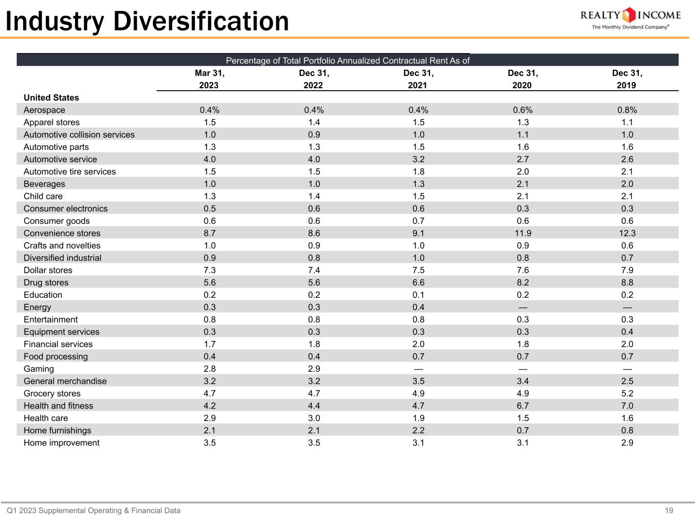 Q1 2023 Supplemental Operating & Financial Data 19 Percentage of Total Portfolio Annualized Contractual Rent As of Mar 31, Dec 31, Dec 31, Dec 31, Dec 31, 2023 2022 2021 2020 2019 United States Aerospace 0.4% 0.4% 0.4% 0.6% 0.8% Apparel stores 1.5 1.4 1.5 1.3 1.1 Automotive collision services 1.0 0.9 1.0 1.1 1.0 Automotive parts 1.3 1.3 1.5 1.6 1.6 Automotive service 4.0 4.0 3.2 2.7 2.6 Automotive tire services 1.5 1.5 1.8 2.0 2.1 Beverages 1.0 1.0 1.3 2.1 2.0 Child care 1.3 1.4 1.5 2.1 2.1 Consumer electronics 0.5 0.6 0.6 0.3 0.3 Consumer goods 0.6 0.6 0.7 0.6 0.6 Convenience stores 8.7 8.6 9.1 11.9 12.3 Crafts and novelties 1.0 0.9 1.0 0.9 0.6 Diversified industrial 0.9 0.8 1.0 0.8 0.7 Dollar stores 7.3 7.4 7.5 7.6 7.9 Drug stores 5.6 5.6 6.6 8.2 8.8 Education 0.2 0.2 0.1 0.2 0.2 Energy 0.3 0.3 0.4 — — Entertainment 0.8 0.8 0.8 0.3 0.3 Equipment services 0.3 0.3 0.3 0.3 0.4 Financial services 1.7 1.8 2.0 1.8 2.0 Food processing 0.4 0.4 0.7 0.7 0.7 Gaming 2.8 2.9 — — — General merchandise 3.2 3.2 3.5 3.4 2.5 Grocery stores 4.7 4.7 4.9 4.9 5.2 Health and fitness 4.2 4.4 4.7 6.7 7.0 Health care 2.9 3.0 1.9 1.5 1.6 Home furnishings 2.1 2.1 2.2 0.7 0.8 Home improvement 3.5 3.5 3.1 3.1 2.9 Industry Diversification