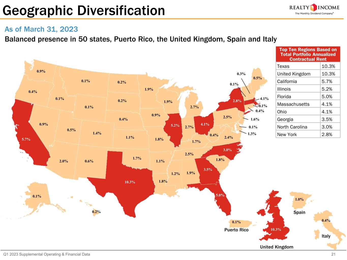 Q1 2023 Supplemental Operating & Financial Data 20 Percentage of Total Portfolio Annualized Contractual Rent As of Mar 31, Dec 31, Dec 31, Dec 31, Dec 31, 2023 2022 2021 2020 2019 Motor vehicle dealerships 1.5 1.4 1.3 1.6 1.6 Other manufacturing 0.5 0.5 0.5 0.4 0.6 Packaging 0.6 0.5 0.6 0.9 0.8 Pet supplies and services 1.0 1.0 0.9 0.7 0.7 Restaurants - casual dining 4.9 5.1 5.9 2.8 3.2 Restaurants - quick service 5.6 5.8 6.5 5.3 5.8 Sporting goods 1.2 1.3 1.5 0.7 0.8 Theaters 2.7 2.9 3.4 5.6 6.1 Transportation services 2.8 2.9 3.4 3.9 4.3 Wholesale clubs 2.2 2.3 2.5 2.4 2.5 Other 1.6 1.4 1.7 2.1 2.8 Total United States 88.3% 89.1% 91.5% 93.8% 97.3% Europe (1) General merchandise 0.6% 0.5% 0.2% —% —% Grocery stores 5.5 5.3 5.3 4.9 2.7 Home improvement 2.3 2.1 2.0 1.2 — Sporting goods 0.4 0.4 * — — Wholesale clubs 0.4 0.4 — — — Other 2.5 2.2 1.0 0.1 * Total Europe 11.7% 10.9% 8.5% 6.2% 2.7% Totals 100.0% 100.0% 100.0% 100.0% 100.0% * Less than 0.1% (1) Europe consists of properties in the U.K., starting in May 2019, in Spain, starting in September 2021, and in Italy, starting in October 2022. Industry Diversification (Cont'd)