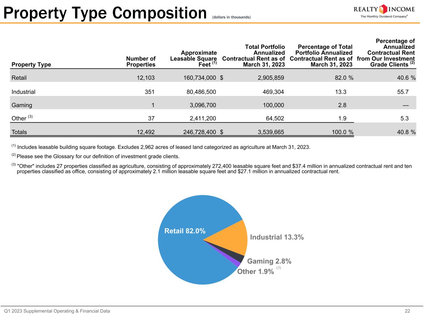 Q1 2023 Supplemental Operating & Financial Data 22 Property Type Composition (dollars in thousands) Property Type Number of Properties Approximate Leasable Square Feet (1) Total Portfolio Annualized Contractual Rent as of March 31, 2023 Percentage of Total Portfolio Annualized Contractual Rent as of March 31, 2023 Percentage of Annualized Contractual Rent from Our Investment Grade Clients (2) Retail 12,103 160,734,000 $ 2,905,859 82.0 % 40.6 % Industrial 351 80,486,500 469,304 13.3 55.7 Gaming 1 3,096,700 100,000 2.8 — Other (3) 37 2,411,200 64,502 1.9 5.3 Totals 12,492 246,728,400 $ 3,539,665 100.0 % 40.8 % (1) Includes leasable building square footage. Excludes 2,962 acres of leased land categorized as agriculture at March 31, 2023. (2) Please see the Glossary for our definition of investment grade clients. (3) "Other" includes 27 properties classified as agriculture, consisting of approximately 272,400 leasable square feet and $37.4 million in annualized contractual rent and ten properties classified as office, consisting of approximately 2.1 million leasable square feet and $27.1 million in annualized contractual rent. Retail 82.0% Industrial 13.3% Gaming 2.8% Other 1.9% (3)