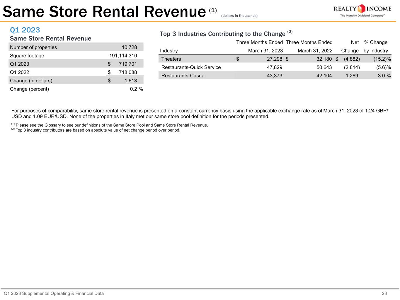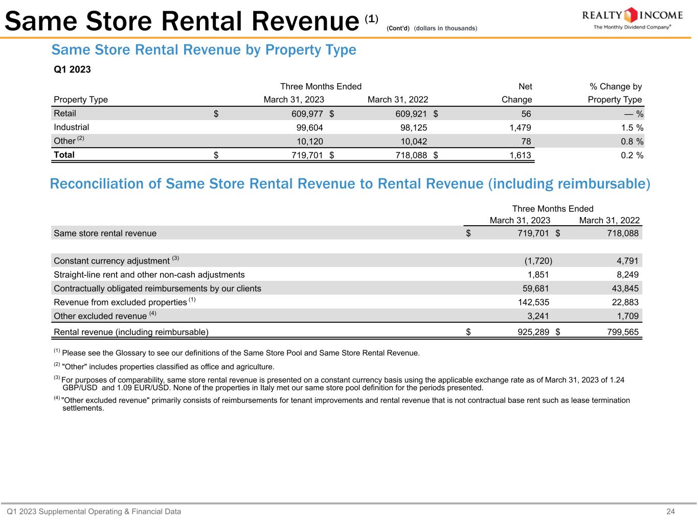 Q1 2023 Supplemental Operating & Financial Data 23 Q1 2023 Same Store Rental Revenue Number of properties 10,728 Square footage 191,114,310 Q1 2023 $ 719,701 Q1 2022 $ 718,088 Change (in dollars) $ 1,613 Change (percent) 0.2 % Same Store Rental Revenue (1) (dollars in thousands) Top 3 Industries Contributing to the Change (2) Three Months Ended Three Months Ended Net % Change Industry March 31, 2023 March 31, 2022 Change by Industry Theaters $ 27,298 $ 32,180 $ (4,882) (15.2) % Restaurants-Quick Service 47,829 50,643 (2,814) (5.6) % Restaurants-Casual 43,373 42,104 1,269 3.0 % For purposes of comparability, same store rental revenue is presented on a constant currency basis using the applicable exchange rate as of March 31, 2023 of 1.24 GBP/ USD and 1.09 EUR/USD. None of the properties in Italy met our same store pool definition for the periods presented. (1) Please see the Glossary to see our definitions of the Same Store Pool and Same Store Rental Revenue. (2) Top 3 industry contributors are based on absolute value of net change period over period.