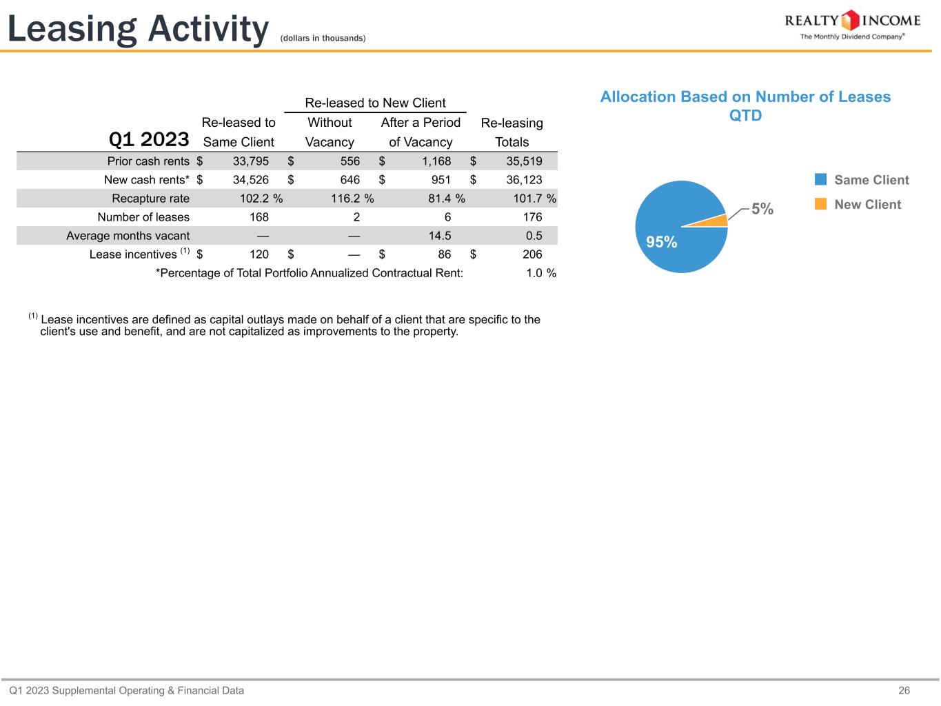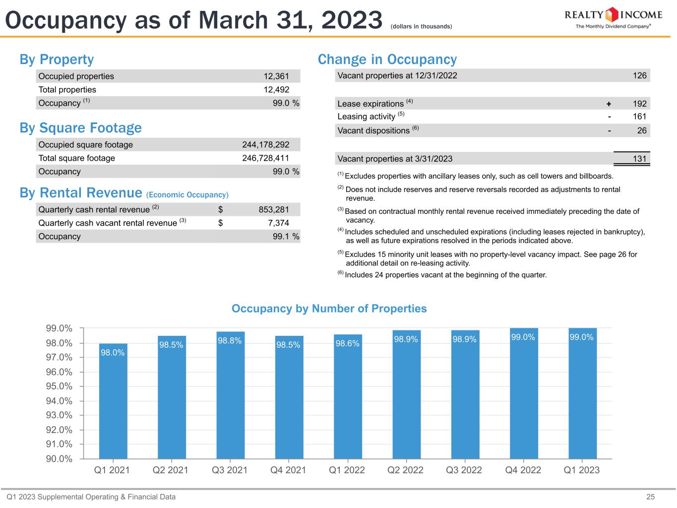 Q1 2023 Supplemental Operating & Financial Data 25 By Property Occupied properties 12,361 Total properties 12,492 Occupancy (1) 99.0 % By Square Footage Occupied square footage 244,178,292 Total square footage 246,728,411 Occupancy 99.0 % By Rental Revenue (Economic Occupancy) Quarterly cash rental revenue (2) $ 853,281 Quarterly cash vacant rental revenue (3) $ 7,374 Occupancy 99.1 % Change in Occupancy Vacant properties at 12/31/2022   126 Lease expirations (4) + 192 Leasing activity (5) - 161 Vacant dispositions (6) - 26 Vacant properties at 3/31/2023   131 (1) Excludes properties with ancillary leases only, such as cell towers and billboards. (2) Does not include reserves and reserve reversals recorded as adjustments to rental revenue. (3) Based on contractual monthly rental revenue received immediately preceding the date of vacancy. (4) Includes scheduled and unscheduled expirations (including leases rejected in bankruptcy), as well as future expirations resolved in the periods indicated above. (5) Excludes 15 minority unit leases with no property-level vacancy impact. See page 26 for additional detail on re-leasing activity. (6) Includes 24 properties vacant at the beginning of the quarter. Occupancy as of March 31, 2023 (dollars in thousands) Occupancy by Number of Properties 98.0% 98.5% 98.8% 98.5% 98.6% 98.9% 98.9% 99.0% 99.0% Q1 2021 Q2 2021 Q3 2021 Q4 2021 Q1 2022 Q2 2022 Q3 2022 Q4 2022 Q1 2023 90.0% 91.0% 92.0% 93.0% 94.0% 95.0% 96.0% 97.0% 98.0% 99.0%
