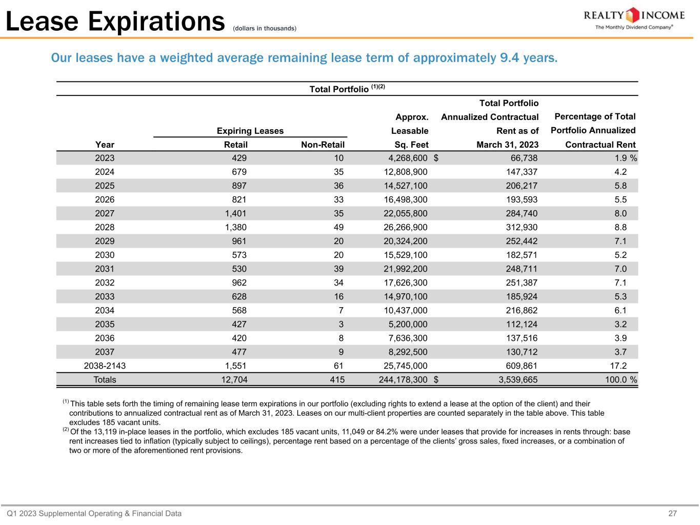 Q1 2023 Supplemental Operating & Financial Data 27 (1) This table sets forth the timing of remaining lease term expirations in our portfolio (excluding rights to extend a lease at the option of the client) and their contributions to annualized contractual rent as of March 31, 2023. Leases on our multi-client properties are counted separately in the table above. This table excludes 185 vacant units. (2) Of the 13,119 in-place leases in the portfolio, which excludes 185 vacant units, 11,049 or 84.2% were under leases that provide for increases in rents through: base rent increases tied to inflation (typically subject to ceilings), percentage rent based on a percentage of the clients’ gross sales, fixed increases, or a combination of two or more of the aforementioned rent provisions. Our leases have a weighted average remaining lease term of approximately 9.4 years. Lease Expirations (dollars in thousands) Total Portfolio (1)(2) Total Portfolio Approx. Annualized Contractual Percentage of Total Expiring Leases Leasable Rent as of Portfolio Annualized Year Retail Non-Retail Sq. Feet March 31, 2023 Contractual Rent 2023 429 10 4,268,600 $ 66,738 1.9 % 2024 679 35 12,808,900 147,337 4.2 2025 897 36 14,527,100 206,217 5.8 2026 821 33 16,498,300 193,593 5.5 2027 1,401 35 22,055,800 284,740 8.0 2028 1,380 49 26,266,900 312,930 8.8 2029 961 20 20,324,200 252,442 7.1 2030 573 20 15,529,100 182,571 5.2 2031 530 39 21,992,200 248,711 7.0 2032 962 34 17,626,300 251,387 7.1 2033 628 16 14,970,100 185,924 5.3 2034 568 7 10,437,000 216,862 6.1 2035 427 3 5,200,000 112,124 3.2 2036 420 8 7,636,300 137,516 3.9 2037 477 9 8,292,500 130,712 3.7 2038-2143 1,551 61 25,745,000 609,861 17.2 Totals 12,704 415 244,178,300 $ 3,539,665 100.0 %