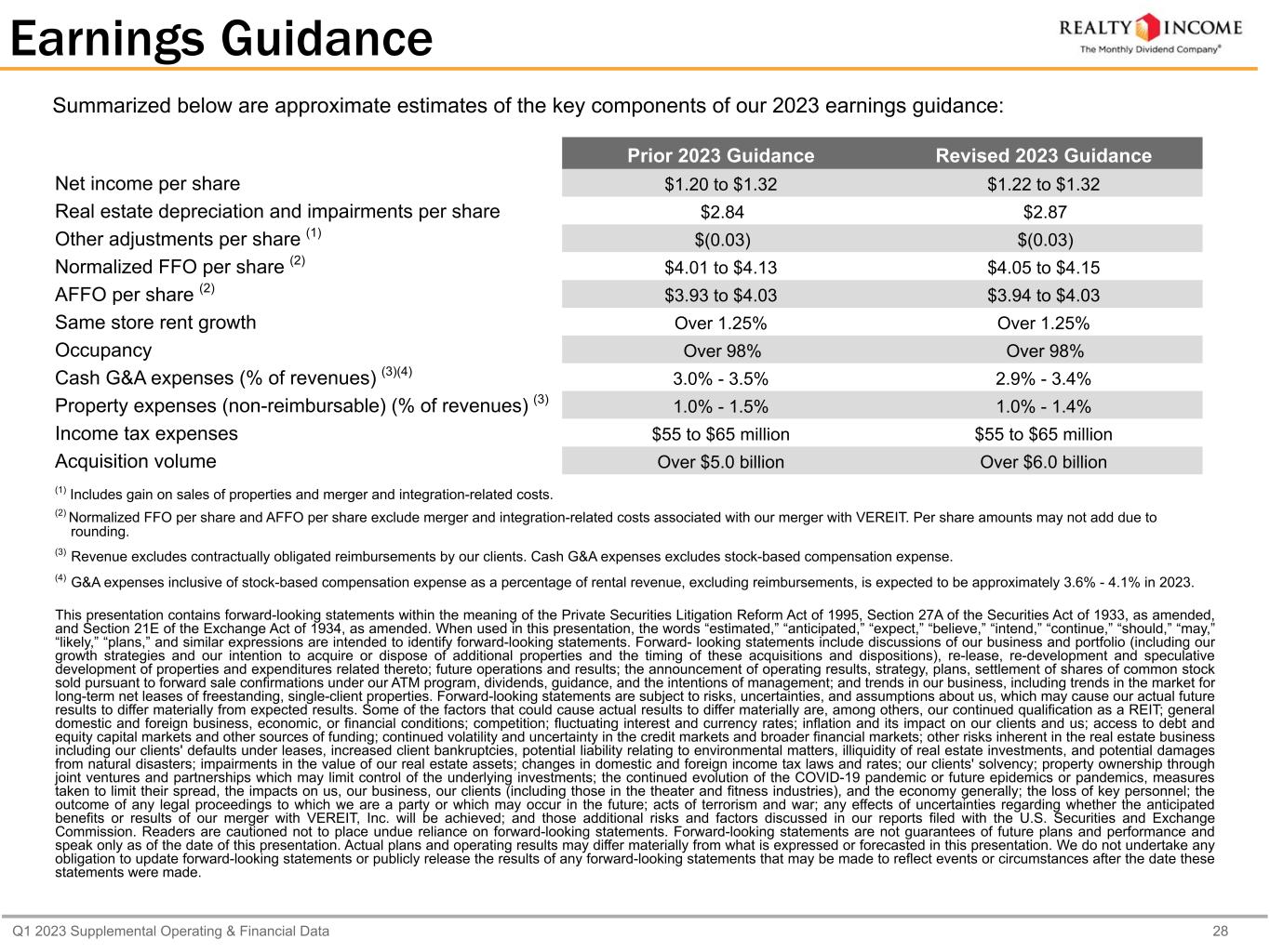 Q1 2023 Supplemental Operating & Financial Data 28 Earnings Guidance Summarized below are approximate estimates of the key components of our 2023 earnings guidance: Prior 2023 Guidance Revised 2023 Guidance Net income per share $1.20 to $1.32 $1.22 to $1.32 Real estate depreciation and impairments per share $2.84 $2.87 Other adjustments per share (1) $(0.03) $(0.03) Normalized FFO per share (2) $4.01 to $4.13 $4.05 to $4.15 AFFO per share (2) $3.93 to $4.03 $3.94 to $4.03 Same store rent growth Over 1.25% Over 1.25% Occupancy Over 98% Over 98% Cash G&A expenses (% of revenues) (3)(4) 3.0% - 3.5% 2.9% - 3.4% Property expenses (non-reimbursable) (% of revenues) (3) 1.0% - 1.5% 1.0% - 1.4% Income tax expenses $55 to $65 million $55 to $65 million Acquisition volume Over $5.0 billion Over $6.0 billion (1) Includes gain on sales of properties and merger and integration-related costs. (2) Normalized FFO per share and AFFO per share exclude merger and integration-related costs associated with our merger with VEREIT. Per share amounts may not add due to rounding. (3) Revenue excludes contractually obligated reimbursements by our clients. Cash G&A expenses excludes stock-based compensation expense. (4) G&A expenses inclusive of stock-based compensation expense as a percentage of rental revenue, excluding reimbursements, is expected to be approximately 3.6% - 4.1% in 2023. This presentation contains forward-looking statements within the meaning of the Private Securities Litigation Reform Act of 1995, Section 27A of the Securities Act of 1933, as amended, and Section 21E of the Exchange Act of 1934, as amended. When used in this presentation, the words “estimated,” “anticipated,” “expect,” “believe,” “intend,” “continue,” “should,” “may,” “likely,” “plans,” and similar expressions are intended to identify forward-looking statements. Forward- looking statements include discussions of our business and portfolio (including our growth strategies and our intention to acquire or dispose of additional properties and the timing of these acquisitions and dispositions), re-lease, re-development and speculative development of properties and expenditures related thereto; future operations and results; the announcement of operating results, strategy, plans, settlement of shares of common stock sold pursuant to forward sale confirmations under our ATM program, dividends, guidance, and the intentions of management; and trends in our business, including trends in the market for long-term net leases of freestanding, single-client properties. Forward-looking statements are subject to risks, uncertainties, and assumptions about us, which may cause our actual future results to differ materially from expected results. Some of the factors that could cause actual results to differ materially are, among others, our continued qualification as a REIT; general domestic and foreign business, economic, or financial conditions; competition; fluctuating interest and currency rates; inflation and its impact on our clients and us; access to debt and equity capital markets and other sources of funding; continued volatility and uncertainty in the credit markets and broader financial markets; other risks inherent in the real estate business including our clients' defaults under leases, increased client bankruptcies, potential liability relating to environmental matters, illiquidity of real estate investments, and potential damages from natural disasters; impairments in the value of our real estate assets; changes in domestic and foreign income tax laws and rates; our clients' solvency; property ownership through joint ventures and partnerships which may limit control of the underlying investments; the continued evolution of the COVID-19 pandemic or future epidemics or pandemics, measures taken to limit their spread, the impacts on us, our business, our clients (including those in the theater and fitness industries), and the economy generally; the loss of key personnel; the outcome of any legal proceedings to which we are a party or which may occur in the future; acts of terrorism and war; any effects of uncertainties regarding whether the anticipated benefits or results of our merger with VEREIT, Inc. will be achieved; and those additional risks and factors discussed in our reports filed with the U.S. Securities and Exchange Commission. Readers are cautioned not to place undue reliance on forward-looking statements. Forward-looking statements are not guarantees of future plans and performance and speak only as of the date of this presentation. Actual plans and operating results may differ materially from what is expressed or forecasted in this presentation. We do not undertake any obligation to update forward-looking statements or publicly release the results of any forward-looking statements that may be made to reflect events or circumstances after the date these statements were made.