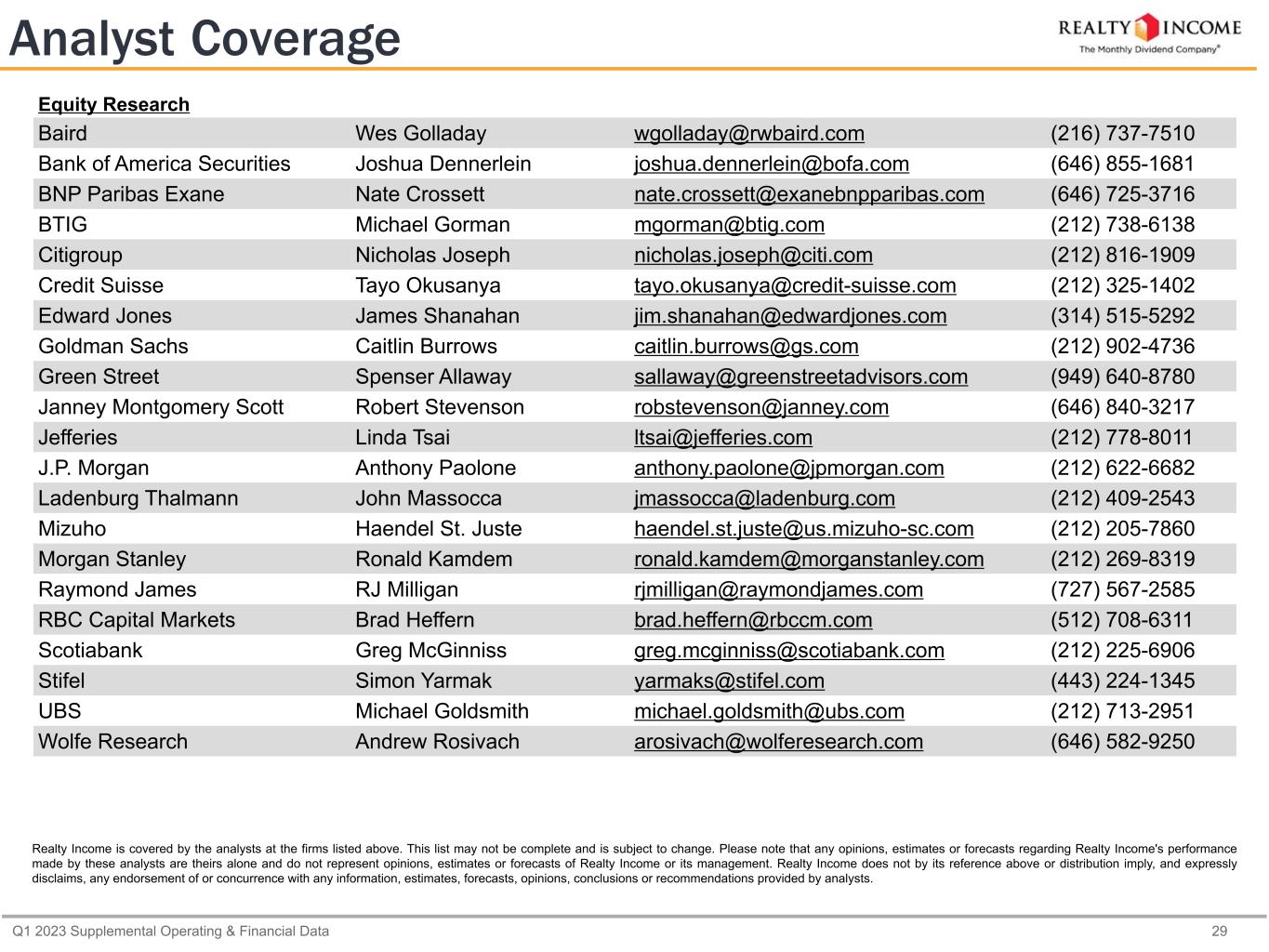 Q1 2023 Supplemental Operating & Financial Data 29 Analyst Coverage Equity Research Baird Wes Golladay wgolladay@rwbaird.com (216) 737-7510 Bank of America Securities Joshua Dennerlein joshua.dennerlein@bofa.com (646) 855-1681 BNP Paribas Exane Nate Crossett nate.crossett@exanebnpparibas.com (646) 725-3716 BTIG Michael Gorman mgorman@btig.com (212) 738-6138 Citigroup Nicholas Joseph nicholas.joseph@citi.com (212) 816-1909 Credit Suisse Tayo Okusanya tayo.okusanya@credit-suisse.com (212) 325-1402 Edward Jones James Shanahan jim.shanahan@edwardjones.com (314) 515-5292 Goldman Sachs Caitlin Burrows caitlin.burrows@gs.com (212) 902-4736 Green Street Spenser Allaway sallaway@greenstreetadvisors.com (949) 640-8780 Janney Montgomery Scott Robert Stevenson robstevenson@janney.com (646) 840-3217 Jefferies Linda Tsai ltsai@jefferies.com (212) 778-8011 J.P. Morgan Anthony Paolone anthony.paolone@jpmorgan.com (212) 622-6682 Ladenburg Thalmann John Massocca jmassocca@ladenburg.com (212) 409-2543 Mizuho Haendel St. Juste haendel.st.juste@us.mizuho-sc.com (212) 205-7860 Morgan Stanley Ronald Kamdem ronald.kamdem@morganstanley.com (212) 269-8319 Raymond James RJ Milligan rjmilligan@raymondjames.com (727) 567-2585 RBC Capital Markets Brad Heffern brad.heffern@rbccm.com (512) 708-6311 Scotiabank Greg McGinniss greg.mcginniss@scotiabank.com (212) 225-6906 Stifel Simon Yarmak yarmaks@stifel.com (443) 224-1345 UBS Michael Goldsmith michael.goldsmith@ubs.com (212) 713-2951 Wolfe Research Andrew Rosivach arosivach@wolferesearch.com (646) 582-9250 Realty Income is covered by the analysts at the firms listed above. This list may not be complete and is subject to change. Please note that any opinions, estimates or forecasts regarding Realty Income's performance made by these analysts are theirs alone and do not represent opinions, estimates or forecasts of Realty Income or its management. Realty Income does not by its reference above or distribution imply, and expressly disclaims, any endorsement of or concurrence with any information, estimates, forecasts, opinions, conclusions or recommendations provided by analysts.