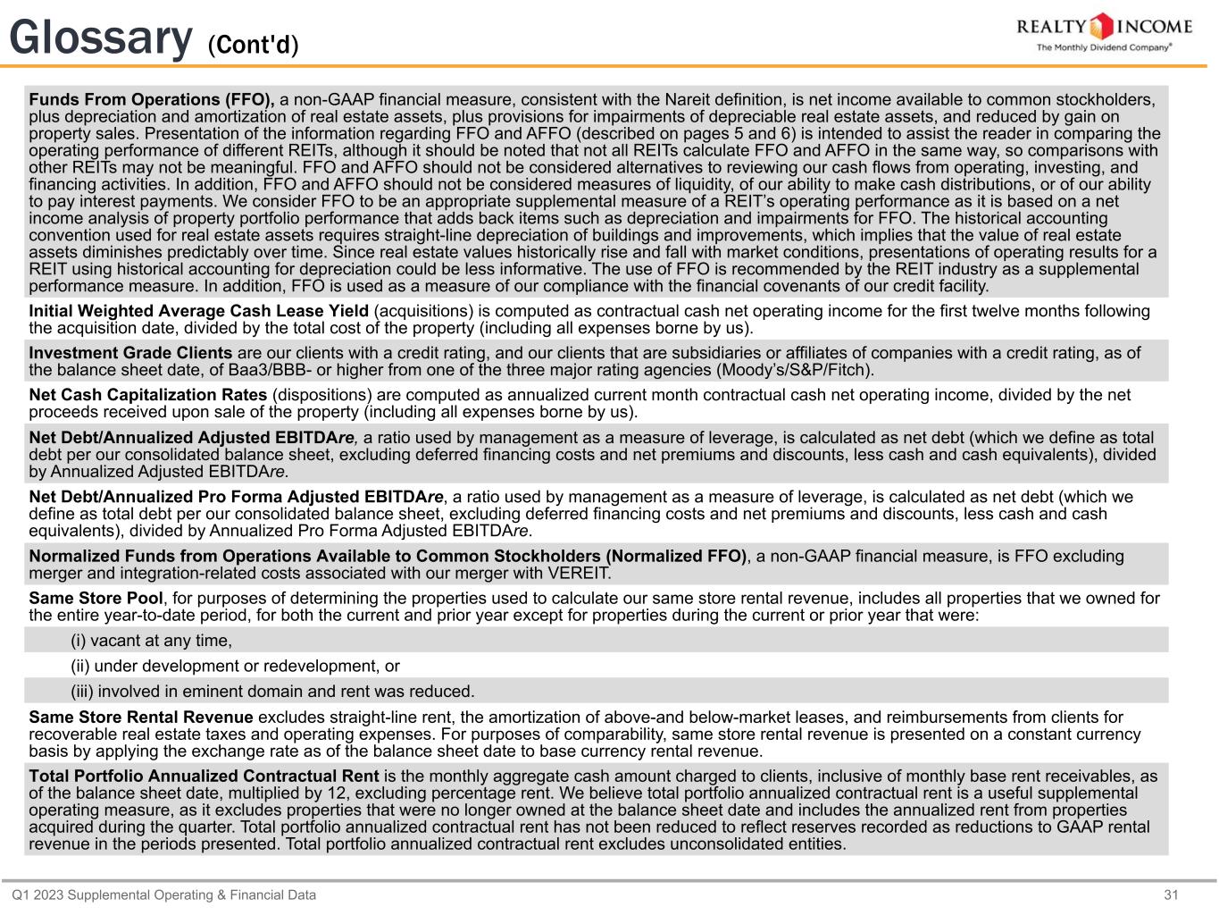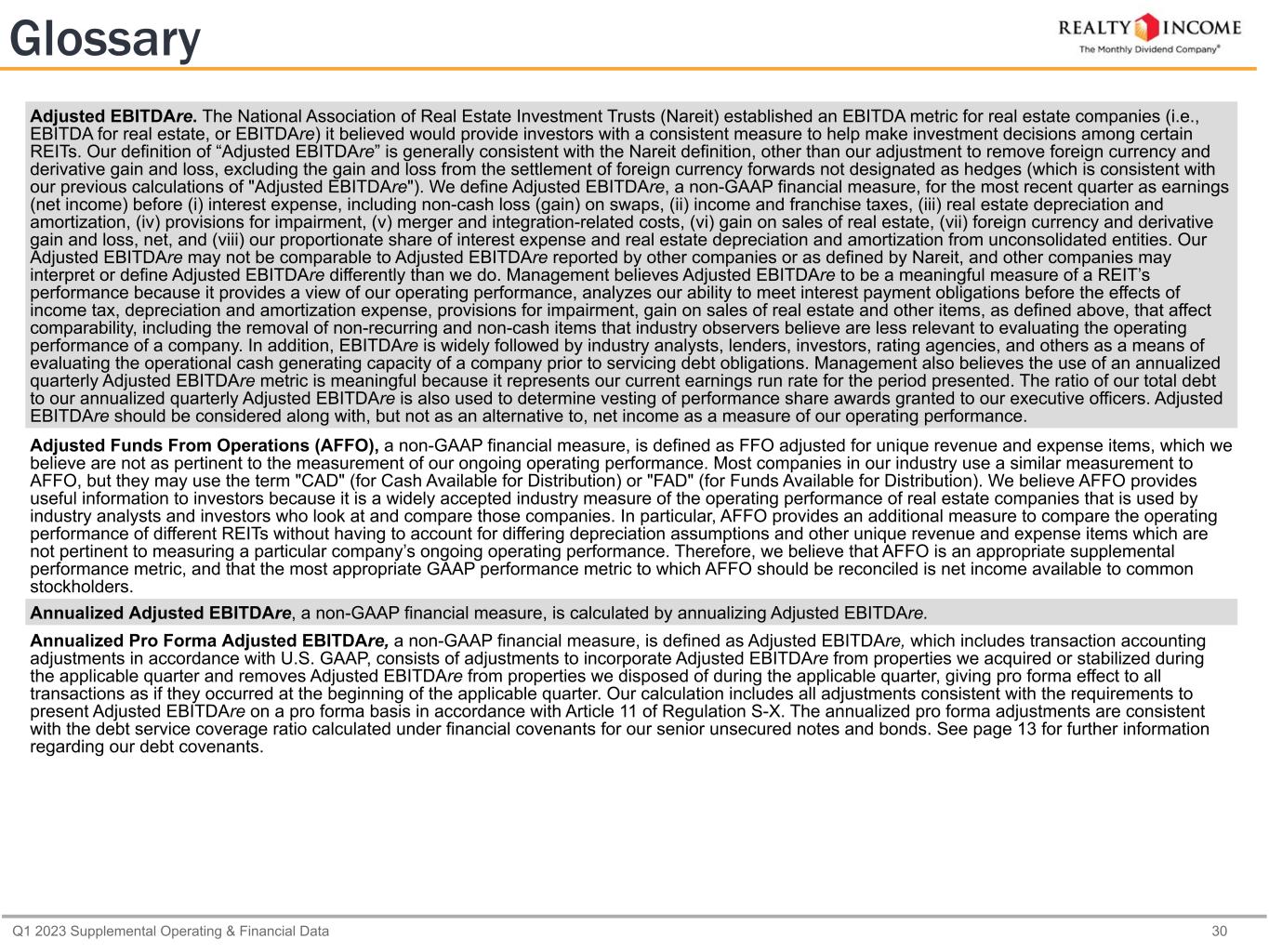 Q1 2023 Supplemental Operating & Financial Data 30 Glossary Adjusted EBITDAre. The National Association of Real Estate Investment Trusts (Nareit) established an EBITDA metric for real estate companies (i.e., EBITDA for real estate, or EBITDAre) it believed would provide investors with a consistent measure to help make investment decisions among certain REITs. Our definition of “Adjusted EBITDAre” is generally consistent with the Nareit definition, other than our adjustment to remove foreign currency and derivative gain and loss, excluding the gain and loss from the settlement of foreign currency forwards not designated as hedges (which is consistent with our previous calculations of "Adjusted EBITDAre"). We define Adjusted EBITDAre, a non-GAAP financial measure, for the most recent quarter as earnings (net income) before (i) interest expense, including non-cash loss (gain) on swaps, (ii) income and franchise taxes, (iii) real estate depreciation and amortization, (iv) provisions for impairment, (v) merger and integration-related costs, (vi) gain on sales of real estate, (vii) foreign currency and derivative gain and loss, net, and (viii) our proportionate share of interest expense and real estate depreciation and amortization from unconsolidated entities. Our Adjusted EBITDAre may not be comparable to Adjusted EBITDAre reported by other companies or as defined by Nareit, and other companies may interpret or define Adjusted EBITDAre differently than we do. Management believes Adjusted EBITDAre to be a meaningful measure of a REIT’s performance because it provides a view of our operating performance, analyzes our ability to meet interest payment obligations before the effects of income tax, depreciation and amortization expense, provisions for impairment, gain on sales of real estate and other items, as defined above, that affect comparability, including the removal of non-recurring and non-cash items that industry observers believe are less relevant to evaluating the operating performance of a company. In addition, EBITDAre is widely followed by industry analysts, lenders, investors, rating agencies, and others as a means of evaluating the operational cash generating capacity of a company prior to servicing debt obligations. Management also believes the use of an annualized quarterly Adjusted EBITDAre metric is meaningful because it represents our current earnings run rate for the period presented. The ratio of our total debt to our annualized quarterly Adjusted EBITDAre is also used to determine vesting of performance share awards granted to our executive officers. Adjusted EBITDAre should be considered along with, but not as an alternative to, net income as a measure of our operating performance. Adjusted Funds From Operations (AFFO), a non-GAAP financial measure, is defined as FFO adjusted for unique revenue and expense items, which we believe are not as pertinent to the measurement of our ongoing operating performance. Most companies in our industry use a similar measurement to AFFO, but they may use the term "CAD" (for Cash Available for Distribution) or "FAD" (for Funds Available for Distribution). We believe AFFO provides useful information to investors because it is a widely accepted industry measure of the operating performance of real estate companies that is used by industry analysts and investors who look at and compare those companies. In particular, AFFO provides an additional measure to compare the operating performance of different REITs without having to account for differing depreciation assumptions and other unique revenue and expense items which are not pertinent to measuring a particular company’s ongoing operating performance. Therefore, we believe that AFFO is an appropriate supplemental performance metric, and that the most appropriate GAAP performance metric to which AFFO should be reconciled is net income available to common stockholders. Annualized Adjusted EBITDAre, a non-GAAP financial measure, is calculated by annualizing Adjusted EBITDAre. Annualized Pro Forma Adjusted EBITDAre, a non-GAAP financial measure, is defined as Adjusted EBITDAre, which includes transaction accounting adjustments in accordance with U.S. GAAP, consists of adjustments to incorporate Adjusted EBITDAre from properties we acquired or stabilized during the applicable quarter and removes Adjusted EBITDAre from properties we disposed of during the applicable quarter, giving pro forma effect to all transactions as if they occurred at the beginning of the applicable quarter. Our calculation includes all adjustments consistent with the requirements to present Adjusted EBITDAre on a pro forma basis in accordance with Article 11 of Regulation S-X. The annualized pro forma adjustments are consistent with the debt service coverage ratio calculated under financial covenants for our senior unsecured notes and bonds. See page 13 for further information regarding our debt covenants.