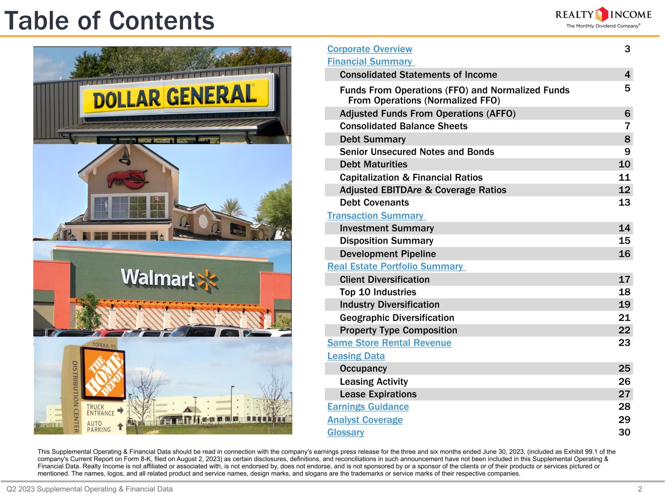 Q2 2023 Supplemental Operating & Financial Data 2 Table of Contents Corporate Overview 3 Financial Summary Consolidated Statements of Income 4 Funds From Operations (FFO) and Normalized Funds From Operations (Normalized FFO) 5 Adjusted Funds From Operations (AFFO) 6 Consolidated Balance Sheets 7 Debt Summary 8 Senior Unsecured Notes and Bonds 9 Debt Maturities 10 Capitalization & Financial Ratios 11 Adjusted EBITDAre & Coverage Ratios 12 Debt Covenants 13 Transaction Summary Investment Summary 14 Disposition Summary 15 Development Pipeline 16 Real Estate Portfolio Summary Client Diversification 17 Top 10 Industries 18 Industry Diversification 19 Geographic Diversification 21 Property Type Composition 22 Same Store Rental Revenue 23 Leasing Data Occupancy 25 Leasing Activity 26 Lease Expirations 27 Earnings Guidance 28 Analyst Coverage 29 Glossary 30 This Supplemental Operating & Financial Data should be read in connection with the company's earnings press release for the three and six months ended June 30, 2023, (included as Exhibit 99.1 of the company's Current Report on Form 8-K, filed on August 2, 2023) as certain disclosures, definitions, and reconciliations in such announcement have not been included in this Supplemental Operating & Financial Data. Realty Income is not affiliated or associated with, is not endorsed by, does not endorse, and is not sponsored by or a sponsor of the clients or of their products or services pictured or mentioned. The names, logos, and all related product and service names, design marks, and slogans are the trademarks or service marks of their respective companies.