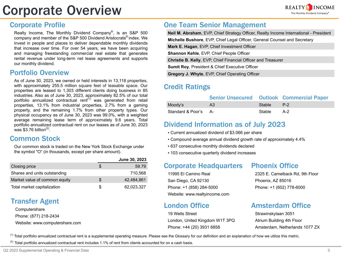 Q2 2023 Supplemental Operating & Financial Data 3 One Team Senior Management Neil M. Abraham, EVP, Chief Strategy Officer, Realty Income International - President Michelle Bushore, EVP, Chief Legal Officer, General Counsel and Secretary Mark E. Hagan, EVP, Chief Investment Officer Shannon Kehle, EVP, Chief People Officer Christie B. Kelly, EVP, Chief Financial Officer and Treasurer Sumit Roy, President & Chief Executive Officer Gregory J. Whyte, EVP, Chief Operating Officer Credit Ratings Senior Unsecured Outlook Commercial Paper Moody’s A3 Stable P-2 Standard & Poor’s A- Stable A-2 Dividend Information as of July 2023 ▪ Current annualized dividend of $3.066 per share ▪ Compound average annual dividend growth rate of approximately 4.4% ▪ 637 consecutive monthly dividends declared ▪ 103 consecutive quarterly dividend increases Corporate Headquarters Phoenix Office 11995 El Camino Real 2325 E. Camelback Rd, 9th Floor San Diego, CA 92130 Phoenix, AZ 85016 Phone: +1 (858) 284-5000 Phone: +1 (602) 778-6000 Website: www.realtyincome.com London Office Amsterdam Office 19 Wells Street Strawinskylaan 3051 London, United Kingdom W1T 3PQ Atrium Building 4th Floor Phone: +44 (20) 3931 6858 Amsterdam, Netherlands 1077 ZX Corporate Overview Transfer Agent Computershare Phone: (877) 218-2434 Website: www.computershare.com (1) Total portfolio annualized contractual rent is a supplemental operating measure. Please see the Glossary for our definition and an explanation of how we utilize this metric. (2) Total portfolio annualized contractual rent includes 1.1% of rent from clients accounted for on a cash basis. June 30, 2023 Closing price $ 59.79 Shares and units outstanding 710,568 Market value of common equity $ 42,484,861 Total market capitalization $ 62,023,327 Corporate Profile Realty Income, The Monthly Dividend Company®, is an S&P 500 company and member of the S&P 500 Dividend Aristocrats® index. We invest in people and places to deliver dependable monthly dividends that increase over time. For over 54 years, we have been acquiring and managing freestanding commercial real estate that generates rental revenue under long-term net lease agreements and supports our monthly dividend. Portfolio Overview As of June 30, 2023, we owned or held interests in 13,118 properties, with approximately 255.5 million square feet of leasable space. Our properties are leased to 1,303 different clients doing business in 85 industries. Also as of June 30, 2023, approximately 82.5% of our total portfolio annualized contractual rent(1) was generated from retail properties, 13.1% from industrial properties, 2.7% from a gaming property, and the remaining 1.7% from other property types. Our physical occupancy as of June 30, 2023 was 99.0%, with a weighted average remaining lease term of approximately 9.6 years. Total portfolio annualized contractual rent on our leases as of June 30, 2023 was $3.76 billion(2). Common Stock Our common stock is traded on the New York Stock Exchange under the symbol "O“ (in thousands, except per share amount).