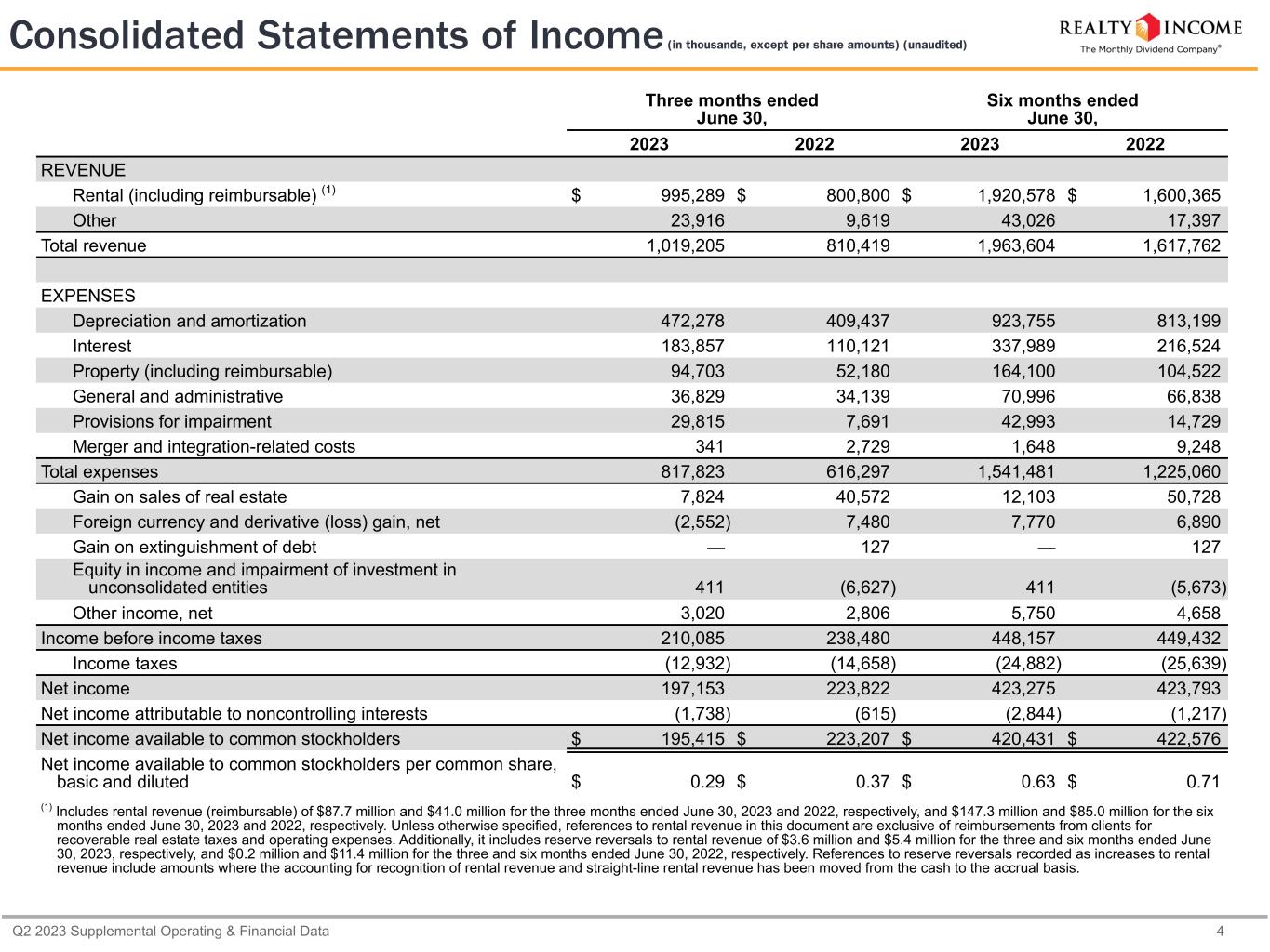 Q2 2023 Supplemental Operating & Financial Data 4 Three months ended June 30, Six months ended June 30, 2023 2022 2023 2022 REVENUE Rental (including reimbursable) (1) $ 995,289 $ 800,800 $ 1,920,578 $ 1,600,365 Other 23,916 9,619 43,026 17,397 Total revenue 1,019,205 810,419 1,963,604 1,617,762 EXPENSES Depreciation and amortization 472,278 409,437 923,755 813,199 Interest 183,857 110,121 337,989 216,524 Property (including reimbursable) 94,703 52,180 164,100 104,522 General and administrative 36,829 34,139 70,996 66,838 Provisions for impairment 29,815 7,691 42,993 14,729 Merger and integration-related costs 341 2,729 1,648 9,248 Total expenses 817,823 616,297 1,541,481 1,225,060 Gain on sales of real estate 7,824 40,572 12,103 50,728 Foreign currency and derivative (loss) gain, net (2,552) 7,480 7,770 6,890 Gain on extinguishment of debt — 127 — 127 Equity in income and impairment of investment in unconsolidated entities 411 (6,627) 411 (5,673) Other income, net 3,020 2,806 5,750 4,658 Income before income taxes 210,085 238,480 448,157 449,432 Income taxes (12,932) (14,658) (24,882) (25,639) Net income 197,153 223,822 423,275 423,793 Net income attributable to noncontrolling interests (1,738) (615) (2,844) (1,217) Net income available to common stockholders $ 195,415 $ 223,207 $ 420,431 $ 422,576 Net income available to common stockholders per common share, basic and diluted $ 0.29 $ 0.37 $ 0.63 $ 0.71 (1) Includes rental revenue (reimbursable) of $87.7 million and $41.0 million for the three months ended June 30, 2023 and 2022, respectively, and $147.3 million and $85.0 million for the six months ended June 30, 2023 and 2022, respectively. Unless otherwise specified, references to rental revenue in this document are exclusive of reimbursements from clients for recoverable real estate taxes and operating expenses. Additionally, it includes reserve reversals to rental revenue of $3.6 million and $5.4 million for the three and six months ended June 30, 2023, respectively, and $0.2 million and $11.4 million for the three and six months ended June 30, 2022, respectively. References to reserve reversals recorded as increases to rental revenue include amounts where the accounting for recognition of rental revenue and straight-line rental revenue has been moved from the cash to the accrual basis. Consolidated Statements of Income (in thousands, except per share amounts) (unaudited)