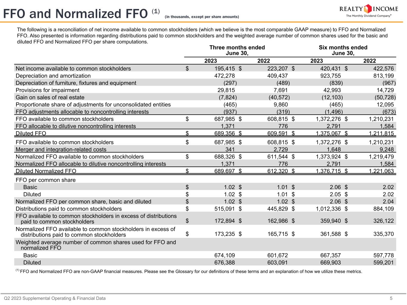 Q2 2023 Supplemental Operating & Financial Data 5 FFO and Normalized FFO (1) (in thousands, except per share amounts) The following is a reconciliation of net income available to common stockholders (which we believe is the most comparable GAAP measure) to FFO and Normalized FFO. Also presented is information regarding distributions paid to common stockholders and the weighted average number of common shares used for the basic and diluted FFO and Normalized FFO per share computations. Three months ended June 30, Six months ended June 30, 2023 2022 2023 2022 Net income available to common stockholders $ 195,415 $ 223,207 $ 420,431 $ 422,576 Depreciation and amortization 472,278 409,437 923,755 813,199 Depreciation of furniture, fixtures and equipment (297) (489) (839) (967) Provisions for impairment 29,815 7,691 42,993 14,729 Gain on sales of real estate (7,824) (40,572) (12,103) (50,728) Proportionate share of adjustments for unconsolidated entities (465) 9,860 (465) 12,095 FFO adjustments allocable to noncontrolling interests (937) (319) (1,496) (673) FFO available to common stockholders $ 687,985 $ 608,815 $ 1,372,276 $ 1,210,231 FFO allocable to dilutive noncontrolling interests 1,371 776 2,791 1,584 Diluted FFO $ 689,356 $ 609,591 $ 1,375,067 $ 1,211,815 FFO available to common stockholders $ 687,985 $ 608,815 $ 1,372,276 $ 1,210,231 Merger and integration-related costs 341 2,729 1,648 9,248 Normalized FFO available to common stockholders $ 688,326 $ 611,544 $ 1,373,924 $ 1,219,479 Normalized FFO allocable to dilutive noncontrolling interests 1,371 776 2,791 1,584 Diluted Normalized FFO $ 689,697 $ 612,320 $ 1,376,715 $ 1,221,063 FFO per common share Basic $ 1.02 $ 1.01 $ 2.06 $ 2.02 Diluted $ 1.02 $ 1.01 $ 2.05 $ 2.02 Normalized FFO per common share, basic and diluted $ 1.02 $ 1.02 $ 2.06 $ 2.04 Distributions paid to common stockholders $ 515,091 $ 445,829 $ 1,012,336 $ 884,109 FFO available to common stockholders in excess of distributions paid to common stockholders $ 172,894 $ 162,986 $ 359,940 $ 326,122 Normalized FFO available to common stockholders in excess of distributions paid to common stockholders $ 173,235 $ 165,715 $ 361,588 $ 335,370 Weighted average number of common shares used for FFO and normalized FFO Basic 674,109 601,672 667,357 597,778 Diluted 676,388 603,091 669,903 599,201 (1) FFO and Normalized FFO are non-GAAP financial measures. Please see the Glossary for our definitions of these terms and an explanation of how we utilize these metrics.
