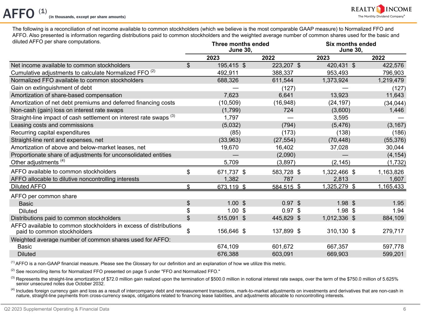 Q2 2023 Supplemental Operating & Financial Data 6 The following is a reconciliation of net income available to common stockholders (which we believe is the most comparable GAAP measure) to Normalized FFO and AFFO. Also presented is information regarding distributions paid to common stockholders and the weighted average number of common shares used for the basic and diluted AFFO per share computations. Three months ended June 30, Six months ended June 30, 2023 2022 2023 2022 Net income available to common stockholders $ 195,415 $ 223,207 $ 420,431 $ 422,576 Cumulative adjustments to calculate Normalized FFO (2) 492,911 388,337 953,493 796,903 Normalized FFO available to common stockholders 688,326 611,544 1,373,924 1,219,479 Gain on extinguishment of debt — (127) — (127) Amortization of share-based compensation 7,623 6,641 13,923 11,643 Amortization of net debt premiums and deferred financing costs (10,509) (16,948) (24,197) (34,044) Non-cash (gain) loss on interest rate swaps (1,799) 724 (3,600) 1,446 Straight-line impact of cash settlement on interest rate swaps (3) 1,797 — 3,595 — Leasing costs and commissions (5,032) (794) (5,476) (3,167) Recurring capital expenditures (85) (173) (138) (186) Straight-line rent and expenses, net (33,963) (27,554) (70,448) (55,376) Amortization of above and below-market leases, net 19,670 16,402 37,028 30,044 Proportionate share of adjustments for unconsolidated entities — (2,090) — (4,154) Other adjustments (4) 5,709 (3,897) (2,145) (1,732) AFFO available to common stockholders $ 671,737 $ 583,728 $ 1,322,466 $ 1,163,826 AFFO allocable to dilutive noncontrolling interests 1,382 787 2,813 1,607 Diluted AFFO $ 673,119 $ 584,515 $ 1,325,279 $ 1,165,433 AFFO per common share Basic $ 1.00 $ 0.97 $ 1.98 $ 1.95 Diluted $ 1.00 $ 0.97 $ 1.98 $ 1.94 Distributions paid to common stockholders $ 515,091 $ 445,829 $ 1,012,336 $ 884,109 AFFO available to common stockholders in excess of distributions paid to common stockholders $ 156,646 $ 137,899 $ 310,130 $ 279,717 Weighted average number of common shares used for AFFO: Basic 674,109 601,672 667,357 597,778 Diluted 676,388 603,091 669,903 599,201 (1) AFFO is a non-GAAP financial measure. Please see the Glossary for our definition and an explanation of how we utilize this metric. (2) See reconciling items for Normalized FFO presented on page 5 under "FFO and Normalized FFO." (3) Represents the straight-line amortization of $72.0 million gain realized upon the termination of $500.0 million in notional interest rate swaps, over the term of the $750.0 million of 5.625% senior unsecured notes due October 2032. (4) Includes foreign currency gain and loss as a result of intercompany debt and remeasurement transactions, mark-to-market adjustments on investments and derivatives that are non-cash in nature, straight-line payments from cross-currency swaps, obligations related to financing lease liabilities, and adjustments allocable to noncontrolling interests. AFFO (1) (in thousands, except per share amounts)