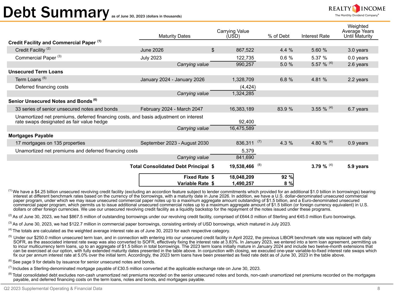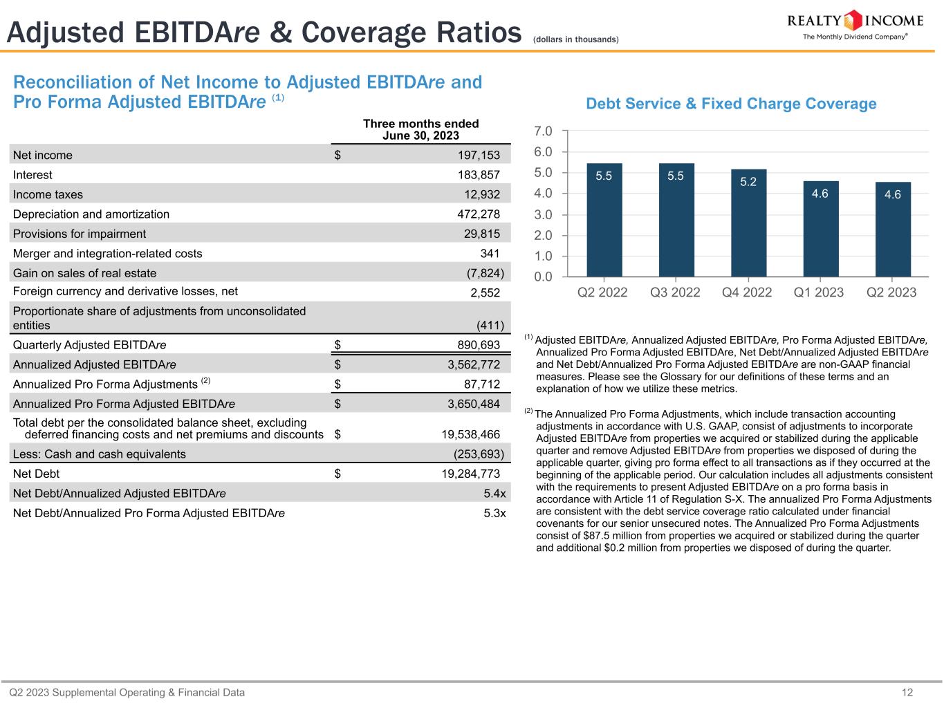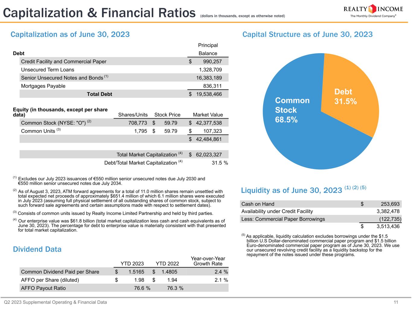 Q2 2023 Supplemental Operating & Financial Data 11 Capitalization & Financial Ratios (dollars in thousands, except as otherwise noted) Cash on Hand $ 253,693 Availability under Credit Facility 3,382,478 Less: Commercial Paper Borrowings (122,735) $ 3,513,436 (5) As applicable, liquidity calculation excludes borrowings under the $1.5 billion U.S Dollar-denominated commercial paper program and $1.5 billion Euro-denominated commercial paper program as of June 30, 2023. We use our unsecured revolving credit facility as a liquidity backstop for the repayment of the notes issued under these programs. Principal Debt Balance Credit Facility and Commercial Paper $ 990,257 Unsecured Term Loans 1,328,709 Senior Unsecured Notes and Bonds (1) 16,383,189 Mortgages Payable 836,311 Total Debt $ 19,538,466 Equity (in thousands, except per share data) Shares/Units Stock Price Market Value Common Stock (NYSE: "O") (2) 708,773 $ 59.79 $ 42,377,538 Common Units (3) 1,795 $ 59.79 $ 107,323 $ 42,484,861 Total Market Capitalization (4) $ 62,023,327 Debt/Total Market Capitalization (4) 31.5 % (1) Excludes our July 2023 issuances of €550 million senior unsecured notes due July 2030 and €550 million senior unsecured notes due July 2034. (2) As of August 3, 2023, ATM forward agreements for a total of 11.0 million shares remain unsettled with total expected net proceeds of approximately $651.4 million of which 6.1 million shares were executed in July 2023 (assuming full physical settlement of all outstanding shares of common stock, subject to such forward sale agreements and certain assumptions made with respect to settlement dates). (3) Consists of common units issued by Realty Income Limited Partnership and held by third parties. (4) Our enterprise value was $61.8 billion (total market capitalization less cash and cash equivalents as of June 30, 2023). The percentage for debt to enterprise value is materially consistent with that presented for total market capitalization. Dividend Data YTD 2023 YTD 2022 Year-over-Year Growth Rate Common Dividend Paid per Share $ 1.5165 $ 1.4805 2.4 % AFFO per Share (diluted) $ 1.98 $ 1.94 2.1 % AFFO Payout Ratio 76.6 % 76.3 % Liquidity as of June 30, 2023 (1) (2) (5) Capitalization as of June 30, 2023 Capital Structure as of June 30, 2023 Common Stock 68.5% Debt 31.5%