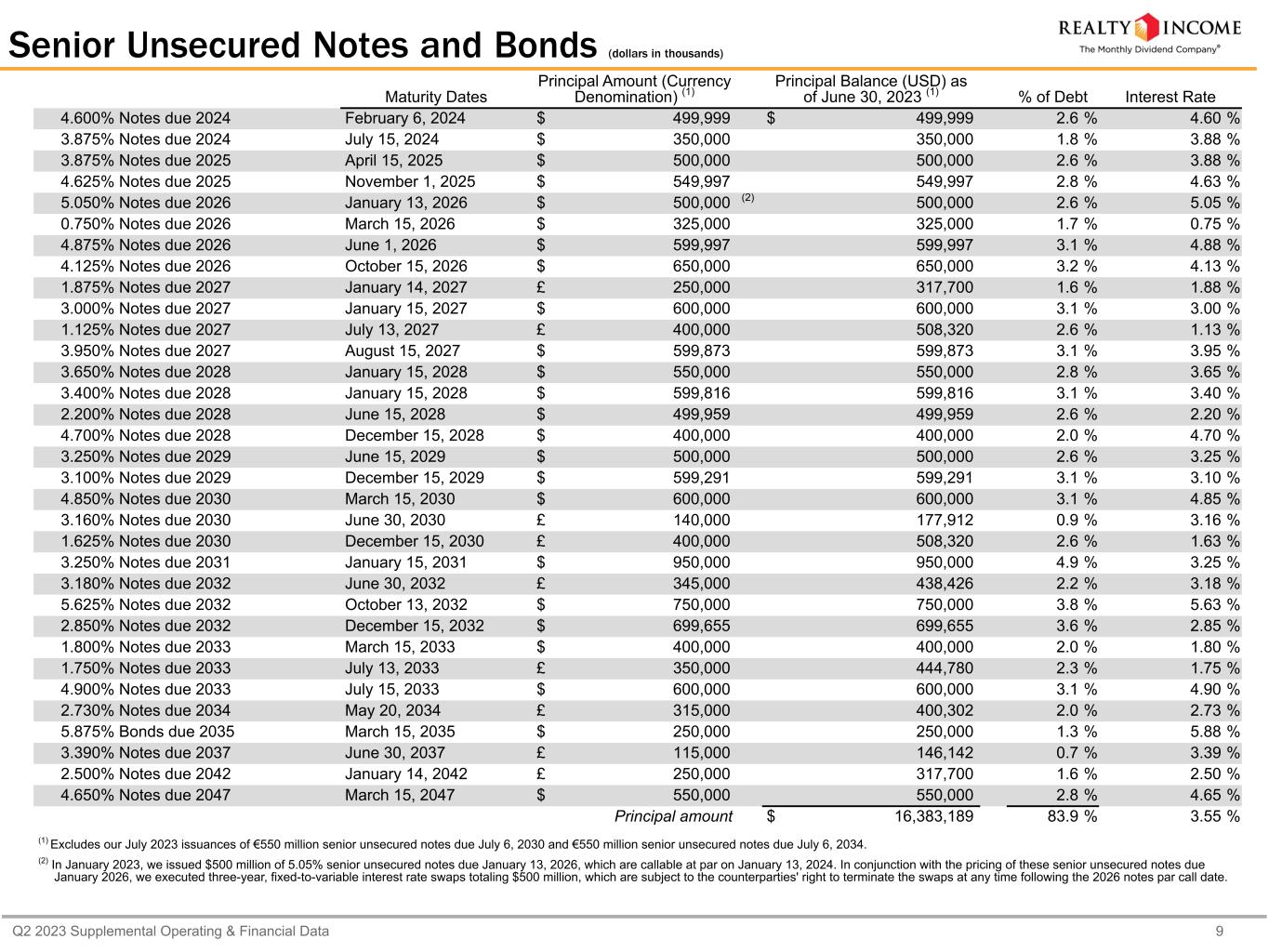 Q2 2023 Supplemental Operating & Financial Data 8 Debt Summary as of June 30, 2023 (dollars in thousands) Maturity Dates Carrying Value (USD) % of Debt Interest Rate Weighted Average Years Until Maturity Credit Facility and Commercial Paper (1) Credit Facility (2) June 2026 $ 867,522 4.4 % 5.60 % 3.0 years Commercial Paper (3) July 2023 122,735 0.6 % 5.37 % 0.0 years Carrying value 990,257 5.0 % 5.57 % (4) 2.6 years Unsecured Term Loans Term Loans (5) January 2024 - January 2026 1,328,709 6.8 % 4.81 % 2.2 years Deferred financing costs (4,424) Carrying value 1,324,285 Senior Unsecured Notes and Bonds (6) 33 series of senior unsecured notes and bonds February 2024 - March 2047 16,383,189 83.9 % 3.55 % (4) 6.7 years Unamortized net premiums, deferred financing costs, and basis adjustment on interest rate swaps designated as fair value hedge 92,400 Carrying value 16,475,589 Mortgages Payable 17 mortgages on 135 properties September 2023 - August 2030 836,311 (7) 4.3 % 4.80 % (4) 0.9 years Unamortized net premiums and deferred financing costs 5,379 Carrying value 841,690 Total Consolidated Debt Principal $ 19,538,466 (8) 3.79 % (4) 5.9 years Fixed Rate $ 18,048,209 92 % Variable Rate $ 1,490,257 8 % (1) We have a $4.25 billion unsecured revolving credit facility (excluding an accordion feature subject to lender commitments which provided for an additional $1.0 billion in borrowings) bearing interest at different benchmark rates based on the currency of the borrowings, with a maturity date in June 2026. In addition, we have a U.S. dollar-denominated unsecured commercial paper program, under which we may issue unsecured commercial paper notes up to a maximum aggregate amount outstanding of $1.5 billion, and a Euro-denominated unsecured commercial paper program, which permits us to issue additional unsecured commercial notes up to a maximum aggregate amount of $1.5 billion (or foreign currency equivalent) in U.S. dollars or other foreign currencies. We use our unsecured revolving credit facility as a liquidity backstop for the repayment of the notes issued under these programs. (2) As of June 30, 2023, we had $867.5 million of outstanding borrowings under our revolving credit facility, comprised of £644.0 million of Sterling and €45.0 million Euro borrowings. (3) As of June 30, 2023, we had $122.7 million in commercial paper borrowings, consisting entirely of USD borrowings, which matured in July 2023. (4) The totals are calculated as the weighted average interest rate as of June 30, 2023 for each respective category. (5) Under our $250.0 million unsecured term loan, and in connection with entering into our unsecured credit facility in April 2022, the previous LIBOR benchmark rate was replaced with daily SOFR, as the associated interest rate swap was also converted to SOFR, effectively fixing the interest rate at 3.83%. In January 2023, we entered into a term loan agreement, permitting us to incur multicurrency term loans, up to an aggregate of $1.5 billion in total borrowings. The 2023 term loans initially mature in January 2024 and include two twelve-month extensions that can be exercised at our option, with fully extended maturity dates presented in the table above. In conjunction with closing, we executed one-year variable-to-fixed interest rate swaps which fix our per annum interest rate at 5.0% over the initial term. Accordingly, the 2023 term loans have been presented as fixed rate debt as of June 30, 2023 in the table above. (6) See page 9 for details by issuance for senior unsecured notes and bonds. (7) Includes a Sterling-denominated mortgage payable of £30.5 million converted at the applicable exchange rate on June 30, 2023. (8) Total consolidated debt excludes non-cash unamortized net premiums recorded on the senior unsecured notes and bonds, non-cash unamortized net premiums recorded on the mortgages payable, and deferred financing costs on the term loans, notes and bonds, and mortgages payable.