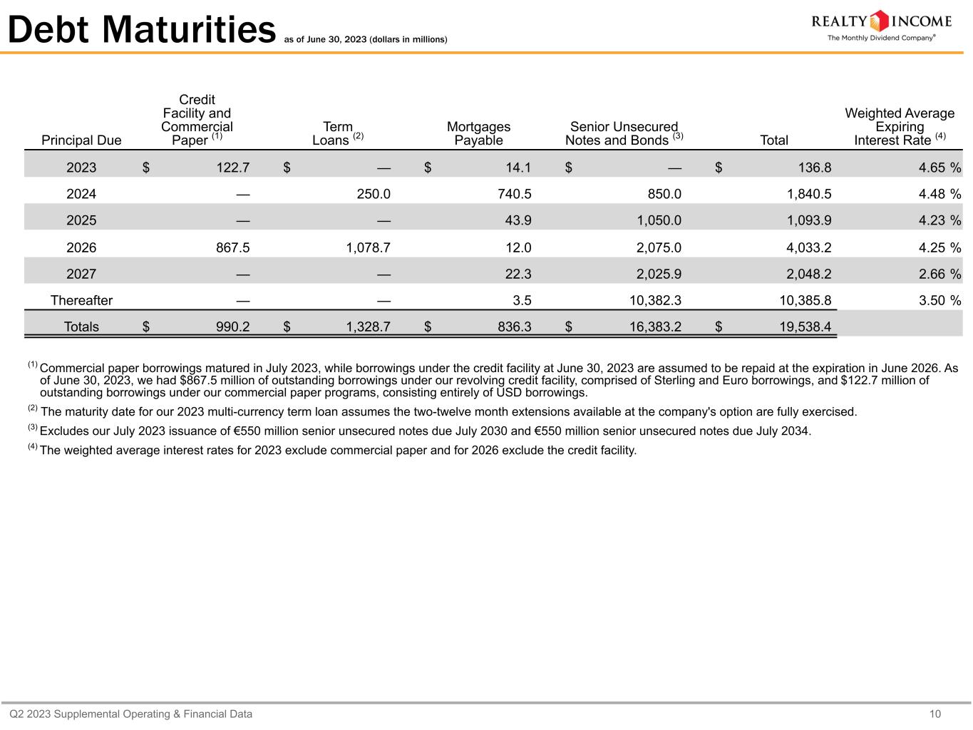 Q2 2023 Supplemental Operating & Financial Data 9 Senior Unsecured Notes and Bonds (dollars in thousands) Maturity Dates Principal Amount (Currency Denomination) (1) Principal Balance (USD) as of June 30, 2023 (1) % of Debt Interest Rate 4.600% Notes due 2024 February 6, 2024 $ 499,999 $ 499,999 2.6 % 4.60 % 3.875% Notes due 2024 July 15, 2024 $ 350,000 350,000 1.8 % 3.88 % 3.875% Notes due 2025 April 15, 2025 $ 500,000 500,000 2.6 % 3.88 % 4.625% Notes due 2025 November 1, 2025 $ 549,997 549,997 2.8 % 4.63 % 5.050% Notes due 2026 January 13, 2026 $ 500,000 (2) 500,000 2.6 % 5.05 % 0.750% Notes due 2026 March 15, 2026 $ 325,000 325,000 1.7 % 0.75 % 4.875% Notes due 2026 June 1, 2026 $ 599,997 599,997 3.1 % 4.88 % 4.125% Notes due 2026 October 15, 2026 $ 650,000 650,000 3.2 % 4.13 % 1.875% Notes due 2027 January 14, 2027 £ 250,000 317,700 1.6 % 1.88 % 3.000% Notes due 2027 January 15, 2027 $ 600,000 600,000 3.1 % 3.00 % 1.125% Notes due 2027 July 13, 2027 £ 400,000 508,320 2.6 % 1.13 % 3.950% Notes due 2027 August 15, 2027 $ 599,873 599,873 3.1 % 3.95 % 3.650% Notes due 2028 January 15, 2028 $ 550,000 550,000 2.8 % 3.65 % 3.400% Notes due 2028 January 15, 2028 $ 599,816 599,816 3.1 % 3.40 % 2.200% Notes due 2028 June 15, 2028 $ 499,959 499,959 2.6 % 2.20 % 4.700% Notes due 2028 December 15, 2028 $ 400,000 400,000 2.0 % 4.70 % 3.250% Notes due 2029 June 15, 2029 $ 500,000 500,000 2.6 % 3.25 % 3.100% Notes due 2029 December 15, 2029 $ 599,291 599,291 3.1 % 3.10 % 4.850% Notes due 2030 March 15, 2030 $ 600,000 600,000 3.1 % 4.85 % 3.160% Notes due 2030 June 30, 2030 £ 140,000 177,912 0.9 % 3.16 % 1.625% Notes due 2030 December 15, 2030 £ 400,000 508,320 2.6 % 1.63 % 3.250% Notes due 2031 January 15, 2031 $ 950,000 950,000 4.9 % 3.25 % 3.180% Notes due 2032 June 30, 2032 £ 345,000 438,426 2.2 % 3.18 % 5.625% Notes due 2032 October 13, 2032 $ 750,000 750,000 3.8 % 5.63 % 2.850% Notes due 2032 December 15, 2032 $ 699,655 699,655 3.6 % 2.85 % 1.800% Notes due 2033 March 15, 2033 $ 400,000 400,000 2.0 % 1.80 % 1.750% Notes due 2033 July 13, 2033 £ 350,000 444,780 2.3 % 1.75 % 4.900% Notes due 2033 July 15, 2033 $ 600,000 600,000 3.1 % 4.90 % 2.730% Notes due 2034 May 20, 2034 £ 315,000 400,302 2.0 % 2.73 % 5.875% Bonds due 2035 March 15, 2035 $ 250,000 250,000 1.3 % 5.88 % 3.390% Notes due 2037 June 30, 2037 £ 115,000 146,142 0.7 % 3.39 % 2.500% Notes due 2042 January 14, 2042 £ 250,000 317,700 1.6 % 2.50 % 4.650% Notes due 2047 March 15, 2047 $ 550,000 550,000 2.8 % 4.65 % Principal amount $ 16,383,189 83.9 % 3.55 % (1) Excludes our July 2023 issuances of €550 million senior unsecured notes due July 6, 2030 and €550 million senior unsecured notes due July 6, 2034. (2) In January 2023, we issued $500 million of 5.05% senior unsecured notes due January 13, 2026, which are callable at par on January 13, 2024. In conjunction with the pricing of these senior unsecured notes due January 2026, we executed three-year, fixed-to-variable interest rate swaps totaling $500 million, which are subject to the counterparties' right to terminate the swaps at any time following the 2026 notes par call date.