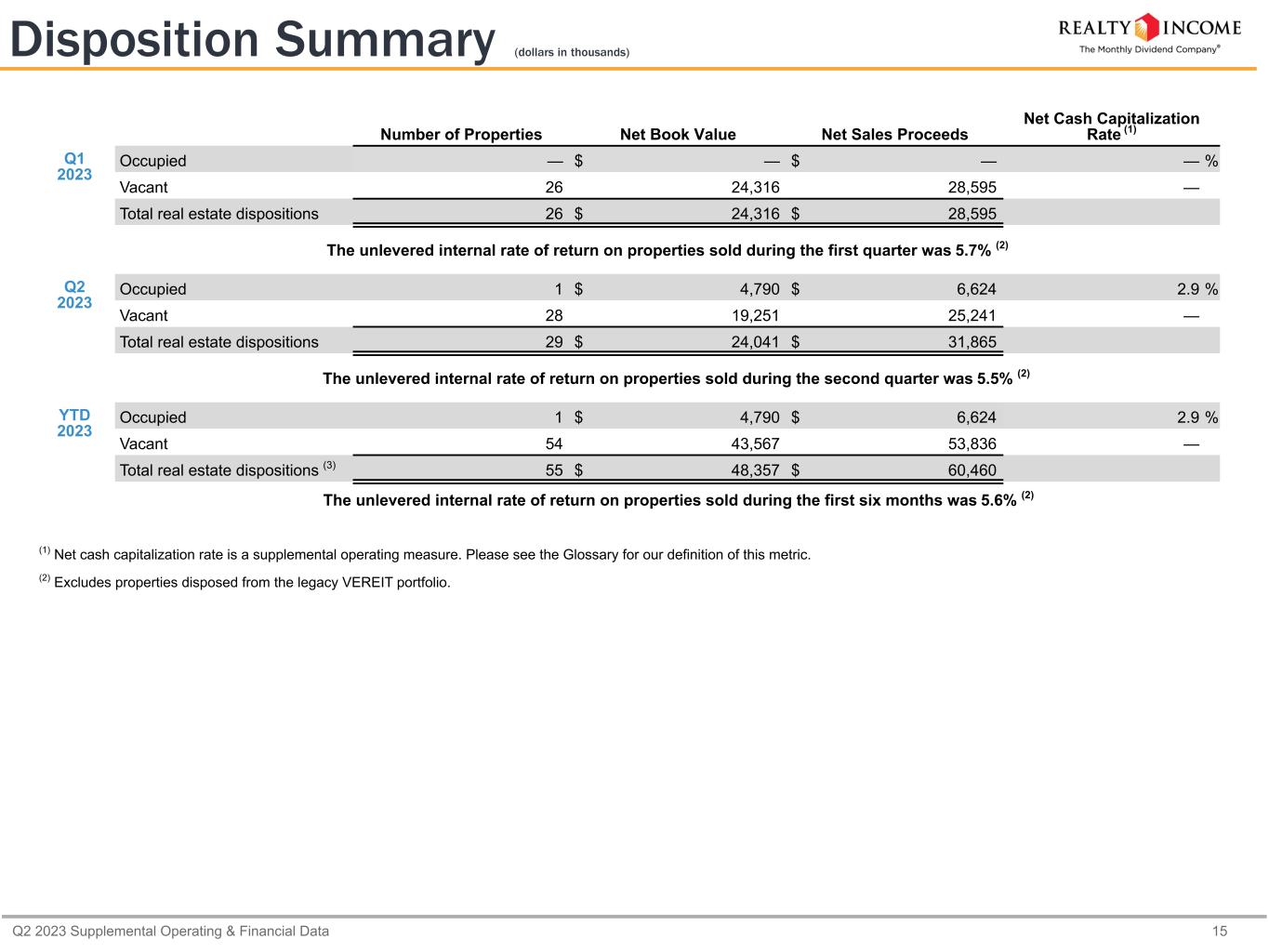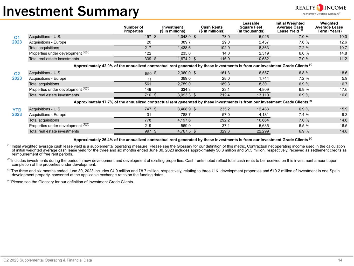 Q2 2023 Supplemental Operating & Financial Data 14 Investment Summary Number of Properties Investment ($ in millions) Cash Rents ($ in millions) Leasable Square Feet (in thousands) Initial Weighted Average Cash Lease Yield (1) Weighted Average Lease Term (Years) Q1 2023 Acquisitions - U.S. 197 $ 1,048.9 $ 73.9 5,926 7.0 % 10.0 Acquisitions - Europe 20 389.7 29.0 2,437 7.6 % 12.6 Total acquisitions 217 1,438.6 102.9 8,363 7.2 % 10.7 Properties under development (2)(3) 122 235.6 14.0 2,319 6.0 % 14.8 Total real estate investments 339 $ 1,674.2 $ 116.9 10,682 7.0 % 11.2 Approximately 42.0% of the annualized contractual rent generated by these investments is from our Investment Grade Clients (4) Q2 2023 Acquisitions - U.S. 550 $ 2,360.0 $ 161.3 6,557 6.8 % 18.6 Acquisitions - Europe 11 399.0 28.0 1,744 7.2 % 5.9 Total acquisitions 561 2,759.0 189.3 8,301 6.9 % 16.7 Properties under development (2)(3) 149 334.3 23.1 4,809 6.9 % 17.6 Total real estate investments 710 $ 3,093.3 $ 212.4 13,110 6.9 % 16.8 Approximately 17.7% of the annualized contractual rent generated by these investments is from our Investment Grade Clients (4) YTD 2023 Acquisitions - U.S. 747 $ 3,408.9 $ 235.2 12,483 6.9 % 15.9 Acquisitions - Europe 31 788.7 57.0 4,181 7.4 % 9.3 Total acquisitions 778 4,197.6 292.2 16,664 7.0 % 14.6 Properties under development (2)(3) 219 569.9 37.1 5,635 6.5 % 16.5 Total real estate investments 997 $ 4,767.5 $ 329.3 22,299 6.9 % 14.8 Approximately 26.4% of the annualized contractual rent generated by these investments is from our Investment Grade Clients (4) (1) Initial weighted average cash lease yield is a supplemental operating measure. Please see the Glossary for our definition of this metric. Contractual net operating income used in the calculation of initial weighted average cash lease yield for the three and six months ended June 30, 2023 includes approximately $0.8 million and $1.5 million, respectively, received as settlement credits as reimbursement of free rent periods. (2) Includes investments during the period in new development and development of existing properties. Cash rents noted reflect total cash rents to be received on this investment amount upon completion of the properties under development. (3) The three and six months ended June 30, 2023 includes £4.9 million and £8.7 million, respectively, relating to three U.K. development properties and €10.2 million of investment in one Spain development property, converted at the applicable exchange rates on the funding dates. (4) Please see the Glossary for our definition of Investment Grade Clients.