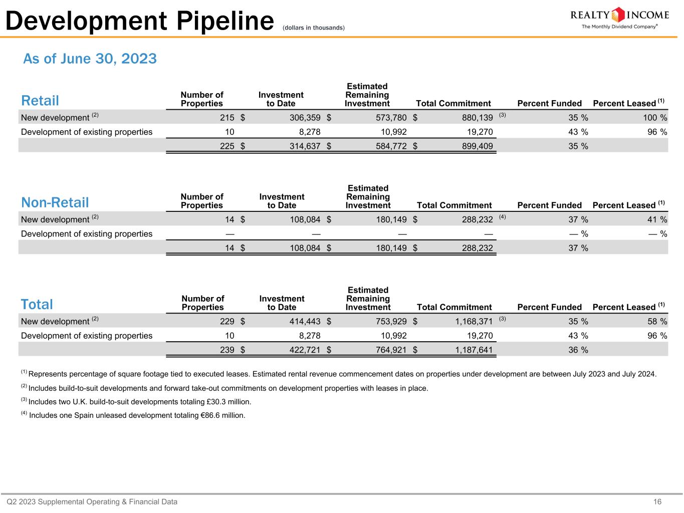 Q2 2023 Supplemental Operating & Financial Data 16 Development Pipeline (dollars in thousands) Retail Number of Properties Investment to Date Estimated Remaining Investment Total Commitment Percent Funded Percent Leased (1) New development (2) 215 $ 306,359 $ 573,780 $ 880,139 (3) 35 % 100 % Development of existing properties 10 8,278 10,992 19,270 43 % 96 % 225 $ 314,637 $ 584,772 $ 899,409 35 % Non-Retail Number of Properties Investment to Date Estimated Remaining Investment Total Commitment Percent Funded Percent Leased (1) New development (2) 14 $ 108,084 $ 180,149 $ 288,232 (4) 37 % 41 % Development of existing properties — — — — — % — % 14 $ 108,084 $ 180,149 $ 288,232 37 % Total Number of Properties Investment to Date Estimated Remaining Investment Total Commitment Percent Funded Percent Leased (1) New development (2) 229 $ 414,443 $ 753,929 $ 1,168,371 (3) 35 % 58 % Development of existing properties 10 8,278 10,992 19,270 43 % 96 % 239 $ 422,721 $ 764,921 $ 1,187,641 36 % (1) Represents percentage of square footage tied to executed leases. Estimated rental revenue commencement dates on properties under development are between July 2023 and July 2024. (2) Includes build-to-suit developments and forward take-out commitments on development properties with leases in place. (3) Includes two U.K. build-to-suit developments totaling £30.3 million. (4) Includes one Spain unleased development totaling €86.6 million. As of June 30, 2023