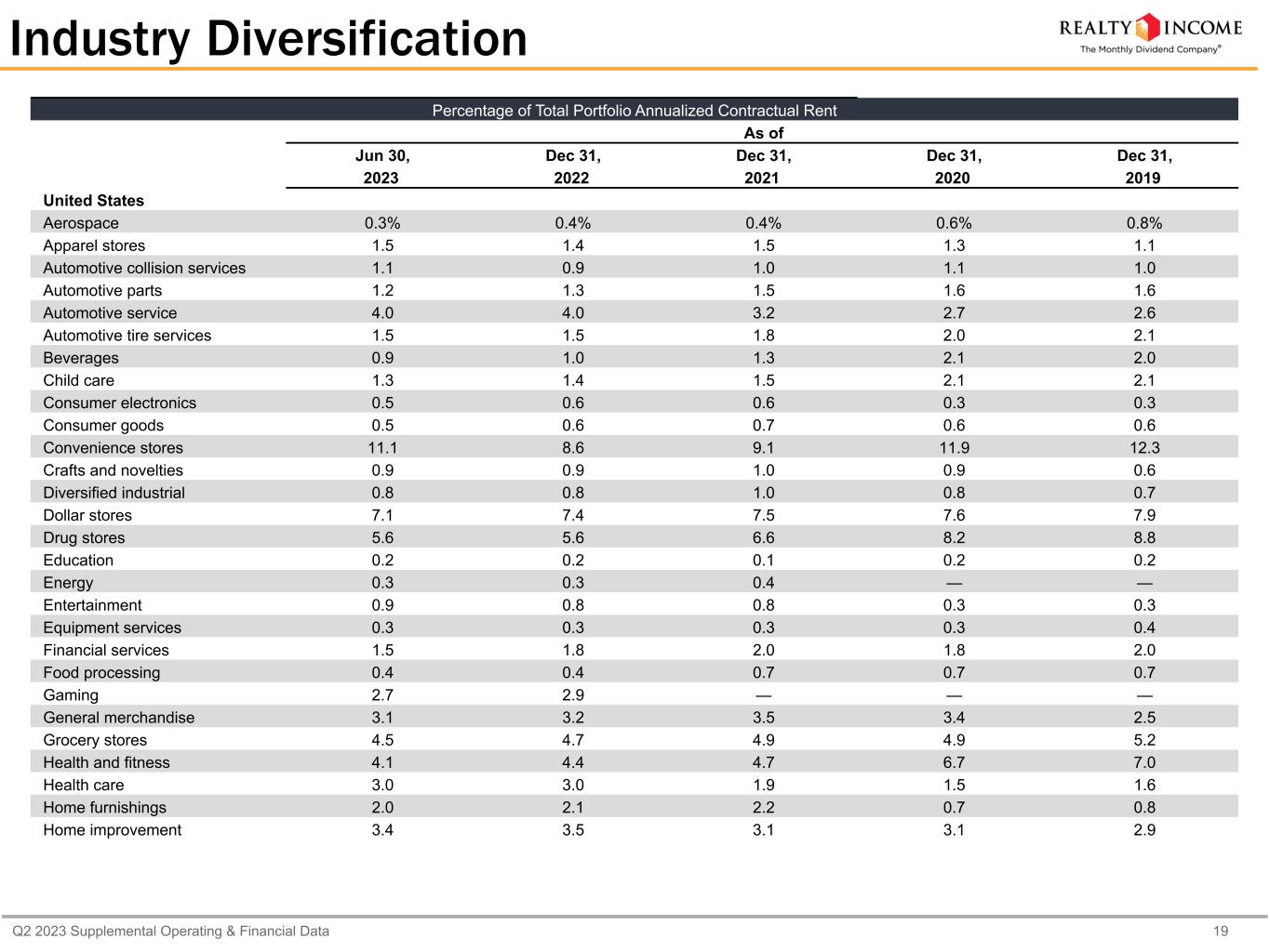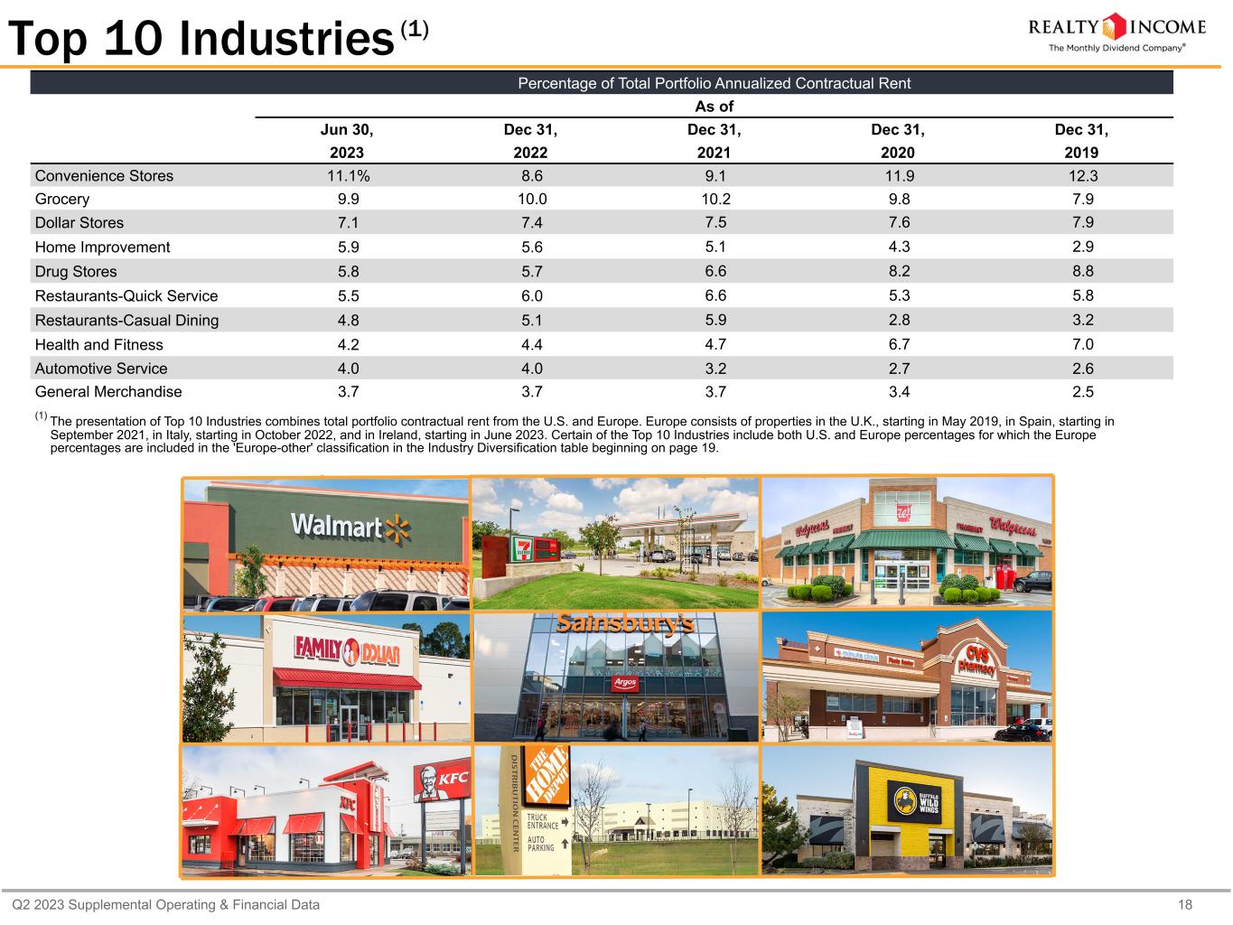 Q2 2023 Supplemental Operating & Financial Data 18 (1)Top 10 Industries Percentage of Total Portfolio Annualized Contractual Rent As of Jun 30, Dec 31, Dec 31, Dec 31, Dec 31, 2023 2022 2021 2020 2019 Convenience Stores 11.1% 8.6 9.1 11.9 12.3 Grocery 9.9 10.0 10.2 9.8 7.9 Dollar Stores 7.1 7.4 7.5 7.6 7.9 Home Improvement 5.9 5.6 5.1 4.3 2.9 Drug Stores 5.8 5.7 6.6 8.2 8.8 Restaurants-Quick Service 5.5 6.0 6.6 5.3 5.8 Restaurants-Casual Dining 4.8 5.1 5.9 2.8 3.2 Health and Fitness 4.2 4.4 4.7 6.7 7.0 Automotive Service 4.0 4.0 3.2 2.7 2.6 General Merchandise 3.7 3.7 3.7 3.4 2.5 (1) The presentation of Top 10 Industries combines total portfolio contractual rent from the U.S. and Europe. Europe consists of properties in the U.K., starting in May 2019, in Spain, starting in September 2021, in Italy, starting in October 2022, and in Ireland, starting in June 2023. Certain of the Top 10 Industries include both U.S. and Europe percentages for which the Europe percentages are included in the 'Europe-other' classification in the Industry Diversification table beginning on page 19.
