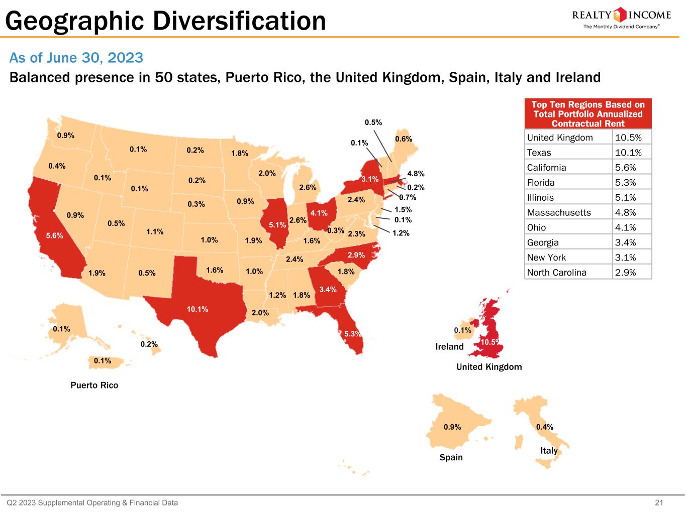 Q2 2023 Supplemental Operating & Financial Data 21 Geographic Diversification Balanced presence in 50 states, Puerto Rico, the United Kingdom, Spain, Italy and Ireland Top Ten Regions Based on Total Portfolio Annualized Contractual Rent United Kingdom 10.5% Texas 10.1% California 5.6% Florida 5.3% Illinois 5.1% Massachusetts 4.8% Ohio 4.1% Georgia 3.4% New York 3.1% North Carolina 2.9% 1.8% 0.1% 1.9% 1.0% 5.6% 1.1% 0.7% 0.1% 5.3% 3.4% 0.2% 0.1% 5.1% 2.6% 0.9% 1.0% 1.6% 2.0% 0.6% 1.2% 4.8% 2.6% 1.8% 1.2% 1.9% 0.1% 0.3% 0.9% 0.5% 1.5% 0.5% 3.1% 2.9% 0.2% 4.1% 1.6% 0.4% 2.4% 0.2% 1.8% 0.2% 2.4% 10.1% 0.5% 0.1% 2.3% 0.9% 0.3% 2.0% 0.1% 0.1% 10.5% 0.9% 0.4% Puerto Rico Spain United Kingdom Italy As of June 30, 2023 Ireland 0.1%