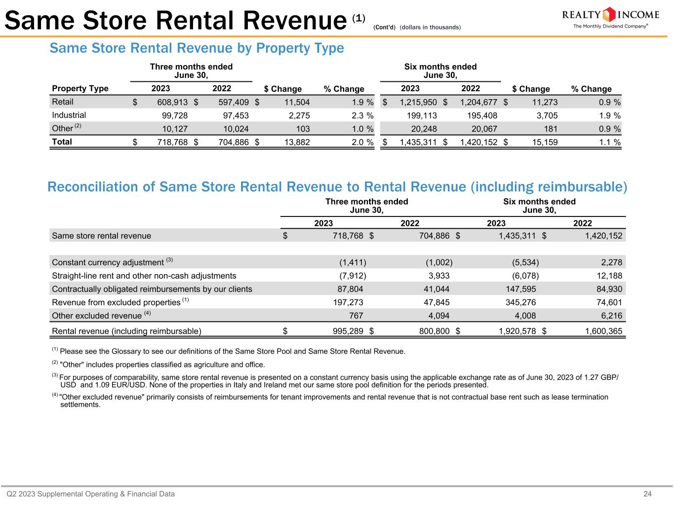Q2 2023 Supplemental Operating & Financial Data 23 Q2 2023 Same Store Rental Revenue Number of properties 10,685 Square footage 190,150,496 Q2 2023 $ 718,768 Q2 2022 $ 704,886 Change (in dollars) $ 13,882 Change (percent) 2.0 % YTD 2023 Same Store Rental Revenue Number of properties 10,685 Square footage 190,150,496 YTD 2023 $ 1,435,311 YTD 2022 $ 1,420,152 Change (in dollars) $ 15,159 Change (percent) 1.1 % Same Store Rental Revenue (1) (dollars in thousands) Top 3 Industries Contributing to the Change (2) Three months ended June 30, Industry 2023 2022 $ Change % Change Health and Fitness $ 36,896 $ 33,347 $ 3,549 10.6 % Theaters 25,648 22,677 2,971 13.1 % Grocery 72,876 71,680 1,196 1.7 % Top 3 Industries Contributing to the Change (2) Six months ended June 30, Industry 2023 2022 $ Change % Change Health and Fitness $ 70,821 $ 66,669 $ 4,152 6.2 % Restaurants-Quick Service 95,184 98,733 (3,549) (3.6) % Grocery 145,604 143,249 2,355 1.6 % For purposes of comparability, same store rental revenue is presented on a constant currency basis using the applicable exchange rate as of June 30, 2023 of 1.27 GBP/ USD and 1.09 EUR/USD. None of the properties in Italy and Ireland met our same store pool definition for the periods presented. (1) Please see the Glossary to see definitions of our Same Store Pool and Same Store Rental Revenue. (2) Top 3 industry contributors are based on absolute value of net change period over period.