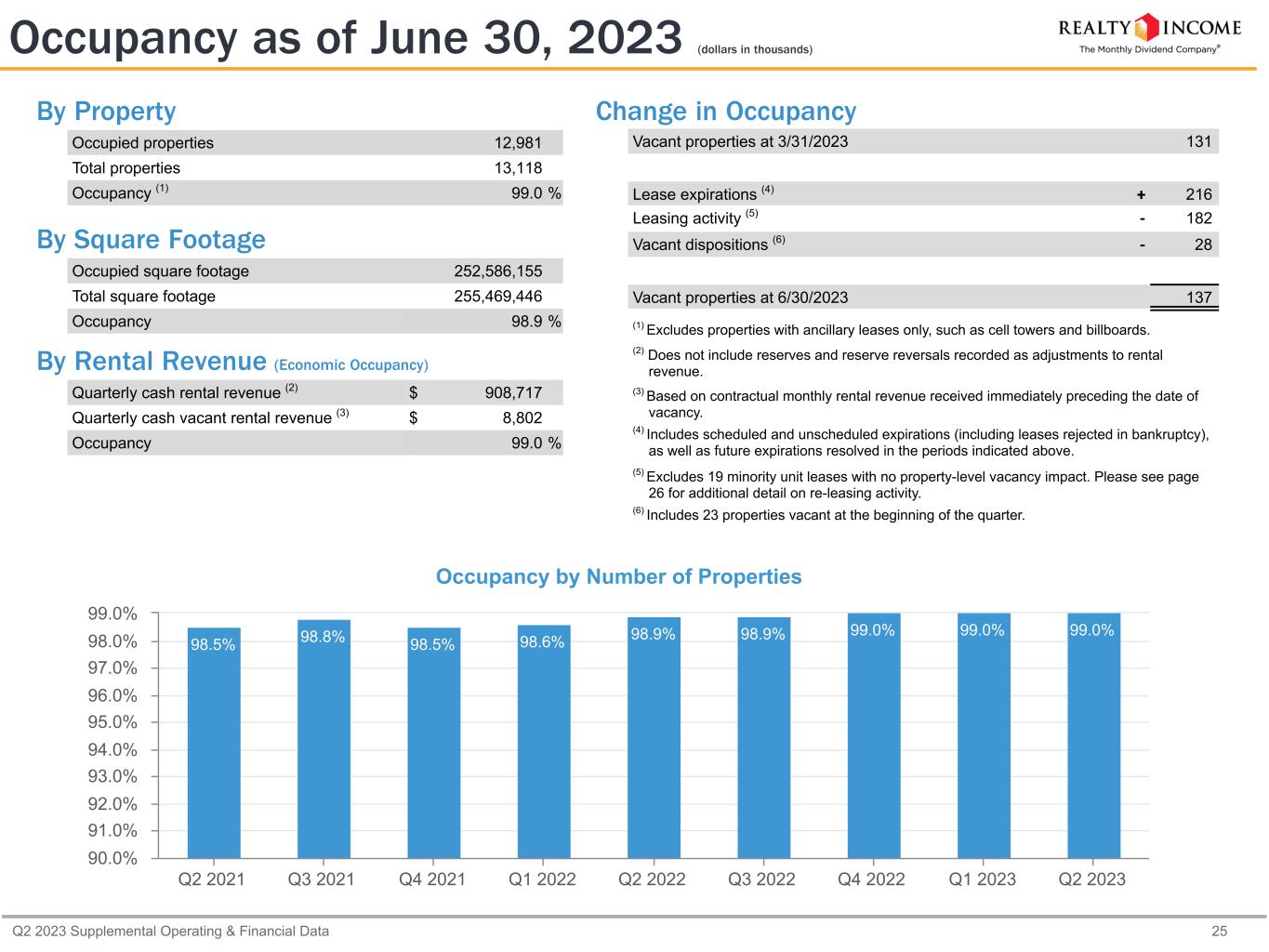 Q2 2023 Supplemental Operating & Financial Data 25 By Property Occupied properties 12,981 Total properties 13,118 Occupancy (1) 99.0 % By Square Footage Occupied square footage 252,586,155 Total square footage 255,469,446 Occupancy 98.9 % By Rental Revenue (Economic Occupancy) Quarterly cash rental revenue (2) $ 908,717 Quarterly cash vacant rental revenue (3) $ 8,802 Occupancy 99.0 % Change in Occupancy Vacant properties at 3/31/2023   131 Lease expirations (4) + 216 Leasing activity (5) - 182 Vacant dispositions (6) - 28 Vacant properties at 6/30/2023   137 (1) Excludes properties with ancillary leases only, such as cell towers and billboards. (2) Does not include reserves and reserve reversals recorded as adjustments to rental revenue. (3) Based on contractual monthly rental revenue received immediately preceding the date of vacancy. (4) Includes scheduled and unscheduled expirations (including leases rejected in bankruptcy), as well as future expirations resolved in the periods indicated above. (5) Excludes 19 minority unit leases with no property-level vacancy impact. Please see page 26 for additional detail on re-leasing activity. (6) Includes 23 properties vacant at the beginning of the quarter. Occupancy as of June 30, 2023 (dollars in thousands) Occupancy by Number of Properties 98.5% 98.8% 98.5% 98.6% 98.9% 98.9% 99.0% 99.0% 99.0% Q2 2021 Q3 2021 Q4 2021 Q1 2022 Q2 2022 Q3 2022 Q4 2022 Q1 2023 Q2 2023 90.0% 91.0% 92.0% 93.0% 94.0% 95.0% 96.0% 97.0% 98.0% 99.0%