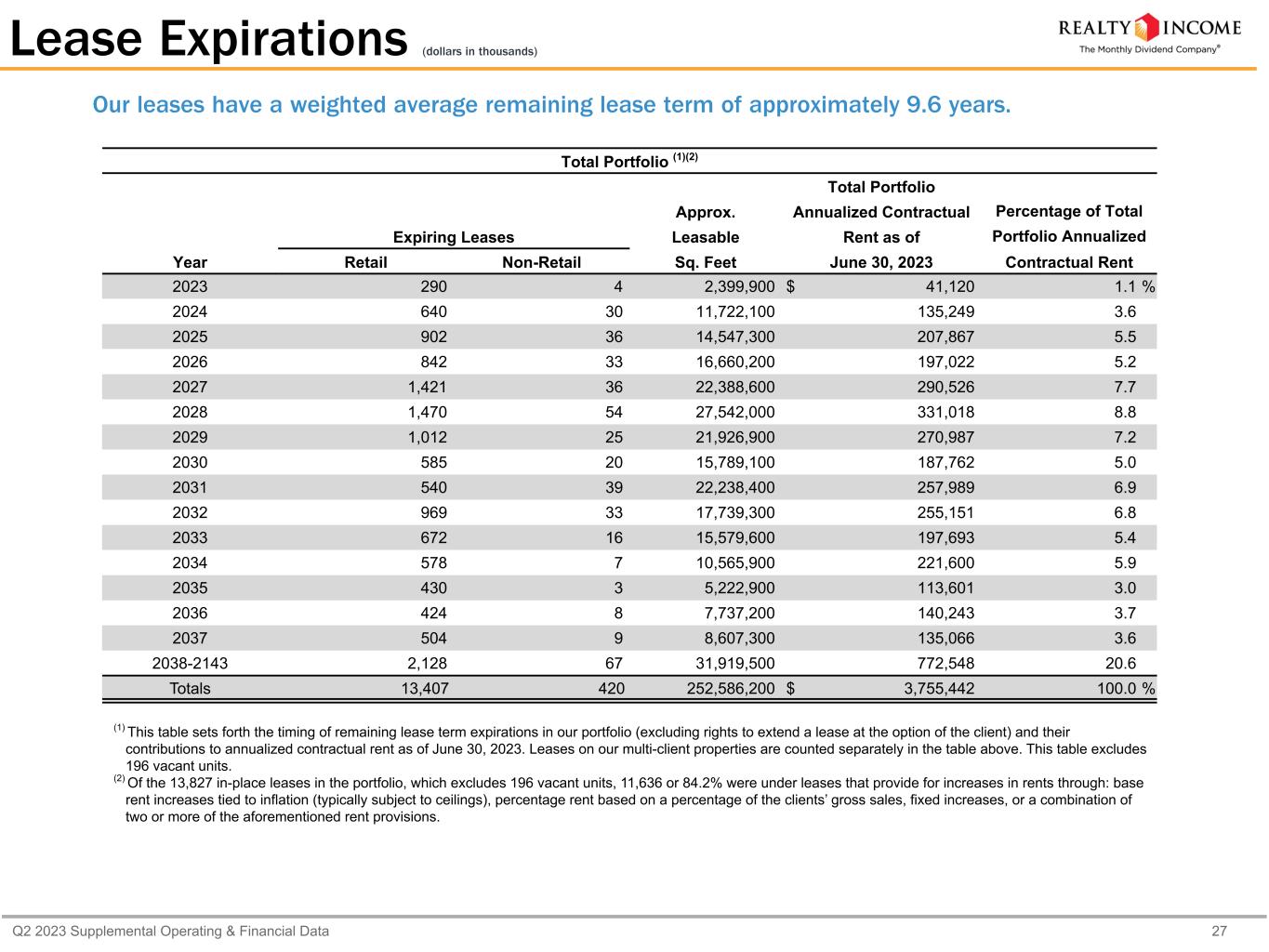 Q2 2023 Supplemental Operating & Financial Data 27 (1) This table sets forth the timing of remaining lease term expirations in our portfolio (excluding rights to extend a lease at the option of the client) and their contributions to annualized contractual rent as of June 30, 2023. Leases on our multi-client properties are counted separately in the table above. This table excludes 196 vacant units. (2) Of the 13,827 in-place leases in the portfolio, which excludes 196 vacant units, 11,636 or 84.2% were under leases that provide for increases in rents through: base rent increases tied to inflation (typically subject to ceilings), percentage rent based on a percentage of the clients’ gross sales, fixed increases, or a combination of two or more of the aforementioned rent provisions. Our leases have a weighted average remaining lease term of approximately 9.6 years. Lease Expirations (dollars in thousands) Total Portfolio (1)(2) Total Portfolio Approx. Annualized Contractual Percentage of Total Expiring Leases Leasable Rent as of Portfolio Annualized Year Retail Non-Retail Sq. Feet June 30, 2023 Contractual Rent 2023 290 4 2,399,900 $ 41,120 1.1 % 2024 640 30 11,722,100 135,249 3.6 2025 902 36 14,547,300 207,867 5.5 2026 842 33 16,660,200 197,022 5.2 2027 1,421 36 22,388,600 290,526 7.7 2028 1,470 54 27,542,000 331,018 8.8 2029 1,012 25 21,926,900 270,987 7.2 2030 585 20 15,789,100 187,762 5.0 2031 540 39 22,238,400 257,989 6.9 2032 969 33 17,739,300 255,151 6.8 2033 672 16 15,579,600 197,693 5.4 2034 578 7 10,565,900 221,600 5.9 2035 430 3 5,222,900 113,601 3.0 2036 424 8 7,737,200 140,243 3.7 2037 504 9 8,607,300 135,066 3.6 2038-2143 2,128 67 31,919,500 772,548 20.6 Totals 13,407 420 252,586,200 $ 3,755,442 100.0 %