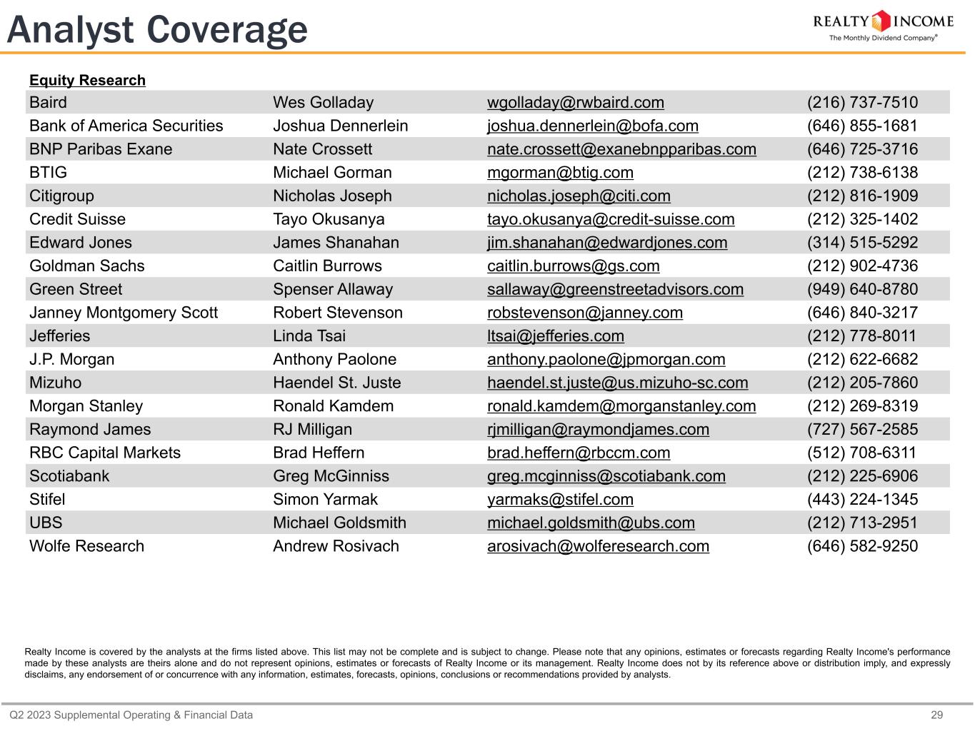 Q2 2023 Supplemental Operating & Financial Data 29 Analyst Coverage Equity Research Baird Wes Golladay wgolladay@rwbaird.com (216) 737-7510 Bank of America Securities Joshua Dennerlein joshua.dennerlein@bofa.com (646) 855-1681 BNP Paribas Exane Nate Crossett nate.crossett@exanebnpparibas.com (646) 725-3716 BTIG Michael Gorman mgorman@btig.com (212) 738-6138 Citigroup Nicholas Joseph nicholas.joseph@citi.com (212) 816-1909 Credit Suisse Tayo Okusanya tayo.okusanya@credit-suisse.com (212) 325-1402 Edward Jones James Shanahan jim.shanahan@edwardjones.com (314) 515-5292 Goldman Sachs Caitlin Burrows caitlin.burrows@gs.com (212) 902-4736 Green Street Spenser Allaway sallaway@greenstreetadvisors.com (949) 640-8780 Janney Montgomery Scott Robert Stevenson robstevenson@janney.com (646) 840-3217 Jefferies Linda Tsai ltsai@jefferies.com (212) 778-8011 J.P. Morgan Anthony Paolone anthony.paolone@jpmorgan.com (212) 622-6682 Mizuho Haendel St. Juste haendel.st.juste@us.mizuho-sc.com (212) 205-7860 Morgan Stanley Ronald Kamdem ronald.kamdem@morganstanley.com (212) 269-8319 Raymond James RJ Milligan rjmilligan@raymondjames.com (727) 567-2585 RBC Capital Markets Brad Heffern brad.heffern@rbccm.com (512) 708-6311 Scotiabank Greg McGinniss greg.mcginniss@scotiabank.com (212) 225-6906 Stifel Simon Yarmak yarmaks@stifel.com (443) 224-1345 UBS Michael Goldsmith michael.goldsmith@ubs.com (212) 713-2951 Wolfe Research Andrew Rosivach arosivach@wolferesearch.com (646) 582-9250 Realty Income is covered by the analysts at the firms listed above. This list may not be complete and is subject to change. Please note that any opinions, estimates or forecasts regarding Realty Income's performance made by these analysts are theirs alone and do not represent opinions, estimates or forecasts of Realty Income or its management. Realty Income does not by its reference above or distribution imply, and expressly disclaims, any endorsement of or concurrence with any information, estimates, forecasts, opinions, conclusions or recommendations provided by analysts.