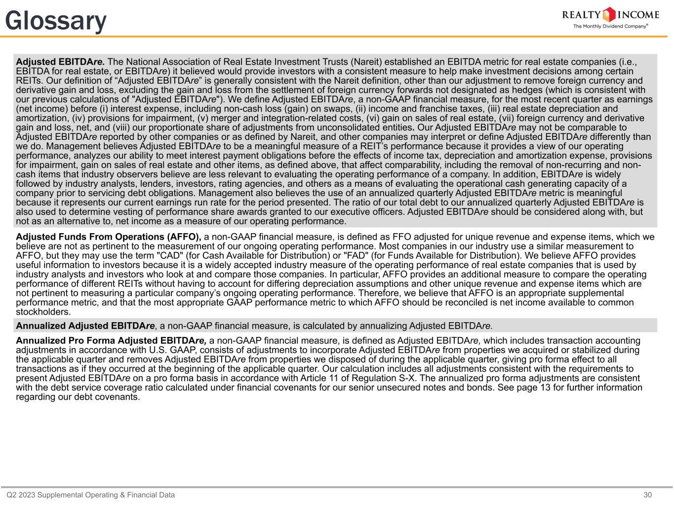 Q2 2023 Supplemental Operating & Financial Data 30 Glossary Adjusted EBITDAre. The National Association of Real Estate Investment Trusts (Nareit) established an EBITDA metric for real estate companies (i.e., EBITDA for real estate, or EBITDAre) it believed would provide investors with a consistent measure to help make investment decisions among certain REITs. Our definition of “Adjusted EBITDAre” is generally consistent with the Nareit definition, other than our adjustment to remove foreign currency and derivative gain and loss, excluding the gain and loss from the settlement of foreign currency forwards not designated as hedges (which is consistent with our previous calculations of "Adjusted EBITDAre"). We define Adjusted EBITDAre, a non-GAAP financial measure, for the most recent quarter as earnings (net income) before (i) interest expense, including non-cash loss (gain) on swaps, (ii) income and franchise taxes, (iii) real estate depreciation and amortization, (iv) provisions for impairment, (v) merger and integration-related costs, (vi) gain on sales of real estate, (vii) foreign currency and derivative gain and loss, net, and (viii) our proportionate share of adjustments from unconsolidated entities. Our Adjusted EBITDAre may not be comparable to Adjusted EBITDAre reported by other companies or as defined by Nareit, and other companies may interpret or define Adjusted EBITDAre differently than we do. Management believes Adjusted EBITDAre to be a meaningful measure of a REIT’s performance because it provides a view of our operating performance, analyzes our ability to meet interest payment obligations before the effects of income tax, depreciation and amortization expense, provisions for impairment, gain on sales of real estate and other items, as defined above, that affect comparability, including the removal of non-recurring and non- cash items that industry observers believe are less relevant to evaluating the operating performance of a company. In addition, EBITDAre is widely followed by industry analysts, lenders, investors, rating agencies, and others as a means of evaluating the operational cash generating capacity of a company prior to servicing debt obligations. Management also believes the use of an annualized quarterly Adjusted EBITDAre metric is meaningful because it represents our current earnings run rate for the period presented. The ratio of our total debt to our annualized quarterly Adjusted EBITDAre is also used to determine vesting of performance share awards granted to our executive officers. Adjusted EBITDAre should be considered along with, but not as an alternative to, net income as a measure of our operating performance. Adjusted Funds From Operations (AFFO), a non-GAAP financial measure, is defined as FFO adjusted for unique revenue and expense items, which we believe are not as pertinent to the measurement of our ongoing operating performance. Most companies in our industry use a similar measurement to AFFO, but they may use the term "CAD" (for Cash Available for Distribution) or "FAD" (for Funds Available for Distribution). We believe AFFO provides useful information to investors because it is a widely accepted industry measure of the operating performance of real estate companies that is used by industry analysts and investors who look at and compare those companies. In particular, AFFO provides an additional measure to compare the operating performance of different REITs without having to account for differing depreciation assumptions and other unique revenue and expense items which are not pertinent to measuring a particular company’s ongoing operating performance. Therefore, we believe that AFFO is an appropriate supplemental performance metric, and that the most appropriate GAAP performance metric to which AFFO should be reconciled is net income available to common stockholders. Annualized Adjusted EBITDAre, a non-GAAP financial measure, is calculated by annualizing Adjusted EBITDAre. Annualized Pro Forma Adjusted EBITDAre, a non-GAAP financial measure, is defined as Adjusted EBITDAre, which includes transaction accounting adjustments in accordance with U.S. GAAP, consists of adjustments to incorporate Adjusted EBITDAre from properties we acquired or stabilized during the applicable quarter and removes Adjusted EBITDAre from properties we disposed of during the applicable quarter, giving pro forma effect to all transactions as if they occurred at the beginning of the applicable quarter. Our calculation includes all adjustments consistent with the requirements to present Adjusted EBITDAre on a pro forma basis in accordance with Article 11 of Regulation S-X. The annualized pro forma adjustments are consistent with the debt service coverage ratio calculated under financial covenants for our senior unsecured notes and bonds. See page 13 for further information regarding our debt covenants.