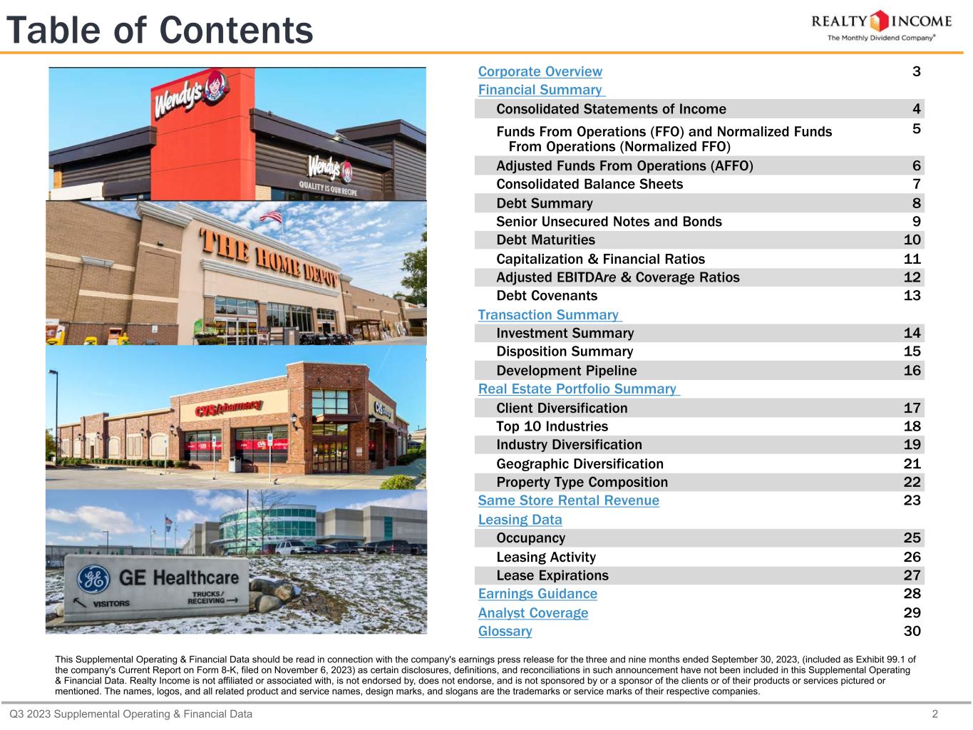Q3 2023 Supplemental Operating & Financial Data 2 Table of Contents Corporate Overview 3 Financial Summary Consolidated Statements of Income 4 Funds From Operations (FFO) and Normalized Funds From Operations (Normalized FFO) 5 Adjusted Funds From Operations (AFFO) 6 Consolidated Balance Sheets 7 Debt Summary 8 Senior Unsecured Notes and Bonds 9 Debt Maturities 10 Capitalization & Financial Ratios 11 Adjusted EBITDAre & Coverage Ratios 12 Debt Covenants 13 Transaction Summary Investment Summary 14 Disposition Summary 15 Development Pipeline 16 Real Estate Portfolio Summary Client Diversification 17 Top 10 Industries 18 Industry Diversification 19 Geographic Diversification 21 Property Type Composition 22 Same Store Rental Revenue 23 Leasing Data Occupancy 25 Leasing Activity 26 Lease Expirations 27 Earnings Guidance 28 Analyst Coverage 29 Glossary 30 This Supplemental Operating & Financial Data should be read in connection with the company's earnings press release for the three and nine months ended September 30, 2023, (included as Exhibit 99.1 of the company's Current Report on Form 8-K, filed on November 6, 2023) as certain disclosures, definitions, and reconciliations in such announcement have not been included in this Supplemental Operating & Financial Data. Realty Income is not affiliated or associated with, is not endorsed by, does not endorse, and is not sponsored by or a sponsor of the clients or of their products or services pictured or mentioned. The names, logos, and all related product and service names, design marks, and slogans are the trademarks or service marks of their respective companies.