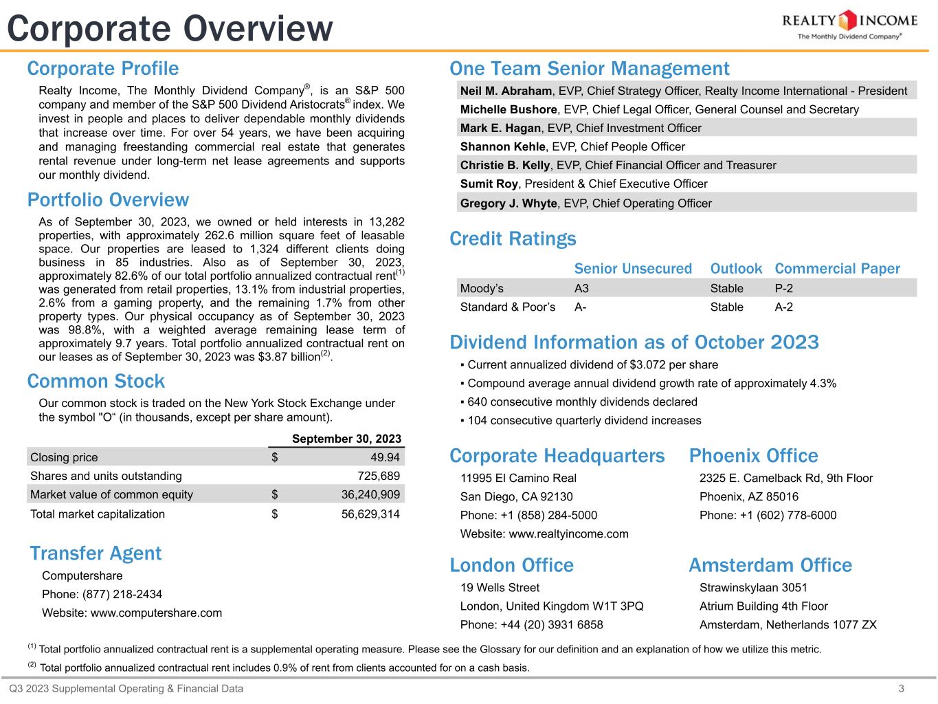 Q3 2023 Supplemental Operating & Financial Data 3 One Team Senior Management Neil M. Abraham, EVP, Chief Strategy Officer, Realty Income International - President Michelle Bushore, EVP, Chief Legal Officer, General Counsel and Secretary Mark E. Hagan, EVP, Chief Investment Officer Shannon Kehle, EVP, Chief People Officer Christie B. Kelly, EVP, Chief Financial Officer and Treasurer Sumit Roy, President & Chief Executive Officer Gregory J. Whyte, EVP, Chief Operating Officer Credit Ratings Senior Unsecured Outlook Commercial Paper Moody’s A3 Stable P-2 Standard & Poor’s A- Stable A-2 Dividend Information as of October 2023 ▪ Current annualized dividend of $3.072 per share ▪ Compound average annual dividend growth rate of approximately 4.3% ▪ 640 consecutive monthly dividends declared ▪ 104 consecutive quarterly dividend increases Corporate Headquarters Phoenix Office 11995 El Camino Real 2325 E. Camelback Rd, 9th Floor San Diego, CA 92130 Phoenix, AZ 85016 Phone: +1 (858) 284-5000 Phone: +1 (602) 778-6000 Website: www.realtyincome.com London Office Amsterdam Office 19 Wells Street Strawinskylaan 3051 London, United Kingdom W1T 3PQ Atrium Building 4th Floor Phone: +44 (20) 3931 6858 Amsterdam, Netherlands 1077 ZX Corporate Overview Transfer Agent Computershare Phone: (877) 218-2434 Website: www.computershare.com (1) Total portfolio annualized contractual rent is a supplemental operating measure. Please see the Glossary for our definition and an explanation of how we utilize this metric. (2) Total portfolio annualized contractual rent includes 0.9% of rent from clients accounted for on a cash basis. September 30, 2023 Closing price $ 49.94 Shares and units outstanding 725,689 Market value of common equity $ 36,240,909 Total market capitalization $ 56,629,314 Corporate Profile Realty Income, The Monthly Dividend Company®, is an S&P 500 company and member of the S&P 500 Dividend Aristocrats® index. We invest in people and places to deliver dependable monthly dividends that increase over time. For over 54 years, we have been acquiring and managing freestanding commercial real estate that generates rental revenue under long-term net lease agreements and supports our monthly dividend. Portfolio Overview As of September 30, 2023, we owned or held interests in 13,282 properties, with approximately 262.6 million square feet of leasable space. Our properties are leased to 1,324 different clients doing business in 85 industries. Also as of September 30, 2023, approximately 82.6% of our total portfolio annualized contractual rent(1) was generated from retail properties, 13.1% from industrial properties, 2.6% from a gaming property, and the remaining 1.7% from other property types. Our physical occupancy as of September 30, 2023 was 98.8%, with a weighted average remaining lease term of approximately 9.7 years. Total portfolio annualized contractual rent on our leases as of September 30, 2023 was $3.87 billion(2). Common Stock Our common stock is traded on the New York Stock Exchange under the symbol "O“ (in thousands, except per share amount).