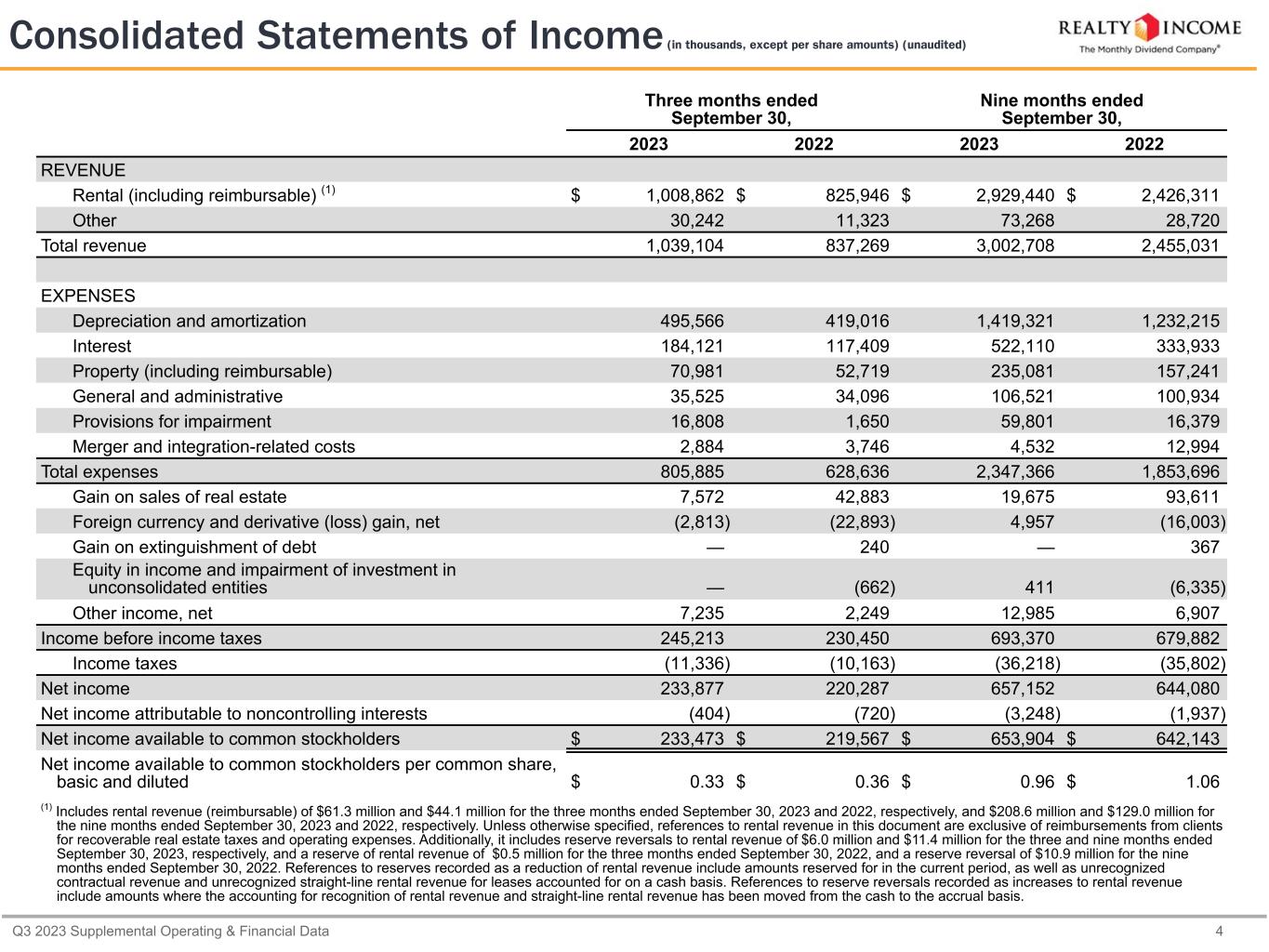 Q3 2023 Supplemental Operating & Financial Data 4 Three months ended September 30, Nine months ended September 30, 2023 2022 2023 2022 REVENUE Rental (including reimbursable) (1) $ 1,008,862 $ 825,946 $ 2,929,440 $ 2,426,311 Other 30,242 11,323 73,268 28,720 Total revenue 1,039,104 837,269 3,002,708 2,455,031 EXPENSES Depreciation and amortization 495,566 419,016 1,419,321 1,232,215 Interest 184,121 117,409 522,110 333,933 Property (including reimbursable) 70,981 52,719 235,081 157,241 General and administrative 35,525 34,096 106,521 100,934 Provisions for impairment 16,808 1,650 59,801 16,379 Merger and integration-related costs 2,884 3,746 4,532 12,994 Total expenses 805,885 628,636 2,347,366 1,853,696 Gain on sales of real estate 7,572 42,883 19,675 93,611 Foreign currency and derivative (loss) gain, net (2,813) (22,893) 4,957 (16,003) Gain on extinguishment of debt — 240 — 367 Equity in income and impairment of investment in unconsolidated entities — (662) 411 (6,335) Other income, net 7,235 2,249 12,985 6,907 Income before income taxes 245,213 230,450 693,370 679,882 Income taxes (11,336) (10,163) (36,218) (35,802) Net income 233,877 220,287 657,152 644,080 Net income attributable to noncontrolling interests (404) (720) (3,248) (1,937) Net income available to common stockholders $ 233,473 $ 219,567 $ 653,904 $ 642,143 Net income available to common stockholders per common share, basic and diluted $ 0.33 $ 0.36 $ 0.96 $ 1.06 (1) Includes rental revenue (reimbursable) of $61.3 million and $44.1 million for the three months ended September 30, 2023 and 2022, respectively, and $208.6 million and $129.0 million for the nine months ended September 30, 2023 and 2022, respectively. Unless otherwise specified, references to rental revenue in this document are exclusive of reimbursements from clients for recoverable real estate taxes and operating expenses. Additionally, it includes reserve reversals to rental revenue of $6.0 million and $11.4 million for the three and nine months ended September 30, 2023, respectively, and a reserve of rental revenue of $0.5 million for the three months ended September 30, 2022, and a reserve reversal of $10.9 million for the nine months ended September 30, 2022. References to reserves recorded as a reduction of rental revenue include amounts reserved for in the current period, as well as unrecognized contractual revenue and unrecognized straight-line rental revenue for leases accounted for on a cash basis. References to reserve reversals recorded as increases to rental revenue include amounts where the accounting for recognition of rental revenue and straight-line rental revenue has been moved from the cash to the accrual basis. Consolidated Statements of Income (in thousands, except per share amounts) (unaudited)