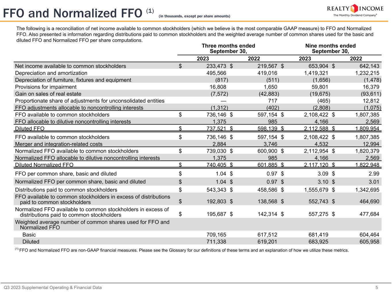 Q3 2023 Supplemental Operating & Financial Data 5 FFO and Normalized FFO (1) (in thousands, except per share amounts) The following is a reconciliation of net income available to common stockholders (which we believe is the most comparable GAAP measure) to FFO and Normalized FFO. Also presented is information regarding distributions paid to common stockholders and the weighted average number of common shares used for the basic and diluted FFO and Normalized FFO per share computations. Three months ended September 30, Nine months ended September 30, 2023 2022 2023 2022 Net income available to common stockholders $ 233,473 $ 219,567 $ 653,904 $ 642,143 Depreciation and amortization 495,566 419,016 1,419,321 1,232,215 Depreciation of furniture, fixtures and equipment (817) (511) (1,656) (1,478) Provisions for impairment 16,808 1,650 59,801 16,379 Gain on sales of real estate (7,572) (42,883) (19,675) (93,611) Proportionate share of adjustments for unconsolidated entities — 717 (465) 12,812 FFO adjustments allocable to noncontrolling interests (1,312) (402) (2,808) (1,075) FFO available to common stockholders $ 736,146 $ 597,154 $ 2,108,422 $ 1,807,385 FFO allocable to dilutive noncontrolling interests 1,375 985 4,166 2,569 Diluted FFO $ 737,521 $ 598,139 $ 2,112,588 $ 1,809,954 FFO available to common stockholders $ 736,146 $ 597,154 $ 2,108,422 $ 1,807,385 Merger and integration-related costs 2,884 3,746 4,532 12,994 Normalized FFO available to common stockholders $ 739,030 $ 600,900 $ 2,112,954 $ 1,820,379 Normalized FFO allocable to dilutive noncontrolling interests 1,375 985 4,166 2,569 Diluted Normalized FFO $ 740,405 $ 601,885 $ 2,117,120 $ 1,822,948 FFO per common share, basic and diluted $ 1.04 $ 0.97 $ 3.09 $ 2.99 Normalized FFO per common share, basic and diluted $ 1.04 $ 0.97 $ 3.10 $ 3.01 Distributions paid to common stockholders $ 543,343 $ 458,586 $ 1,555,679 $ 1,342,695 FFO available to common stockholders in excess of distributions paid to common stockholders $ 192,803 $ 138,568 $ 552,743 $ 464,690 Normalized FFO available to common stockholders in excess of distributions paid to common stockholders $ 195,687 $ 142,314 $ 557,275 $ 477,684 Weighted average number of common shares used for FFO and Normalized FFO Basic 709,165 617,512 681,419 604,464 Diluted 711,338 619,201 683,925 605,958 (1) FFO and Normalized FFO are non-GAAP financial measures. Please see the Glossary for our definitions of these terms and an explanation of how we utilize these metrics.