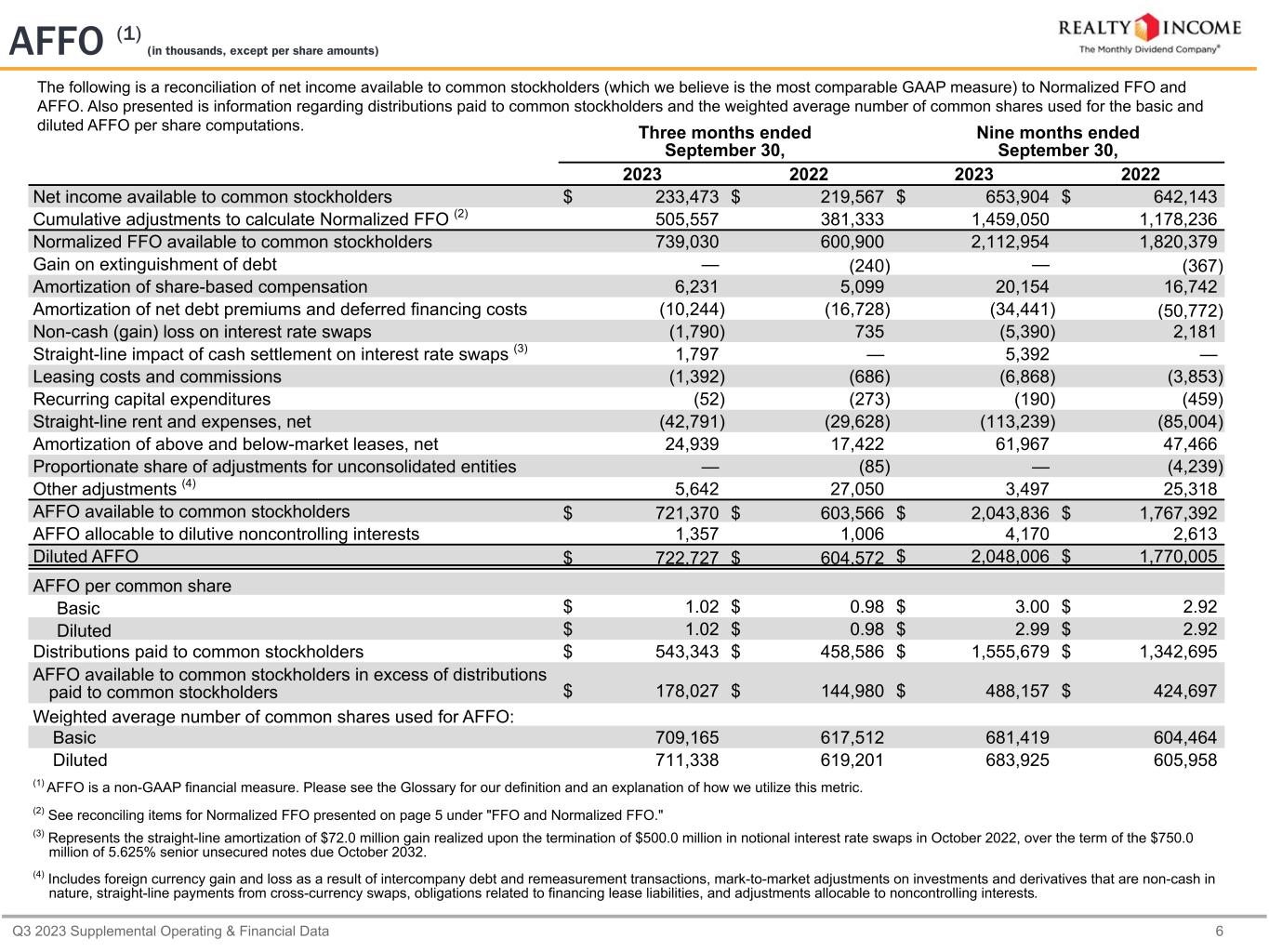Q3 2023 Supplemental Operating & Financial Data 6 The following is a reconciliation of net income available to common stockholders (which we believe is the most comparable GAAP measure) to Normalized FFO and AFFO. Also presented is information regarding distributions paid to common stockholders and the weighted average number of common shares used for the basic and diluted AFFO per share computations. Three months ended September 30, Nine months ended September 30, 2023 2022 2023 2022 Net income available to common stockholders $ 233,473 $ 219,567 $ 653,904 $ 642,143 Cumulative adjustments to calculate Normalized FFO (2) 505,557 381,333 1,459,050 1,178,236 Normalized FFO available to common stockholders 739,030 600,900 2,112,954 1,820,379 Gain on extinguishment of debt — (240) — (367) Amortization of share-based compensation 6,231 5,099 20,154 16,742 Amortization of net debt premiums and deferred financing costs (10,244) (16,728) (34,441) (50,772) Non-cash (gain) loss on interest rate swaps (1,790) 735 (5,390) 2,181 Straight-line impact of cash settlement on interest rate swaps (3) 1,797 — 5,392 — Leasing costs and commissions (1,392) (686) (6,868) (3,853) Recurring capital expenditures (52) (273) (190) (459) Straight-line rent and expenses, net (42,791) (29,628) (113,239) (85,004) Amortization of above and below-market leases, net 24,939 17,422 61,967 47,466 Proportionate share of adjustments for unconsolidated entities — (85) — (4,239) Other adjustments (4) 5,642 27,050 3,497 25,318 AFFO available to common stockholders $ 721,370 $ 603,566 $ 2,043,836 $ 1,767,392 AFFO allocable to dilutive noncontrolling interests 1,357 1,006 4,170 2,613 Diluted AFFO $ 722,727 $ 604,572 $ 2,048,006 $ 1,770,005 AFFO per common share Basic $ 1.02 $ 0.98 $ 3.00 $ 2.92 Diluted $ 1.02 $ 0.98 $ 2.99 $ 2.92 Distributions paid to common stockholders $ 543,343 $ 458,586 $ 1,555,679 $ 1,342,695 AFFO available to common stockholders in excess of distributions paid to common stockholders $ 178,027 $ 144,980 $ 488,157 $ 424,697 Weighted average number of common shares used for AFFO: Basic 709,165 617,512 681,419 604,464 Diluted 711,338 619,201 683,925 605,958 (1) AFFO is a non-GAAP financial measure. Please see the Glossary for our definition and an explanation of how we utilize this metric. (2) See reconciling items for Normalized FFO presented on page 5 under "FFO and Normalized FFO." (3) Represents the straight-line amortization of $72.0 million gain realized upon the termination of $500.0 million in notional interest rate swaps in October 2022, over the term of the $750.0 million of 5.625% senior unsecured notes due October 2032. (4) Includes foreign currency gain and loss as a result of intercompany debt and remeasurement transactions, mark-to-market adjustments on investments and derivatives that are non-cash in nature, straight-line payments from cross-currency swaps, obligations related to financing lease liabilities, and adjustments allocable to noncontrolling interests. AFFO (1) (in thousands, except per share amounts)