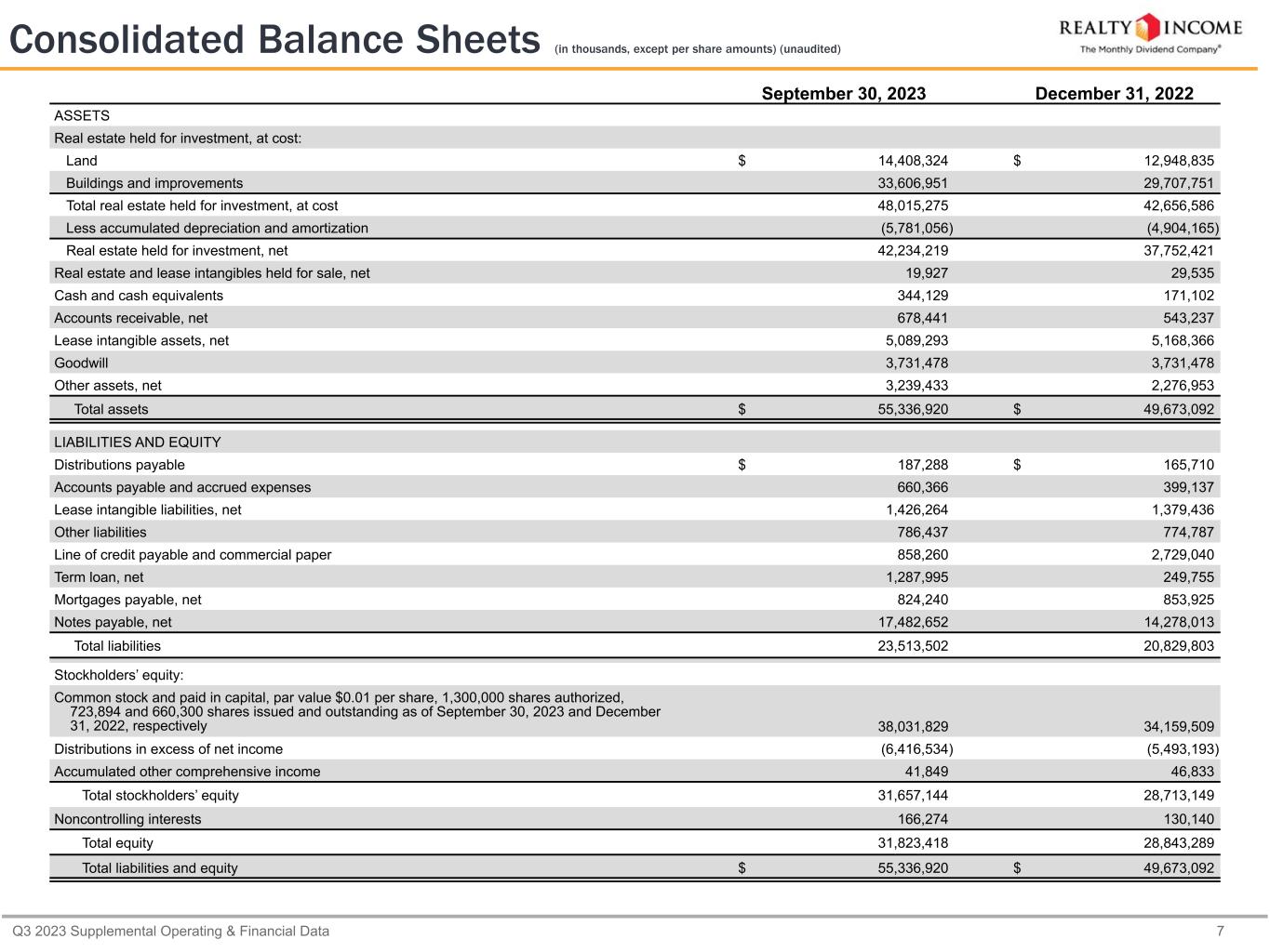 Q3 2023 Supplemental Operating & Financial Data 7 Consolidated Balance Sheets (in thousands, except per share amounts) (unaudited) September 30, 2023 December 31, 2022 ASSETS Real estate held for investment, at cost: Land $ 14,408,324 $ 12,948,835 Buildings and improvements 33,606,951 29,707,751 Total real estate held for investment, at cost 48,015,275 42,656,586 Less accumulated depreciation and amortization (5,781,056) (4,904,165) Real estate held for investment, net 42,234,219 37,752,421 Real estate and lease intangibles held for sale, net 19,927 29,535 Cash and cash equivalents 344,129 171,102 Accounts receivable, net 678,441 543,237 Lease intangible assets, net 5,089,293 5,168,366 Goodwill 3,731,478 3,731,478 Other assets, net 3,239,433 2,276,953 Total assets $ 55,336,920 $ 49,673,092 LIABILITIES AND EQUITY Distributions payable $ 187,288 $ 165,710 Accounts payable and accrued expenses 660,366 399,137 Lease intangible liabilities, net 1,426,264 1,379,436 Other liabilities 786,437 774,787 Line of credit payable and commercial paper 858,260 2,729,040 Term loan, net 1,287,995 249,755 Mortgages payable, net 824,240 853,925 Notes payable, net 17,482,652 14,278,013 Total liabilities 23,513,502 20,829,803 Stockholders’ equity: Common stock and paid in capital, par value $0.01 per share, 1,300,000 shares authorized, 723,894 and 660,300 shares issued and outstanding as of September 30, 2023 and December 31, 2022, respectively 38,031,829 34,159,509 Distributions in excess of net income (6,416,534) (5,493,193) Accumulated other comprehensive income 41,849 46,833 Total stockholders’ equity 31,657,144 28,713,149 Noncontrolling interests 166,274 130,140 Total equity 31,823,418 28,843,289 Total liabilities and equity $ 55,336,920 $ 49,673,092
