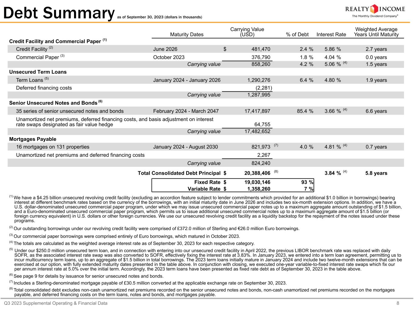 Q3 2023 Supplemental Operating & Financial Data 8 Debt Summary as of September 30, 2023 (dollars in thousands) Maturity Dates Carrying Value (USD) % of Debt Interest Rate Weighted Average Years Until Maturity Credit Facility and Commercial Paper (1) Credit Facility (2) June 2026 $ 481,470 2.4 % 5.86 % 2.7 years Commercial Paper (3) October 2023 376,790 1.8 % 4.04 % 0.0 years Carrying value 858,260 4.2 % 5.06 % (4) 1.5 years Unsecured Term Loans Term Loans (5) January 2024 - January 2026 1,290,276 6.4 % 4.80 % 1.9 years Deferred financing costs (2,281) Carrying value 1,287,995 Senior Unsecured Notes and Bonds (6) 35 series of senior unsecured notes and bonds February 2024 - March 2047 17,417,897 85.4 % 3.66 % (4) 6.6 years Unamortized net premiums, deferred financing costs, and basis adjustment on interest rate swaps designated as fair value hedge 64,755 Carrying value 17,482,652 Mortgages Payable 16 mortgages on 131 properties January 2024 - August 2030 821,973 (7) 4.0 % 4.81 % (4) 0.7 years Unamortized net premiums and deferred financing costs 2,267 Carrying value 824,240 Total Consolidated Debt Principal $ 20,388,406 (8) 3.84 % (4) 5.8 years Fixed Rate $ 19,030,146 93 % Variable Rate $ 1,358,260 7 % (1) We have a $4.25 billion unsecured revolving credit facility (excluding an accordion feature subject to lender commitments which provided for an additional $1.0 billion in borrowings) bearing interest at different benchmark rates based on the currency of the borrowings, with an initial maturity date in June 2026 and includes two six-month extension options. In addition, we have a U.S. dollar-denominated unsecured commercial paper program, under which we may issue unsecured commercial paper notes up to a maximum aggregate amount outstanding of $1.5 billion, and a Euro-denominated unsecured commercial paper program, which permits us to issue additional unsecured commercial notes up to a maximum aggregate amount of $1.5 billion (or foreign currency equivalent) in U.S. dollars or other foreign currencies. We use our unsecured revolving credit facility as a liquidity backstop for the repayment of the notes issued under these programs. (2) Our outstanding borrowings under our revolving credit facility were comprised of £372.0 million of Sterling and €26.0 million Euro borrowings. (3) Our commercial paper borrowings were comprised entirely of Euro borrowings, which matured in October 2023. (4) The totals are calculated as the weighted average interest rate as of September 30, 2023 for each respective category. (5) Under our $250.0 million unsecured term loan, and in connection with entering into our unsecured credit facility in April 2022, the previous LIBOR benchmark rate was replaced with daily SOFR, as the associated interest rate swap was also converted to SOFR, effectively fixing the interest rate at 3.83%. In January 2023, we entered into a term loan agreement, permitting us to incur multicurrency term loans, up to an aggregate of $1.5 billion in total borrowings. The 2023 term loans initially mature in January 2024 and include two twelve-month extensions that can be exercised at our option, with fully extended maturity dates presented in the table above. In conjunction with closing, we executed one-year variable-to-fixed interest rate swaps which fix our per annum interest rate at 5.0% over the initial term. Accordingly, the 2023 term loans have been presented as fixed rate debt as of September 30, 2023 in the table above. (6) See page 9 for details by issuance for senior unsecured notes and bonds. (7) Includes a Sterling-denominated mortgage payable of £30.5 million converted at the applicable exchange rate on September 30, 2023. (8) Total consolidated debt excludes non-cash unamortized net premiums recorded on the senior unsecured notes and bonds, non-cash unamortized net premiums recorded on the mortgages payable, and deferred financing costs on the term loans, notes and bonds, and mortgages payable.