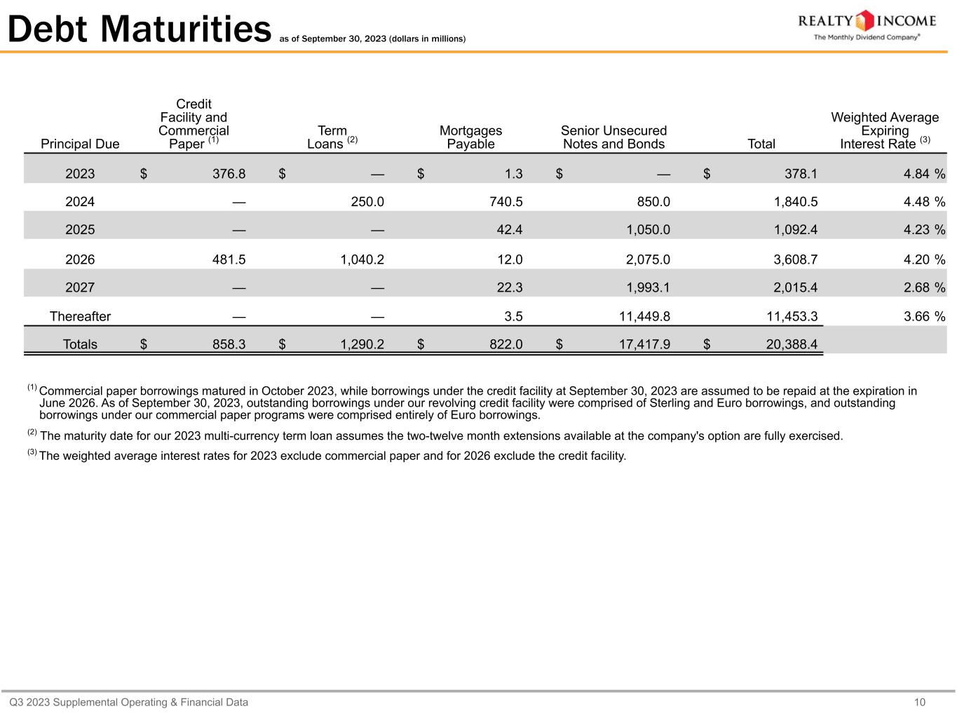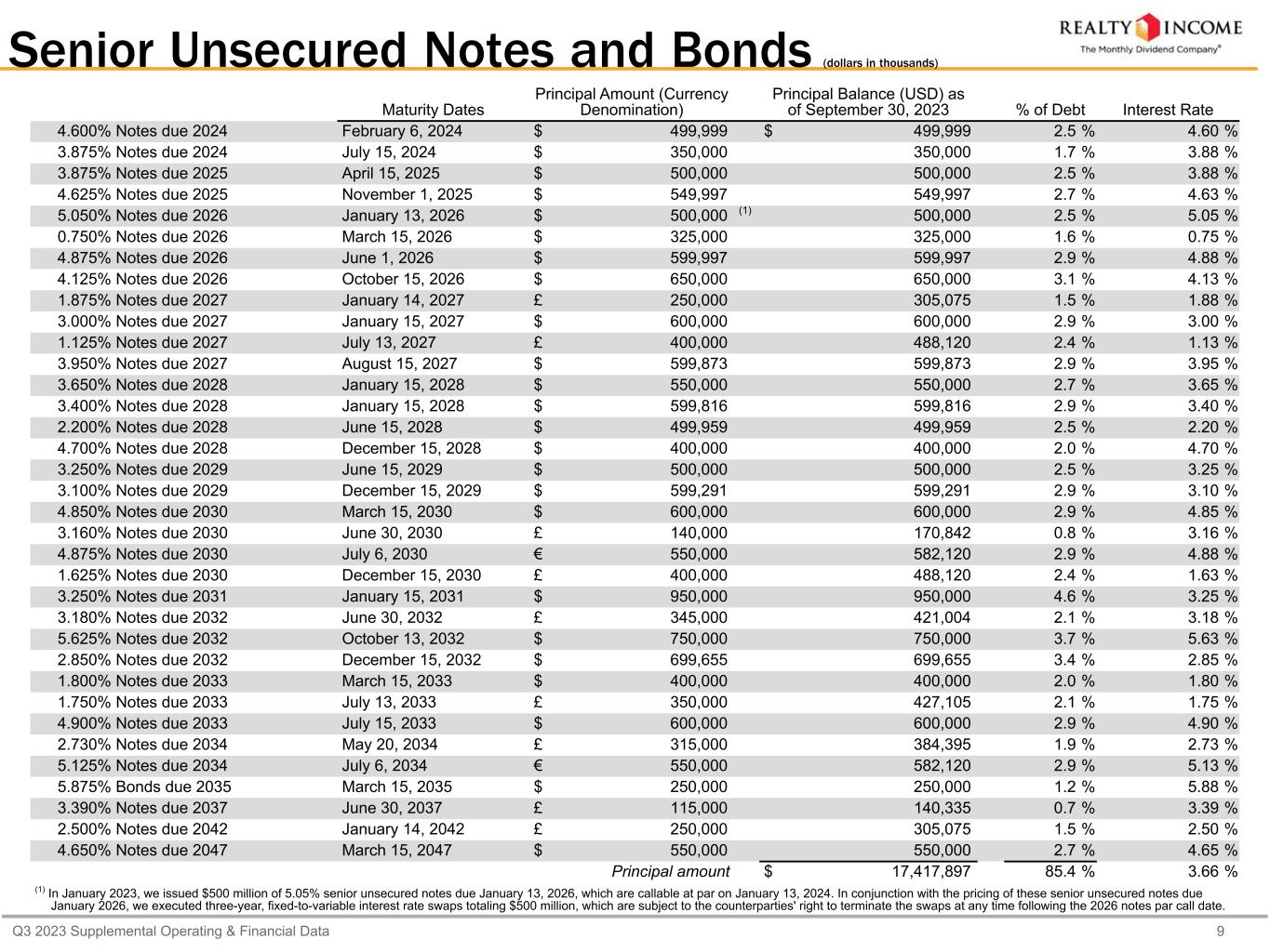 Q3 2023 Supplemental Operating & Financial Data 9 Senior Unsecured Notes and Bonds (dollars in thousands) Maturity Dates Principal Amount (Currency Denomination) Principal Balance (USD) as of September 30, 2023 % of Debt Interest Rate 4.600% Notes due 2024 February 6, 2024 $ 499,999 $ 499,999 2.5 % 4.60 % 3.875% Notes due 2024 July 15, 2024 $ 350,000 350,000 1.7 % 3.88 % 3.875% Notes due 2025 April 15, 2025 $ 500,000 500,000 2.5 % 3.88 % 4.625% Notes due 2025 November 1, 2025 $ 549,997 549,997 2.7 % 4.63 % 5.050% Notes due 2026 January 13, 2026 $ 500,000 (1) 500,000 2.5 % 5.05 % 0.750% Notes due 2026 March 15, 2026 $ 325,000 325,000 1.6 % 0.75 % 4.875% Notes due 2026 June 1, 2026 $ 599,997 599,997 2.9 % 4.88 % 4.125% Notes due 2026 October 15, 2026 $ 650,000 650,000 3.1 % 4.13 % 1.875% Notes due 2027 January 14, 2027 £ 250,000 305,075 1.5 % 1.88 % 3.000% Notes due 2027 January 15, 2027 $ 600,000 600,000 2.9 % 3.00 % 1.125% Notes due 2027 July 13, 2027 £ 400,000 488,120 2.4 % 1.13 % 3.950% Notes due 2027 August 15, 2027 $ 599,873 599,873 2.9 % 3.95 % 3.650% Notes due 2028 January 15, 2028 $ 550,000 550,000 2.7 % 3.65 % 3.400% Notes due 2028 January 15, 2028 $ 599,816 599,816 2.9 % 3.40 % 2.200% Notes due 2028 June 15, 2028 $ 499,959 499,959 2.5 % 2.20 % 4.700% Notes due 2028 December 15, 2028 $ 400,000 400,000 2.0 % 4.70 % 3.250% Notes due 2029 June 15, 2029 $ 500,000 500,000 2.5 % 3.25 % 3.100% Notes due 2029 December 15, 2029 $ 599,291 599,291 2.9 % 3.10 % 4.850% Notes due 2030 March 15, 2030 $ 600,000 600,000 2.9 % 4.85 % 3.160% Notes due 2030 June 30, 2030 £ 140,000 170,842 0.8 % 3.16 % 4.875% Notes due 2030 July 6, 2030 € 550,000 582,120 2.9 % 4.88 % 1.625% Notes due 2030 December 15, 2030 £ 400,000 488,120 2.4 % 1.63 % 3.250% Notes due 2031 January 15, 2031 $ 950,000 950,000 4.6 % 3.25 % 3.180% Notes due 2032 June 30, 2032 £ 345,000 421,004 2.1 % 3.18 % 5.625% Notes due 2032 October 13, 2032 $ 750,000 750,000 3.7 % 5.63 % 2.850% Notes due 2032 December 15, 2032 $ 699,655 699,655 3.4 % 2.85 % 1.800% Notes due 2033 March 15, 2033 $ 400,000 400,000 2.0 % 1.80 % 1.750% Notes due 2033 July 13, 2033 £ 350,000 427,105 2.1 % 1.75 % 4.900% Notes due 2033 July 15, 2033 $ 600,000 600,000 2.9 % 4.90 % 2.730% Notes due 2034 May 20, 2034 £ 315,000 384,395 1.9 % 2.73 % 5.125% Notes due 2034 July 6, 2034 € 550,000 582,120 2.9 % 5.13 % 5.875% Bonds due 2035 March 15, 2035 $ 250,000 250,000 1.2 % 5.88 % 3.390% Notes due 2037 June 30, 2037 £ 115,000 140,335 0.7 % 3.39 % 2.500% Notes due 2042 January 14, 2042 £ 250,000 305,075 1.5 % 2.50 % 4.650% Notes due 2047 March 15, 2047 $ 550,000 550,000 2.7 % 4.65 % Principal amount $ 17,417,897 85.4 % 3.66 % (1) In January 2023, we issued $500 million of 5.05% senior unsecured notes due January 13, 2026, which are callable at par on January 13, 2024. In conjunction with the pricing of these senior unsecured notes due January 2026, we executed three-year, fixed-to-variable interest rate swaps totaling $500 million, which are subject to the counterparties' right to terminate the swaps at any time following the 2026 notes par call date.
