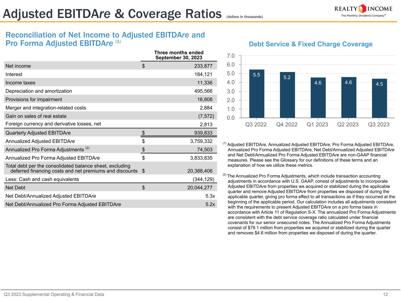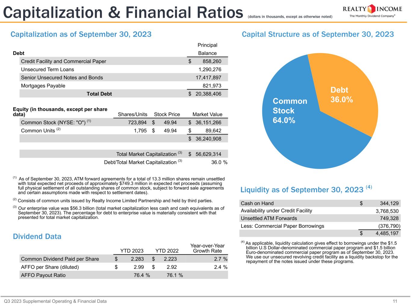 Q3 2023 Supplemental Operating & Financial Data 11 Capitalization & Financial Ratios (dollars in thousands, except as otherwise noted) Cash on Hand $ 344,129 Availability under Credit Facility 3,768,530 Unsettled ATM Forwards 749,328 Less: Commercial Paper Borrowings (376,790) $ 4,485,197 (4) As applicable, liquidity calculation gives effect to borrowings under the $1.5 billion U.S Dollar-denominated commercial paper program and $1.5 billion Euro-denominated commercial paper program as of September 30, 2023. We use our unsecured revolving credit facility as a liquidity backstop for the repayment of the notes issued under these programs. Principal Debt Balance Credit Facility and Commercial Paper $ 858,260 Unsecured Term Loans 1,290,276 Senior Unsecured Notes and Bonds 17,417,897 Mortgages Payable 821,973 Total Debt $ 20,388,406 Equity (in thousands, except per share data) Shares/Units Stock Price Market Value Common Stock (NYSE: "O") (1) 723,894 $ 49.94 $ 36,151,266 Common Units (2) 1,795 $ 49.94 $ 89,642 $ 36,240,908 Total Market Capitalization (3) $ 56,629,314 Debt/Total Market Capitalization (3) 36.0 % (1) As of September 30, 2023, ATM forward agreements for a total of 13.3 million shares remain unsettled with total expected net proceeds of approximately $749.3 million in expected net proceeds (assuming full physical settlement of all outstanding shares of common stock, subject to forward sale agreements and certain assumptions made with respect to settlement dates). (2) Consists of common units issued by Realty Income Limited Partnership and held by third parties. (3) Our enterprise value was $56.3 billion (total market capitalization less cash and cash equivalents as of September 30, 2023). The percentage for debt to enterprise value is materially consistent with that presented for total market capitalization. Dividend Data YTD 2023 YTD 2022 Year-over-Year Growth Rate Common Dividend Paid per Share $ 2.283 $ 2.223 2.7 % AFFO per Share (diluted) $ 2.99 $ 2.92 2.4 % AFFO Payout Ratio 76.4 % 76.1 % Liquidity as of September 30, 2023 (4) Capitalization as of September 30, 2023 Capital Structure as of September 30, 2023 Common Stock 64.0% Debt 36.0%