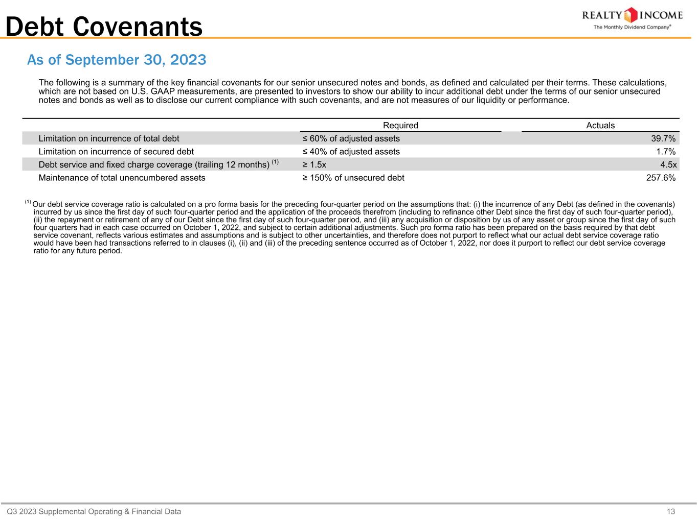 Q3 2023 Supplemental Operating & Financial Data 13 Debt Covenants The following is a summary of the key financial covenants for our senior unsecured notes and bonds, as defined and calculated per their terms. These calculations, which are not based on U.S. GAAP measurements, are presented to investors to show our ability to incur additional debt under the terms of our senior unsecured notes and bonds as well as to disclose our current compliance with such covenants, and are not measures of our liquidity or performance. Required Actuals Limitation on incurrence of total debt ≤ 60% of adjusted assets 39.7% Limitation on incurrence of secured debt ≤ 40% of adjusted assets 1.7% Debt service and fixed charge coverage (trailing 12 months) (1) ≥ 1.5x 4.5x Maintenance of total unencumbered assets ≥ 150% of unsecured debt 257.6% (1) Our debt service coverage ratio is calculated on a pro forma basis for the preceding four-quarter period on the assumptions that: (i) the incurrence of any Debt (as defined in the covenants) incurred by us since the first day of such four-quarter period and the application of the proceeds therefrom (including to refinance other Debt since the first day of such four-quarter period), (ii) the repayment or retirement of any of our Debt since the first day of such four-quarter period, and (iii) any acquisition or disposition by us of any asset or group since the first day of such four quarters had in each case occurred on October 1, 2022, and subject to certain additional adjustments. Such pro forma ratio has been prepared on the basis required by that debt service covenant, reflects various estimates and assumptions and is subject to other uncertainties, and therefore does not purport to reflect what our actual debt service coverage ratio would have been had transactions referred to in clauses (i), (ii) and (iii) of the preceding sentence occurred as of October 1, 2022, nor does it purport to reflect our debt service coverage ratio for any future period. As of September 30, 2023