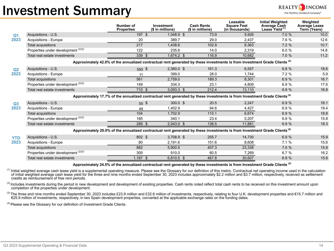 Q3 2023 Supplemental Operating & Financial Data 14 Investment Summary Number of Properties Investment ($ in millions) Cash Rents ($ in millions) Leasable Square Feet (in thousands) Initial Weighted Average Cash Lease Yield (1) Weighted Average Lease Term (Years) Q1 2023 Acquisitions - U.S. 197 $ 1,048.9 $ 73.9 5,926 7.0 % 10.0 Acquisitions - Europe 20 389.7 29.0 2,437 7.6 % 12.6 Total acquisitions 217 1,438.6 102.9 8,363 7.2 % 10.7 Properties under development (2)(3) 122 235.6 14.0 2,319 6.0 % 14.8 Total real estate investments 339 $ 1,674.2 $ 116.9 10,682 7.0 % 11.2 Approximately 42.0% of the annualized contractual rent generated by these investments is from Investment Grade Clients (4) Q2 2023 Acquisitions - U.S. 550 $ 2,360.0 $ 161.3 6,557 6.8 % 18.6 Acquisitions - Europe 11 399.0 28.0 1,744 7.2 % 5.9 Total acquisitions 561 2,759.0 189.3 8,301 6.9 % 16.7 Properties under development (2)(3) 149 334.3 23.1 4,809 6.9 % 17.6 Total real estate investments 710 $ 3,093.3 $ 212.4 13,110 6.9 % 16.8 Approximately 17.7% of the annualized contractual rent generated by these investments is from Investment Grade Clients (4) Q3 2023 Acquisitions - U.S. 55 $ 300.0 $ 20.5 2,247 6.9 % 16.1 Acquisitions - Europe 49 1,402.9 94.6 4,427 6.9 % 19.4 Total acquisitions 104 1,702.9 115.1 6,674 6.9 % 18.8 Properties under development (2)(3) 185 340.1 23.4 5,207 6.9 % 15.8 Total real estate investments 289 $ 2,043.0 $ 138.5 11,881 6.9 % 18.3 Approximately 20.0% of the annualized contractual rent generated by these investments is from Investment Grade Clients (4) YTD 2023 Acquisitions - U.S. 802 $ 3,708.9 $ 255.7 14,730 6.9 % 15.9 Acquisitions - Europe 80 2,191.6 151.6 8,608 7.1 % 15.6 Total acquisitions 882 5,900.5 407.3 23,338 7.0 % 15.8 Properties under development (2)(3) 305 910.0 60.5 7,269 6.7 % 16.2 Total real estate investments 1,187 $ 6,810.5 $ 467.8 30,607 6.9 % 15.8 Approximately 24.5% of the annualized contractual rent generated by these investments is from Investment Grade Clients (4) (1) Initial weighted average cash lease yield is a supplemental operating measure. Please see the Glossary for our definition of this metric. Contractual net operating income used in the calculation of initial weighted average cash lease yield for the three and nine months ended September 30, 2023 includes approximately $2.2 million and $3.7 million, respectively, received as settlement credits as reimbursement of free rent periods. (2) Includes investments during the period in new development and development of existing properties. Cash rents noted reflect total cash rents to be received on this investment amount upon completion of the properties under development. (3) The three and nine months ended September 30, 2023 includes £23.9 million and £32.6 million of investments, respectively, relating to four U.K. development properties and €15.7 million and €25.9 million of investments, respectively, in two Spain development properties, converted at the applicable exchange rates on the funding dates. (4) Please see the Glossary for our definition of Investment Grade Clients.