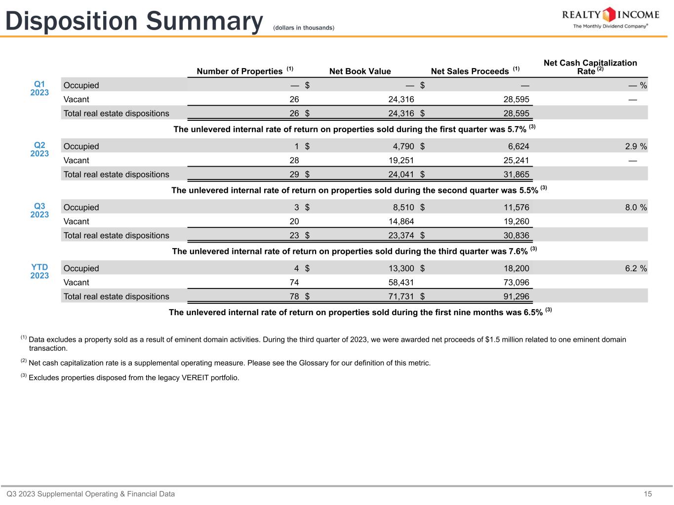 Q3 2023 Supplemental Operating & Financial Data 15 Disposition Summary (dollars in thousands) Number of Properties (1) Net Book Value Net Sales Proceeds (1) Net Cash Capitalization Rate (2) Q1 2023 Occupied — $ — $ — — % Vacant 26 24,316 28,595 — Total real estate dispositions 26 $ 24,316 $ 28,595 The unlevered internal rate of return on properties sold during the first quarter was 5.7% (3) Q2 2023 Occupied 1 $ 4,790 $ 6,624 2.9 % Vacant 28 19,251 25,241 — Total real estate dispositions 29 $ 24,041 $ 31,865 The unlevered internal rate of return on properties sold during the second quarter was 5.5% (3) Q3 2023 Occupied 3 $ 8,510 $ 11,576 8.0 % Vacant 20 14,864 19,260 Total real estate dispositions 23 $ 23,374 $ 30,836 The unlevered internal rate of return on properties sold during the third quarter was 7.6% (3) YTD 2023 Occupied 4 $ 13,300 $ 18,200 6.2 % Vacant 74 58,431 73,096 Total real estate dispositions 78 $ 71,731 $ 91,296 The unlevered internal rate of return on properties sold during the first nine months was 6.5% (3) (1) Data excludes a property sold as a result of eminent domain activities. During the third quarter of 2023, we were awarded net proceeds of $1.5 million related to one eminent domain transaction. (2) Net cash capitalization rate is a supplemental operating measure. Please see the Glossary for our definition of this metric. (3) Excludes properties disposed from the legacy VEREIT portfolio.