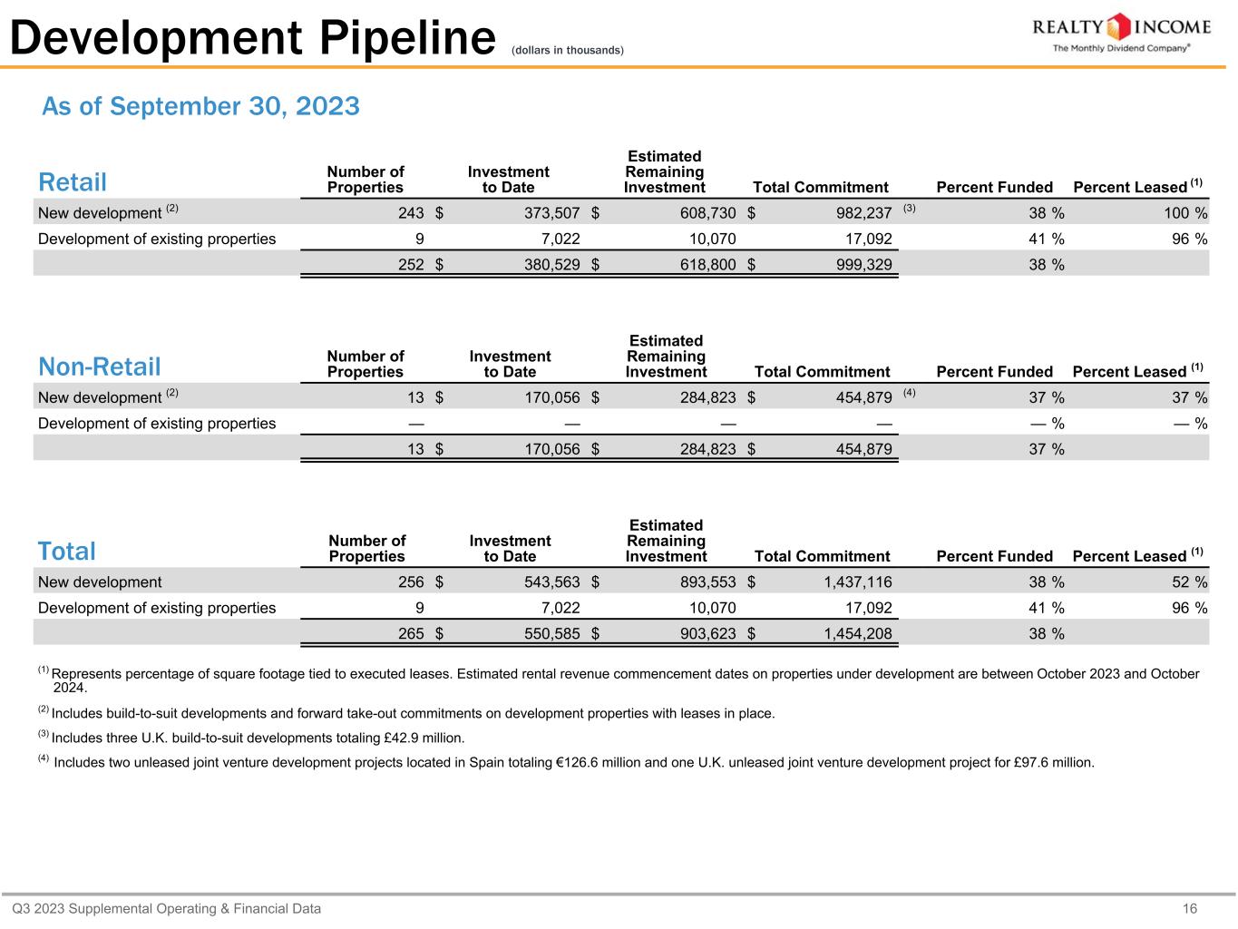 Q3 2023 Supplemental Operating & Financial Data 16 Development Pipeline (dollars in thousands) Retail Number of Properties Investment to Date Estimated Remaining Investment Total Commitment Percent Funded Percent Leased (1) New development (2) 243 $ 373,507 $ 608,730 $ 982,237 (3) 38 % 100 % Development of existing properties 9 7,022 10,070 17,092 41 % 96 % 252 $ 380,529 $ 618,800 $ 999,329 38 % Non-Retail Number of Properties Investment to Date Estimated Remaining Investment Total Commitment Percent Funded Percent Leased (1) New development (2) 13 $ 170,056 $ 284,823 $ 454,879 (4) 37 % 37 % Development of existing properties — — — — — % — % 13 $ 170,056 $ 284,823 $ 454,879 37 % Total Number of Properties Investment to Date Estimated Remaining Investment Total Commitment Percent Funded Percent Leased (1) New development 256 $ 543,563 $ 893,553 $ 1,437,116 38 % 52 % Development of existing properties 9 7,022 10,070 17,092 41 % 96 % 265 $ 550,585 $ 903,623 $ 1,454,208 38 % (1) Represents percentage of square footage tied to executed leases. Estimated rental revenue commencement dates on properties under development are between October 2023 and October 2024. (2) Includes build-to-suit developments and forward take-out commitments on development properties with leases in place. (3) Includes three U.K. build-to-suit developments totaling £42.9 million. (4) Includes two unleased joint venture development projects located in Spain totaling €126.6 million and one U.K. unleased joint venture development project for £97.6 million. As of September 30, 2023