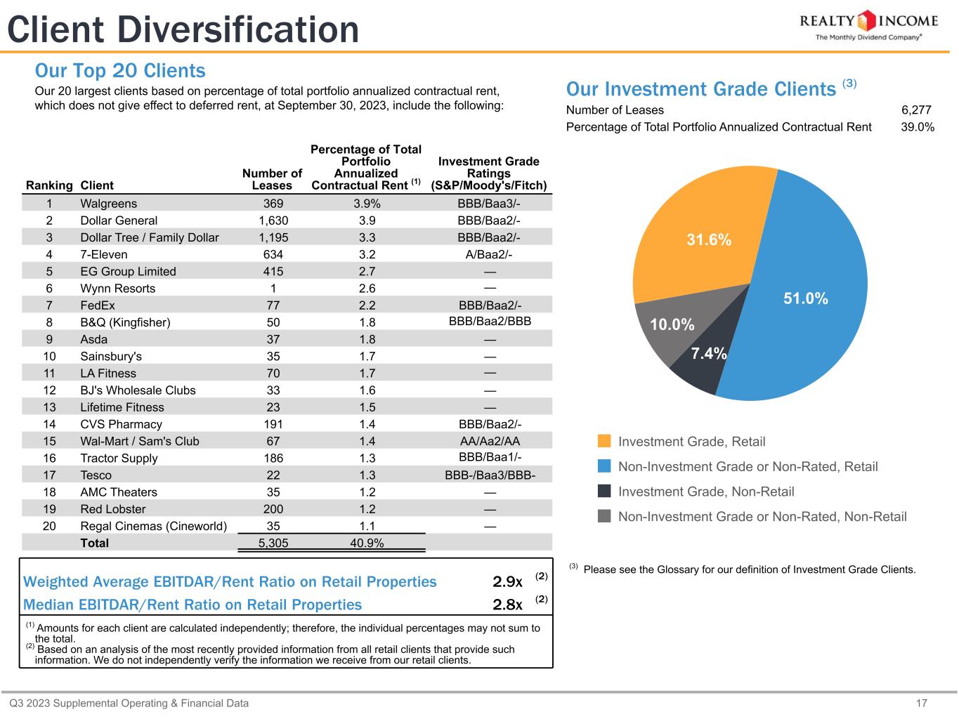Q3 2023 Supplemental Operating & Financial Data 17 Our Top 20 Clients Our 20 largest clients based on percentage of total portfolio annualized contractual rent, which does not give effect to deferred rent, at September 30, 2023, include the following: Our Investment Grade Clients (3) Number of Leases 6,277 Percentage of Total Portfolio Annualized Contractual Rent 39.0% Weighted Average EBITDAR/Rent Ratio on Retail Properties 2.9x (2) Median EBITDAR/Rent Ratio on Retail Properties 2.8x (2) (1) Amounts for each client are calculated independently; therefore, the individual percentages may not sum to the total. (2) Based on an analysis of the most recently provided information from all retail clients that provide such information. We do not independently verify the information we receive from our retail clients. Client Diversification Ranking Client Number of Leases Percentage of Total Portfolio Annualized Contractual Rent (1) Investment Grade Ratings (S&P/Moody's/Fitch) 1 Walgreens 369 3.9% BBB/Baa3/- 2 Dollar General 1,630 3.9 BBB/Baa2/- 3 Dollar Tree / Family Dollar 1,195 3.3 BBB/Baa2/- 4 7-Eleven 634 3.2 A/Baa2/- 5 EG Group Limited 415 2.7 — 6 Wynn Resorts 1 2.6 — 7 FedEx 77 2.2 BBB/Baa2/- 8 B&Q (Kingfisher) 50 1.8 BBB/Baa2/BBB 9 Asda 37 1.8 — 10 Sainsbury's 35 1.7 — 11 LA Fitness 70 1.7 — 12 BJ's Wholesale Clubs 33 1.6 — 13 Lifetime Fitness 23 1.5 — 14 CVS Pharmacy 191 1.4 BBB/Baa2/- 15 Wal-Mart / Sam's Club 67 1.4 AA/Aa2/AA 16 Tractor Supply 186 1.3 BBB/Baa1/- 17 Tesco 22 1.3 BBB-/Baa3/BBB- 18 AMC Theaters 35 1.2 — 19 Red Lobster 200 1.2 — 20 Regal Cinemas (Cineworld) 35 1.1 — Total 5,305 40.9% (3) Please see the Glossary for our definition of Investment Grade Clients. 31.6% 51.0% 7.4% 10.0% Investment Grade, Retail Non-Investment Grade or Non-Rated, Retail Investment Grade, Non-Retail Non-Investment Grade or Non-Rated, Non-Retail