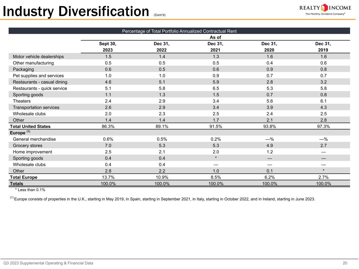 Q3 2023 Supplemental Operating & Financial Data 18 (1)Top 10 Industries Percentage of Total Portfolio Annualized Contractual Rent As of Sept 30, Dec 31, Dec 31, Dec 31, Dec 31, 2023 2022 2021 2020 2019 Grocery 11.4% 10.0% 10.2% 9.8% 7.9% Convenience Stores 10.6 8.6 9.1 11.9 12.3 Dollar Stores 7.2 7.4 7.5 7.6 7.9 Drug Stores 5.9 5.7 6.6 8.2 8.8 Home Improvement 5.8 5.6 5.1 4.3 2.9 Restaurants-Quick Service 5.3 6.0 6.6 5.3 5.8 Restaurants-Casual Dining 4.6 5.1 5.9 2.8 3.2 Automotive Service 4.2 4.0 3.2 2.7 2.6 Health and Fitness 4.1 4.4 4.7 6.7 7.0 General Merchandise 3.7 3.7 3.7 3.4 2.5 (1) The presentation of Top 10 Industries combines total portfolio contractual rent from the U.S. and Europe. Europe consists of properties in the U.K., starting in May 2019, in Spain, starting in September 2021, in Italy, starting in October 2022, and in Ireland, starting in June 2023. Certain of the Top 10 Industries include both U.S. and Europe percentages for which the Europe percentages are included in the 'Europe-other' classification in the Industry Diversification table beginning on page 19.