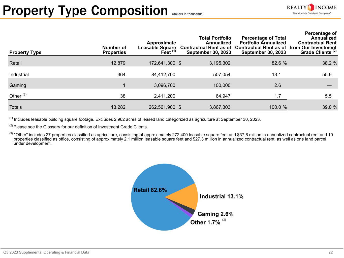 Q3 2023 Supplemental Operating & Financial Data 22 Property Type Composition (dollars in thousands) Property Type Number of Properties Approximate Leasable Square Feet (1) Total Portfolio Annualized Contractual Rent as of September 30, 2023 Percentage of Total Portfolio Annualized Contractual Rent as of September 30, 2023 Percentage of Annualized Contractual Rent from Our Investment Grade Clients (2) Retail 12,879 172,641,300 $ 3,195,302 82.6 % 38.2 % Industrial 364 84,412,700 507,054 13.1 55.9 Gaming 1 3,096,700 100,000 2.6 — Other (3) 38 2,411,200 64,947 1.7 5.5 Totals 13,282 262,561,900 $ 3,867,303 100.0 % 39.0 % (1) Includes leasable building square footage. Excludes 2,962 acres of leased land categorized as agriculture at September 30, 2023. (2) Please see the Glossary for our definition of Investment Grade Clients. (3) "Other" includes 27 properties classified as agriculture, consisting of approximately 272,400 leasable square feet and $37.6 million in annualized contractual rent and 10 properties classified as office, consisting of approximately 2.1 million leasable square feet and $27.3 million in annualized contractual rent, as well as one land parcel under development. Retail 82.6% Industrial 13.1% Gaming 2.6% Other 1.7% (3)