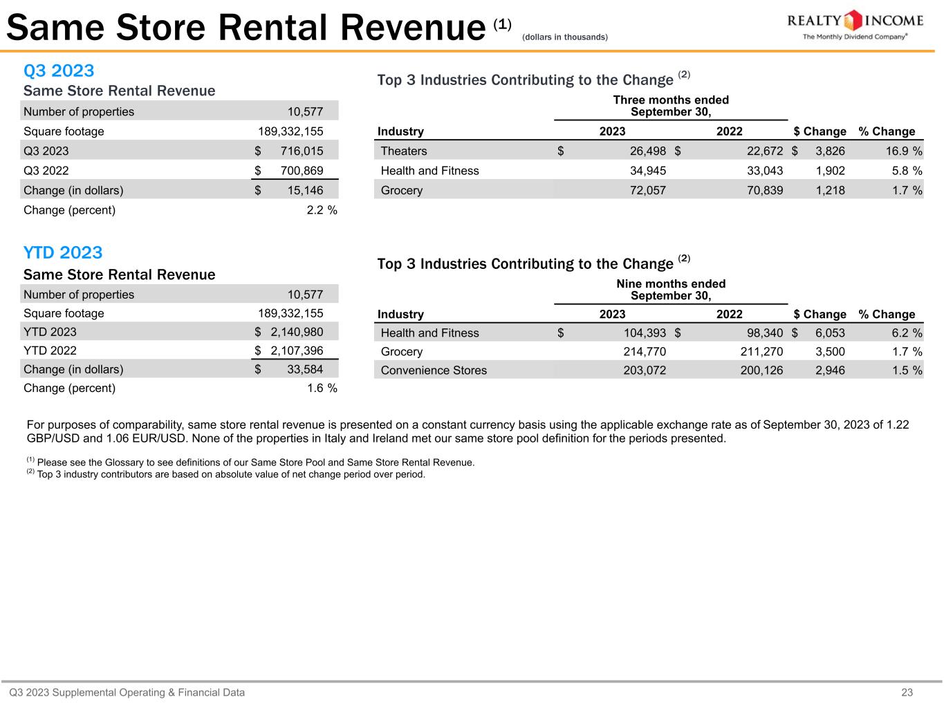 Q3 2023 Supplemental Operating & Financial Data 23 Q3 2023 Same Store Rental Revenue Number of properties 10,577 Square footage 189,332,155 Q3 2023 $ 716,015 Q3 2022 $ 700,869 Change (in dollars) $ 15,146 Change (percent) 2.2 % YTD 2023 Same Store Rental Revenue Number of properties 10,577 Square footage 189,332,155 YTD 2023 $ 2,140,980 YTD 2022 $ 2,107,396 Change (in dollars) $ 33,584 Change (percent) 1.6 % Same Store Rental Revenue (1) (dollars in thousands) Top 3 Industries Contributing to the Change (2) Three months ended September 30, Industry 2023 2022 $ Change % Change Theaters $ 26,498 $ 22,672 $ 3,826 16.9 % Health and Fitness 34,945 33,043 1,902 5.8 % Grocery 72,057 70,839 1,218 1.7 % Top 3 Industries Contributing to the Change (2) Nine months ended September 30, Industry 2023 2022 $ Change % Change Health and Fitness $ 104,393 $ 98,340 $ 6,053 6.2 % Grocery 214,770 211,270 3,500 1.7 % Convenience Stores 203,072 200,126 2,946 1.5 % For purposes of comparability, same store rental revenue is presented on a constant currency basis using the applicable exchange rate as of September 30, 2023 of 1.22 GBP/USD and 1.06 EUR/USD. None of the properties in Italy and Ireland met our same store pool definition for the periods presented. (1) Please see the Glossary to see definitions of our Same Store Pool and Same Store Rental Revenue. (2) Top 3 industry contributors are based on absolute value of net change period over period.