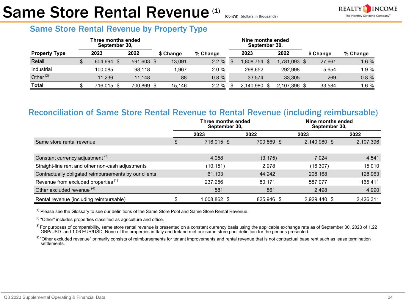 Q3 2023 Supplemental Operating & Financial Data 24 Same Store Rental Revenue (1) (Cont'd) (dollars in thousands) Three months ended September 30, Nine months ended September 30, Property Type 2023 2022 $ Change % Change 2023 2022 $ Change % Change Retail $ 604,694 $ 591,603 $ 13,091 2.2 % $ 1,808,754 $ 1,781,093 $ 27,661 1.6 % Industrial 100,085 98,118 1,967 2.0 % 298,652 292,998 5,654 1.9 % Other (2) 11,236 11,148 88 0.8 % 33,574 33,305 269 0.8 % Total $ 716,015 $ 700,869 $ 15,146 2.2 % $ 2,140,980 $ 2,107,396 $ 33,584 1.6 % Same Store Rental Revenue by Property Type Reconciliation of Same Store Rental Revenue to Rental Revenue (including reimbursable) Three months ended September 30, Nine months ended September 30, 2023 2022 2023 2022 Same store rental revenue $ 716,015 $ 700,869 $ 2,140,980 $ 2,107,396 Constant currency adjustment (3) 4,058 (3,175) 7,024 4,541 Straight-line rent and other non-cash adjustments (10,151) 2,978 (16,307) 15,010 Contractually obligated reimbursements by our clients 61,103 44,242 208,168 128,963 Revenue from excluded properties (1) 237,256 80,171 587,077 165,411 Other excluded revenue (4) 581 861 2,498 4,990 Rental revenue (including reimbursable) $ 1,008,862 $ 825,946 $ 2,929,440 $ 2,426,311 (1) Please see the Glossary to see our definitions of the Same Store Pool and Same Store Rental Revenue. (2) "Other" includes properties classified as agriculture and office. (3) For purposes of comparability, same store rental revenue is presented on a constant currency basis using the applicable exchange rate as of September 30, 2023 of 1.22 GBP/USD and 1.06 EUR/USD. None of the properties in Italy and Ireland met our same store pool definition for the periods presented. (4) "Other excluded revenue" primarily consists of reimbursements for tenant improvements and rental revenue that is not contractual base rent such as lease termination settlements.