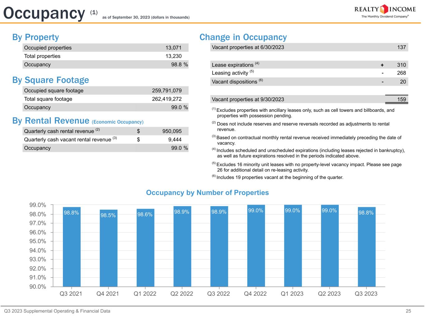 Q3 2023 Supplemental Operating & Financial Data 25 By Property Occupied properties 13,071 Total properties 13,230 Occupancy 98.8 % By Square Footage Occupied square footage 259,791,079 Total square footage 262,419,272 Occupancy 99.0 % By Rental Revenue (Economic Occupancy) Quarterly cash rental revenue (2) $ 950,095 Quarterly cash vacant rental revenue (3) $ 9,444 Occupancy 99.0 % Change in Occupancy Vacant properties at 6/30/2023   137 Lease expirations (4) + 310 Leasing activity (5) - 268 Vacant dispositions (6) - 20 Vacant properties at 9/30/2023   159 (1) Excludes properties with ancillary leases only, such as cell towers and billboards, and properties with possession pending. (2) Does not include reserves and reserve reversals recorded as adjustments to rental revenue. (3) Based on contractual monthly rental revenue received immediately preceding the date of vacancy. (4) Includes scheduled and unscheduled expirations (including leases rejected in bankruptcy), as well as future expirations resolved in the periods indicated above. (5) Excludes 16 minority unit leases with no property-level vacancy impact. Please see page 26 for additional detail on re-leasing activity. (6) Includes 19 properties vacant at the beginning of the quarter. Occupancy (1) as of September 30, 2023 (dollars in thousands) Occupancy by Number of Properties 98.8% 98.5% 98.6% 98.9% 98.9% 99.0% 99.0% 99.0% 98.8% Q3 2021 Q4 2021 Q1 2022 Q2 2022 Q3 2022 Q4 2022 Q1 2023 Q2 2023 Q3 2023 90.0% 91.0% 92.0% 93.0% 94.0% 95.0% 96.0% 97.0% 98.0% 99.0%