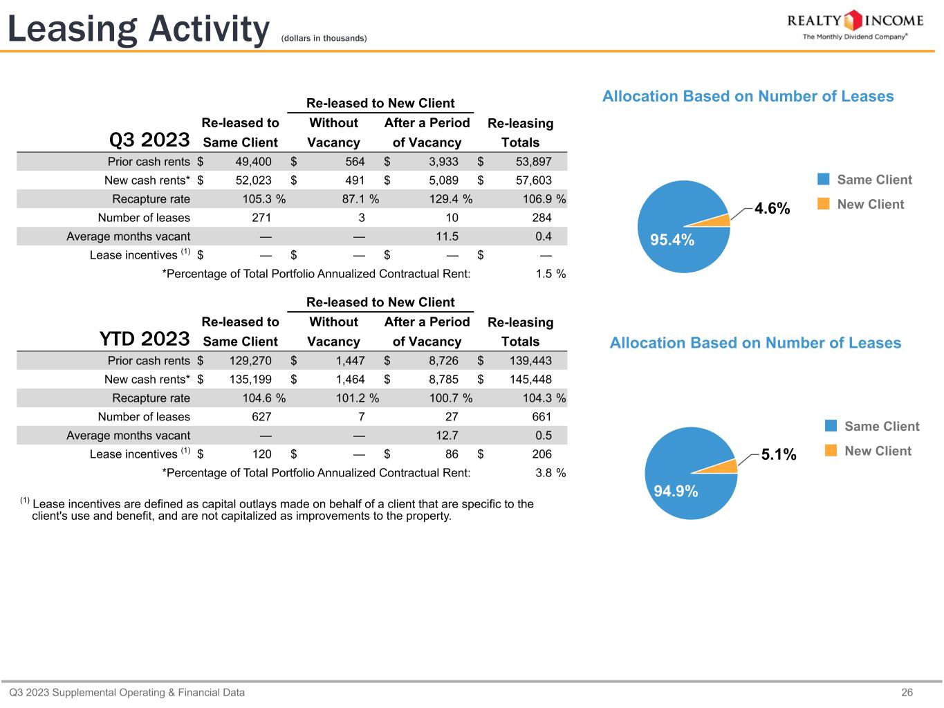 Q3 2023 Supplemental Operating & Financial Data 26 Leasing Activity (dollars in thousands) Q3 2023 Re-leased to New Client Re-leased to Without After a Period Re-leasing Same Client Vacancy of Vacancy Totals Prior cash rents $ 49,400 $ 564 $ 3,933 $ 53,897 New cash rents* $ 52,023 $ 491 $ 5,089 $ 57,603 Recapture rate 105.3 % 87.1 % 129.4 % 106.9 % Number of leases 271 3 10 284 Average months vacant — — 11.5 0.4 Lease incentives (1) $ — $ — $ — $ — *Percentage of Total Portfolio Annualized Contractual Rent: 1.5 % (1) Lease incentives are defined as capital outlays made on behalf of a client that are specific to the client's use and benefit, and are not capitalized as improvements to the property. YTD 2023 Re-leased to New Client Re-leased to Without After a Period Re-leasing Same Client Vacancy of Vacancy Totals Prior cash rents $ 129,270 $ 1,447 $ 8,726 $ 139,443 New cash rents* $ 135,199 $ 1,464 $ 8,785 $ 145,448 Recapture rate 104.6 % 101.2 % 100.7 % 104.3 % Number of leases 627 7 27 661 Average months vacant — — 12.7 0.5 Lease incentives (1) $ 120 $ — $ 86 $ 206 *Percentage of Total Portfolio Annualized Contractual Rent: 3.8 % Allocation Based on Number of Leases 95.4% 4.6% Same Client New Client Allocation Based on Number of Leases 94.9% 5.1% Same Client New Client