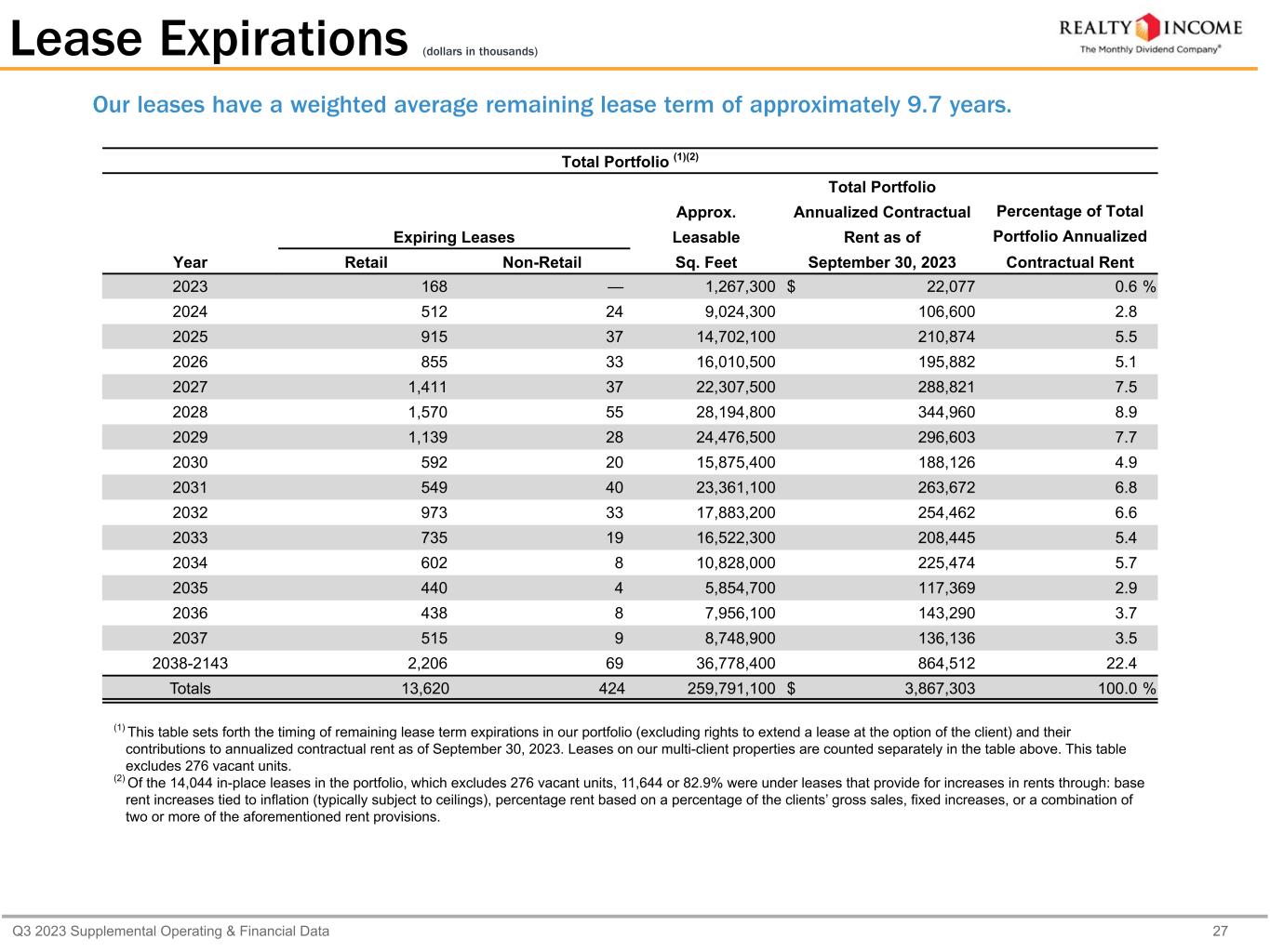 Q3 2023 Supplemental Operating & Financial Data 27 (1) This table sets forth the timing of remaining lease term expirations in our portfolio (excluding rights to extend a lease at the option of the client) and their contributions to annualized contractual rent as of September 30, 2023. Leases on our multi-client properties are counted separately in the table above. This table excludes 276 vacant units. (2) Of the 14,044 in-place leases in the portfolio, which excludes 276 vacant units, 11,644 or 82.9% were under leases that provide for increases in rents through: base rent increases tied to inflation (typically subject to ceilings), percentage rent based on a percentage of the clients’ gross sales, fixed increases, or a combination of two or more of the aforementioned rent provisions. Our leases have a weighted average remaining lease term of approximately 9.7 years. Lease Expirations (dollars in thousands) Total Portfolio (1)(2) Total Portfolio Approx. Annualized Contractual Percentage of Total Expiring Leases Leasable Rent as of Portfolio Annualized Year Retail Non-Retail Sq. Feet September 30, 2023 Contractual Rent 2023 168 — 1,267,300 $ 22,077 0.6 % 2024 512 24 9,024,300 106,600 2.8 2025 915 37 14,702,100 210,874 5.5 2026 855 33 16,010,500 195,882 5.1 2027 1,411 37 22,307,500 288,821 7.5 2028 1,570 55 28,194,800 344,960 8.9 2029 1,139 28 24,476,500 296,603 7.7 2030 592 20 15,875,400 188,126 4.9 2031 549 40 23,361,100 263,672 6.8 2032 973 33 17,883,200 254,462 6.6 2033 735 19 16,522,300 208,445 5.4 2034 602 8 10,828,000 225,474 5.7 2035 440 4 5,854,700 117,369 2.9 2036 438 8 7,956,100 143,290 3.7 2037 515 9 8,748,900 136,136 3.5 2038-2143 2,206 69 36,778,400 864,512 22.4 Totals 13,620 424 259,791,100 $ 3,867,303 100.0 %